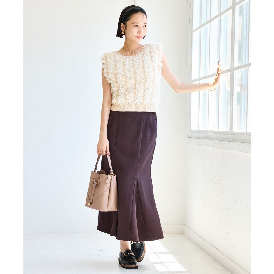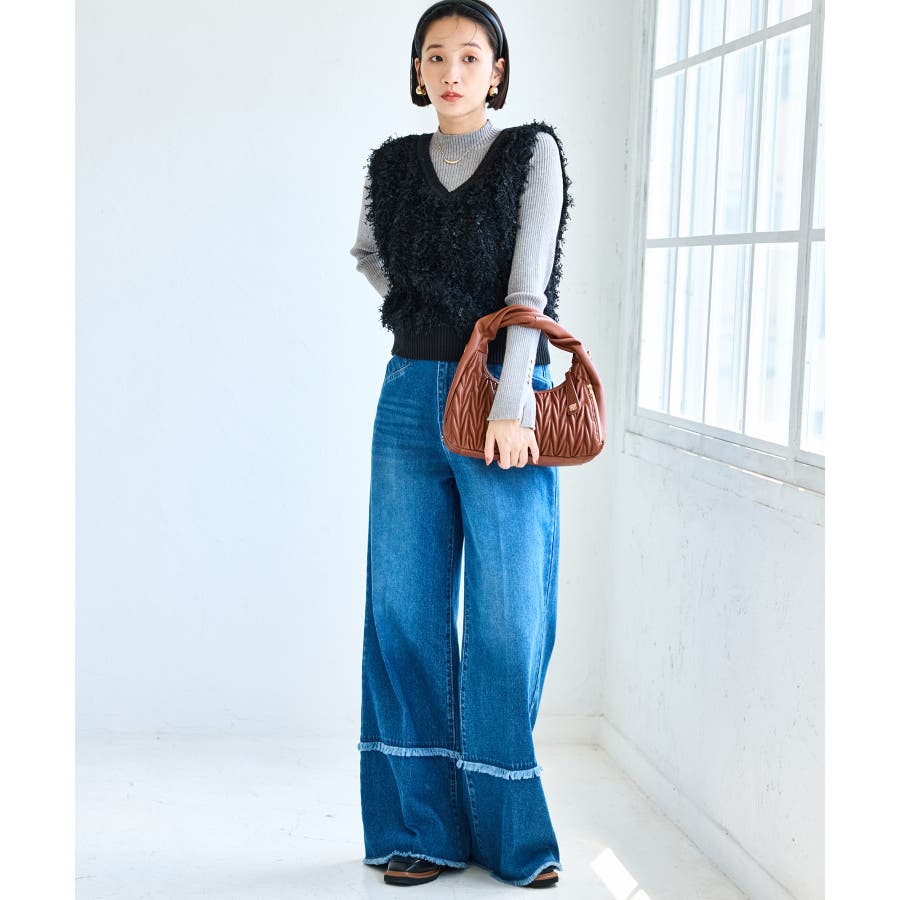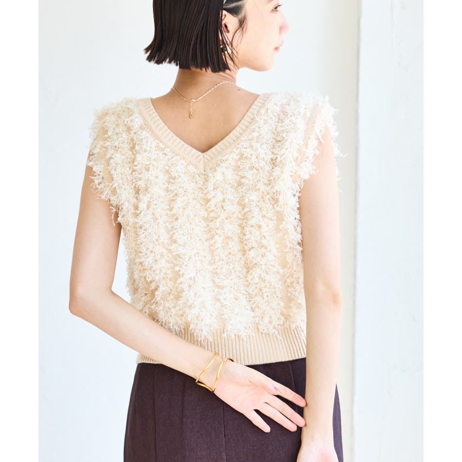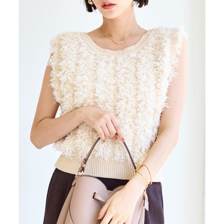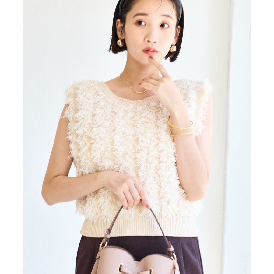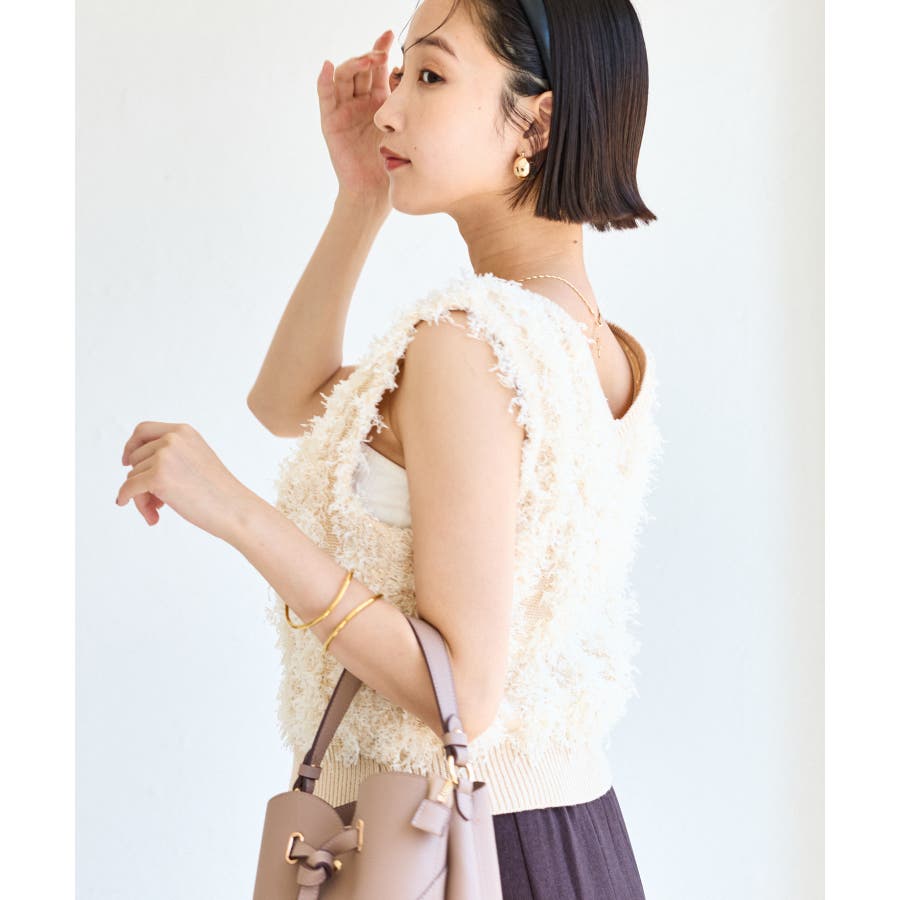 フリンジ部分は2素材使い華やかな印象に仕上げています。小さめのスパンコール入りで華やかさをさりげなく添えつつ、普段使いしやすい落ち着いた輝きが魅力。いつもの着こなしにレイヤードするだけで、こなれた印象に。前後2WAYで気分やコーディネートに合わせて変えて着用いただけます。