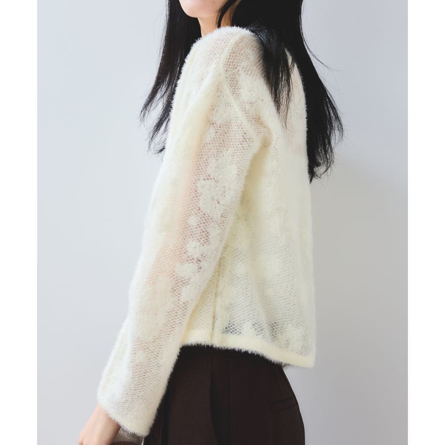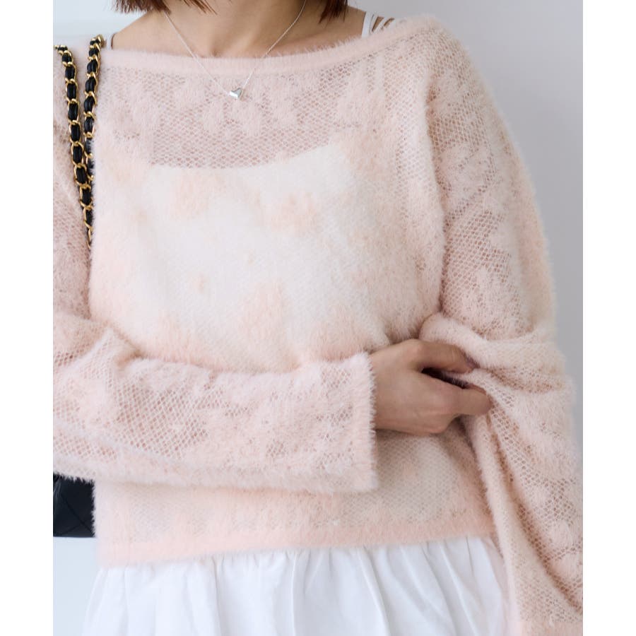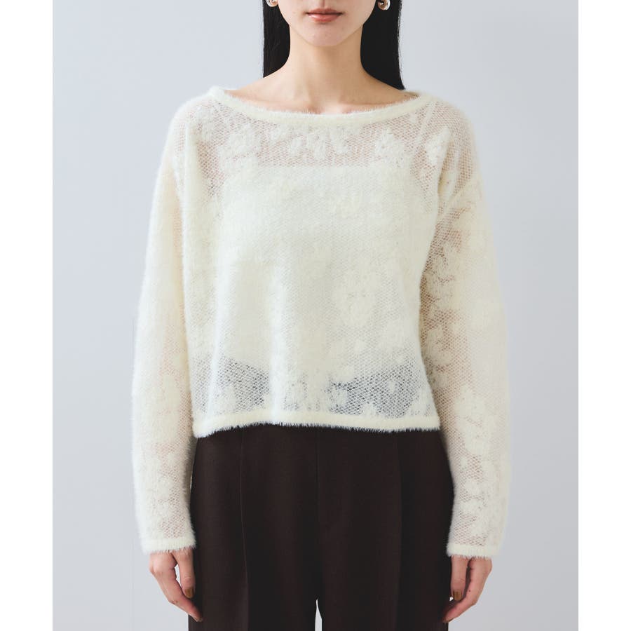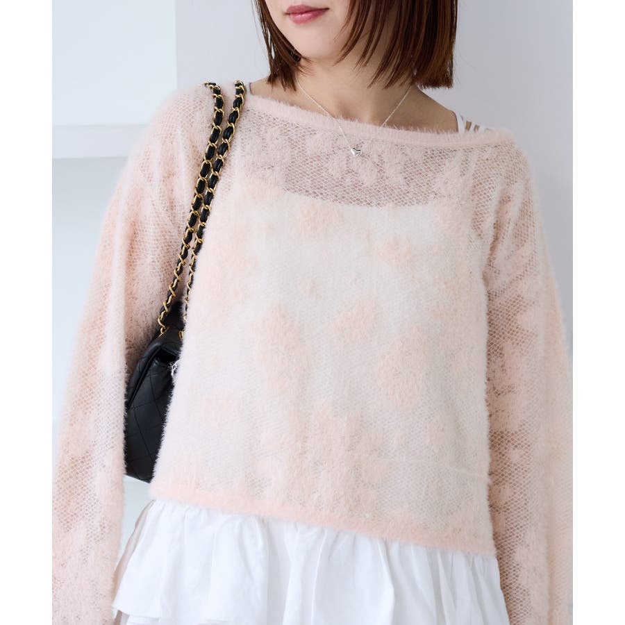 ぼかしたフラワーモチーフと細かいメッシュ編みにやわらかいフェザーを使用しています。
