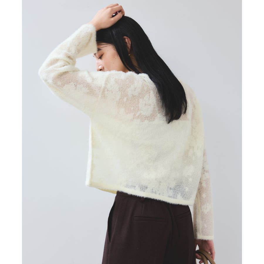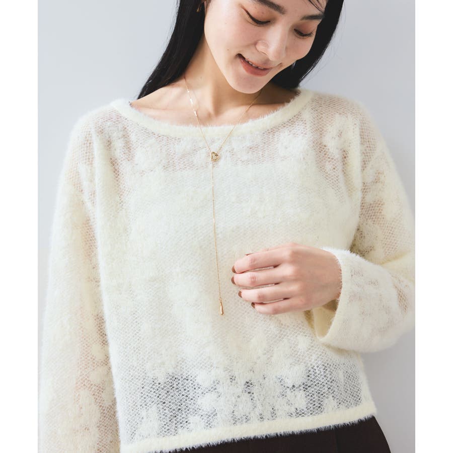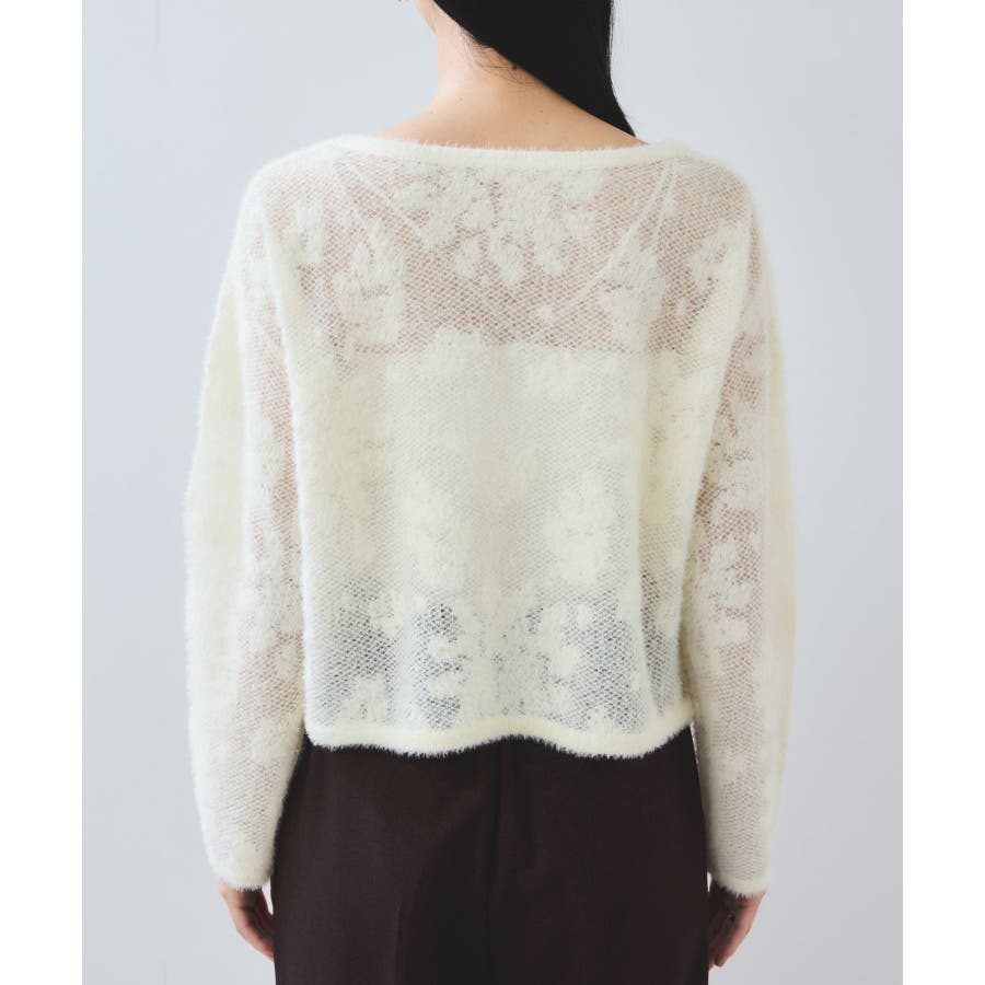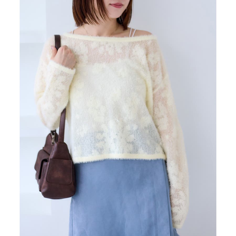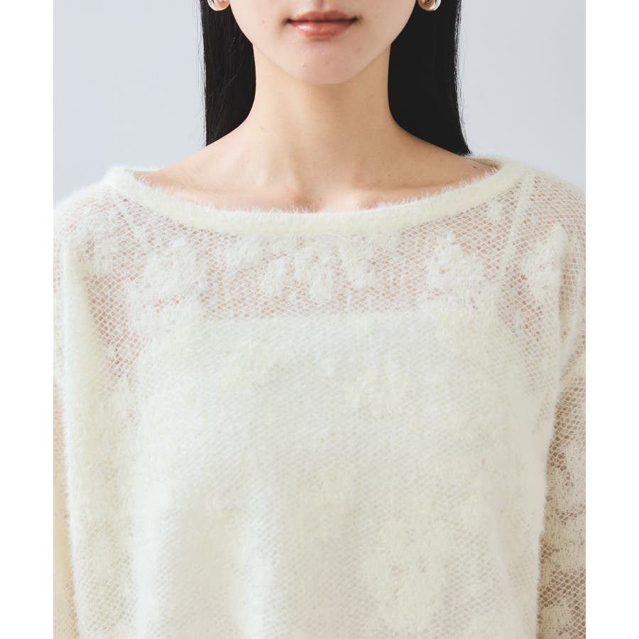 ぼかしたフラワーモチーフと細かいメッシュ編みにやわらかいフェザーを使用しています。
