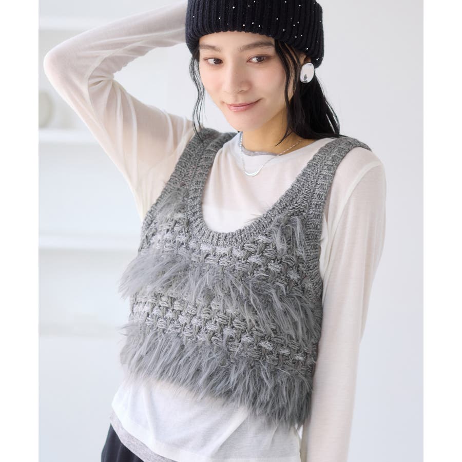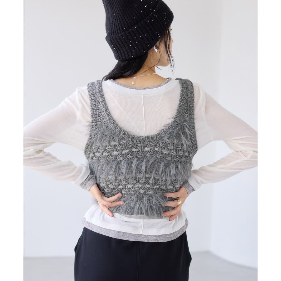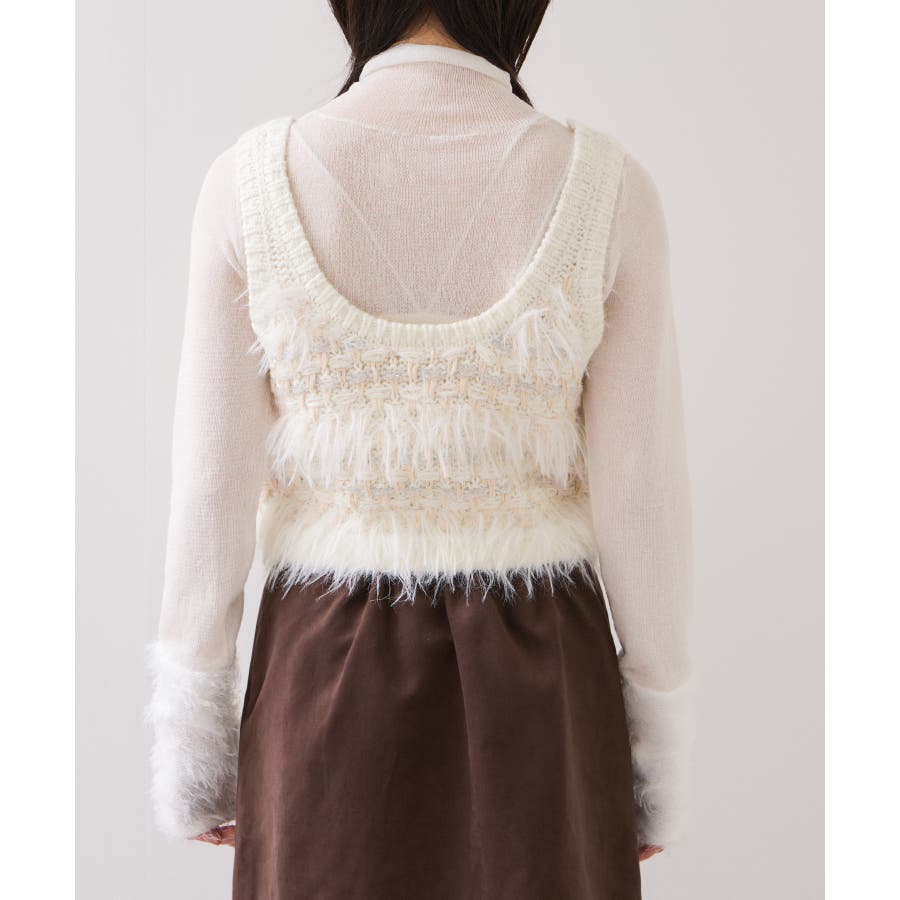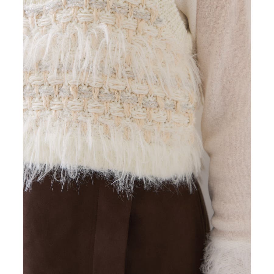 フェザーヤーン、スラブヤーン、ロービングヤーン、ラメ糸などの4種類の糸をツイード調に編み込んだローゲージニットビスチェです。