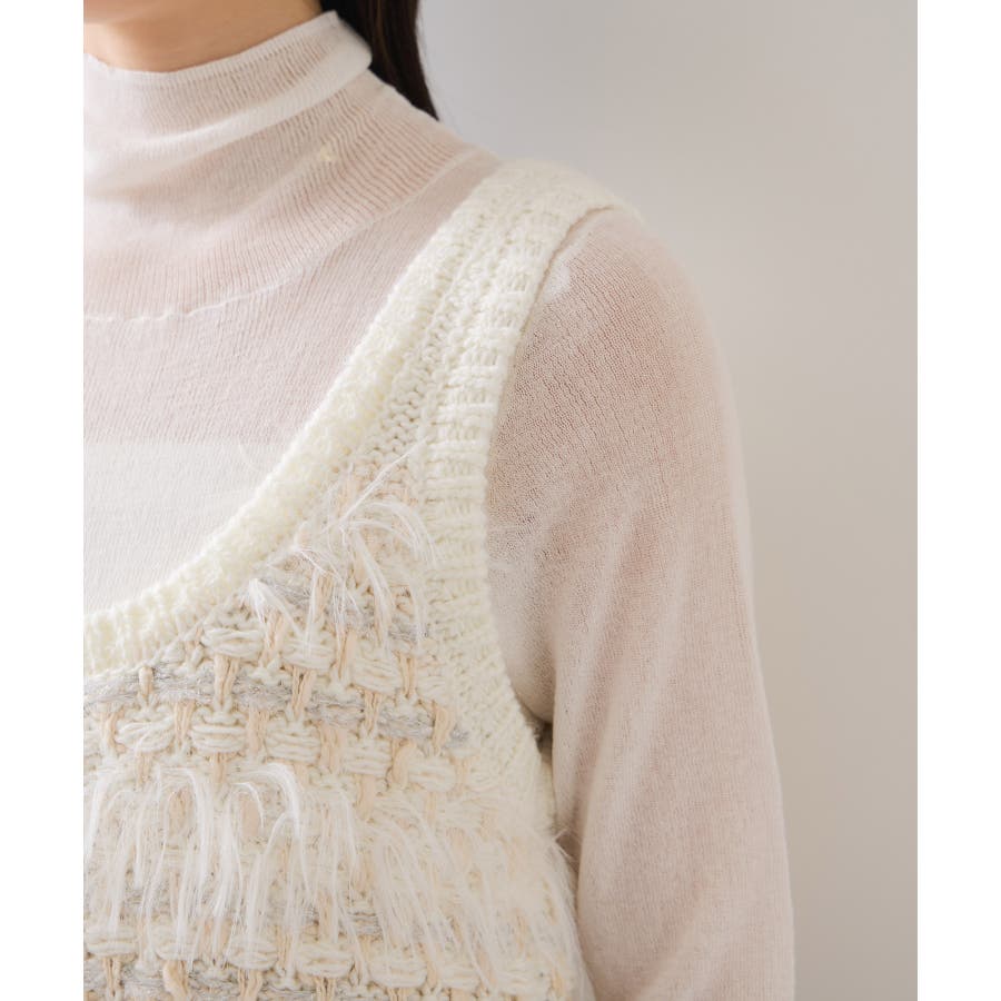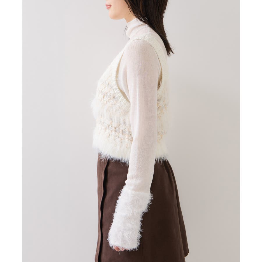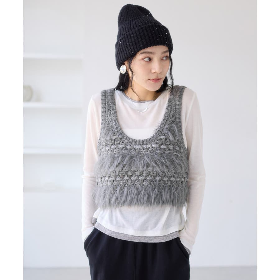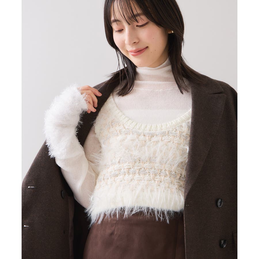 フェザーヤーン、スラブヤーン、ロービングヤーン、ラメ糸などの4種類の糸をツイード調に編み込んだローゲージニットビスチェです。