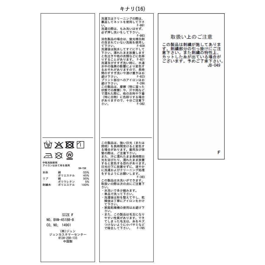キナリ(16):(本体) 綿 55% ポリエステル 45% (リブ) 綿 95% ポリウレタン 5% (刺繍糸) ポリエステル 100%