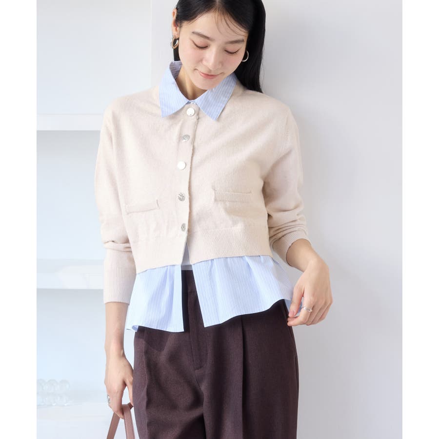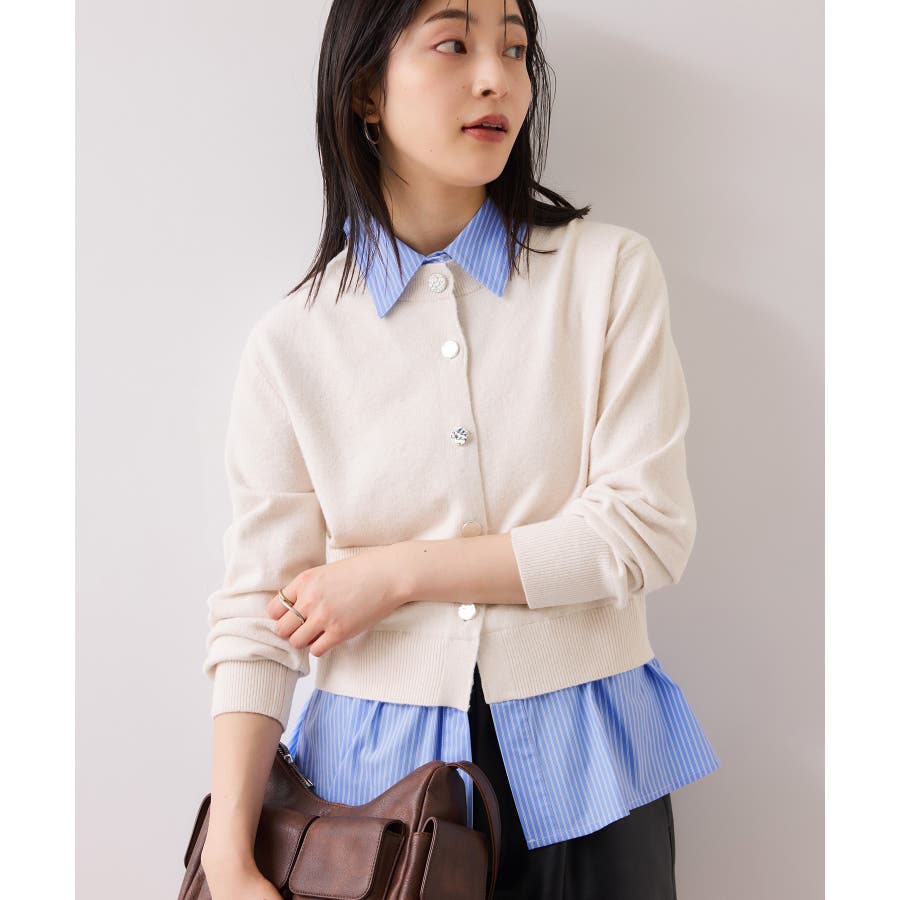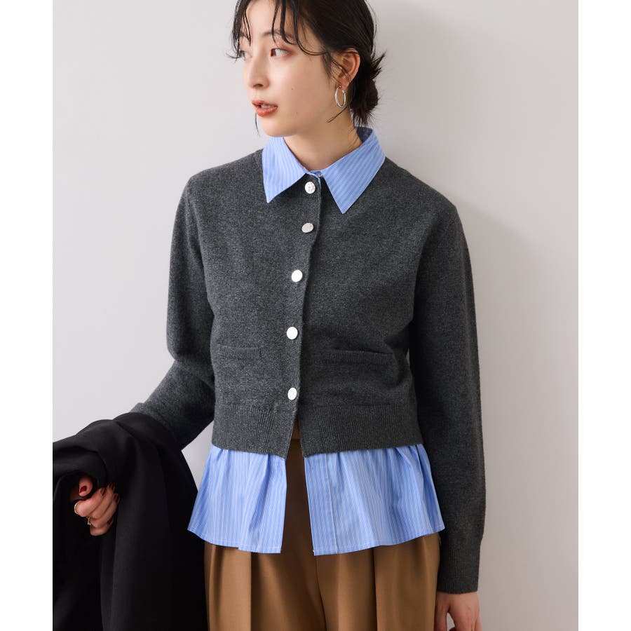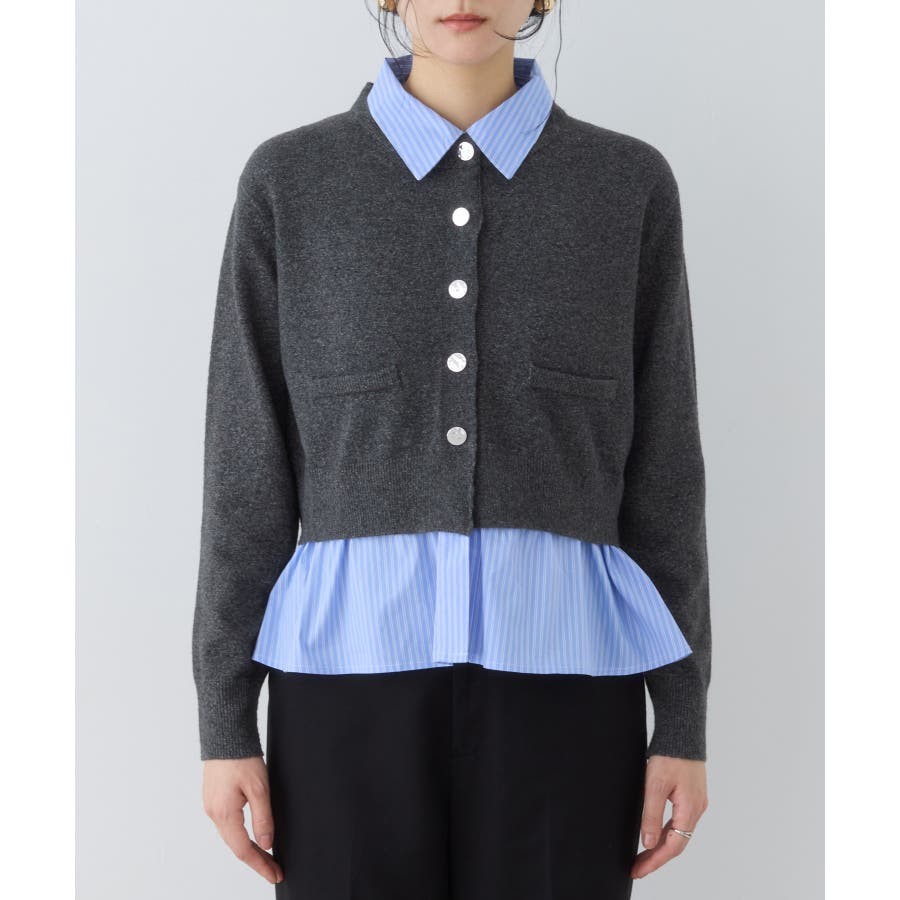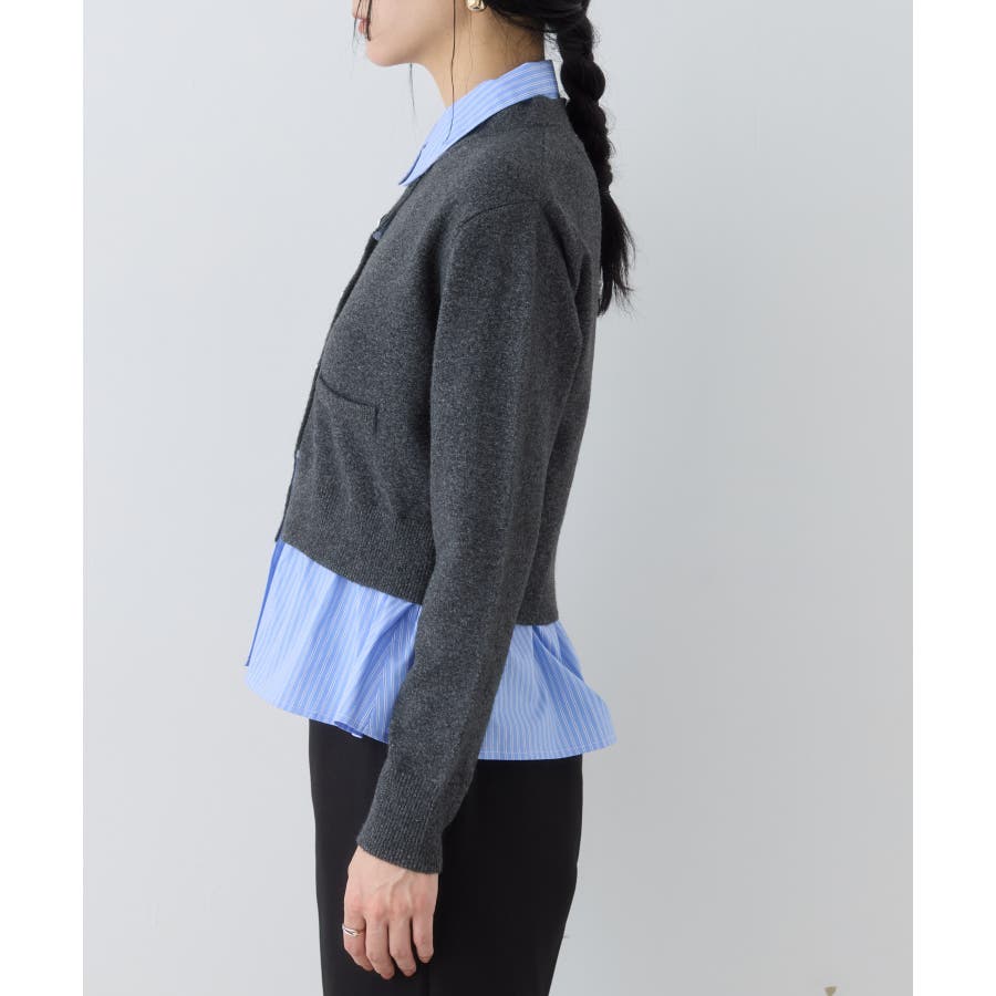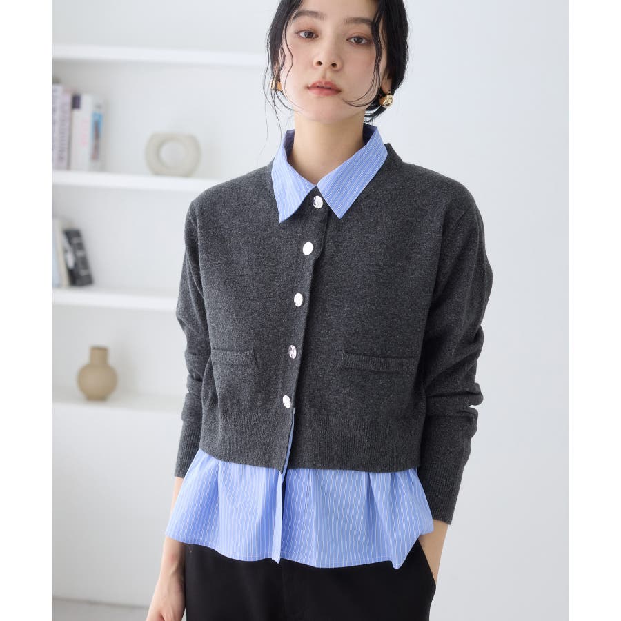 コンパクトシルエットのカーディガンにシャツをレイヤードしたデザインが1枚で完成されるニットトップス。
