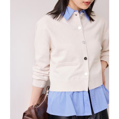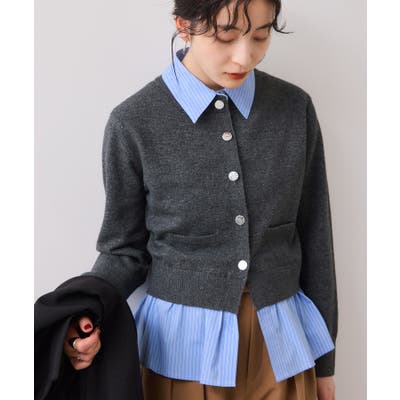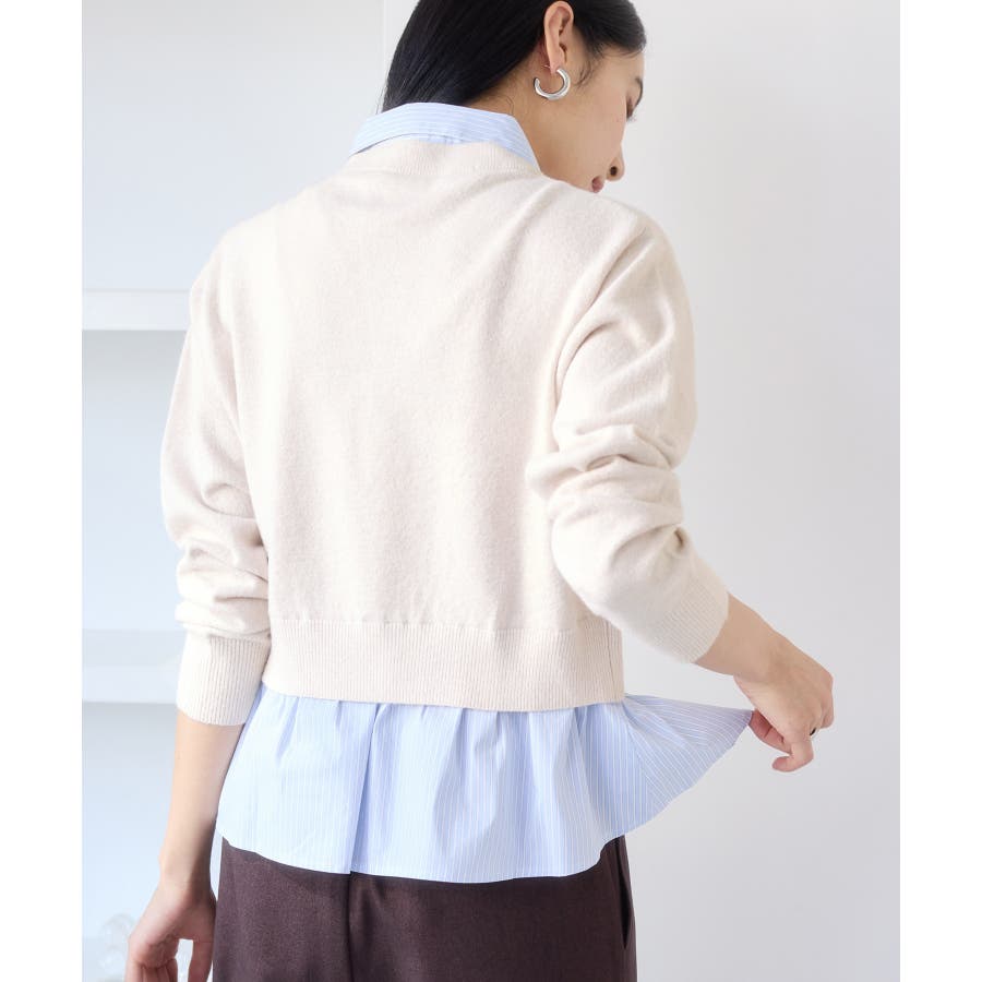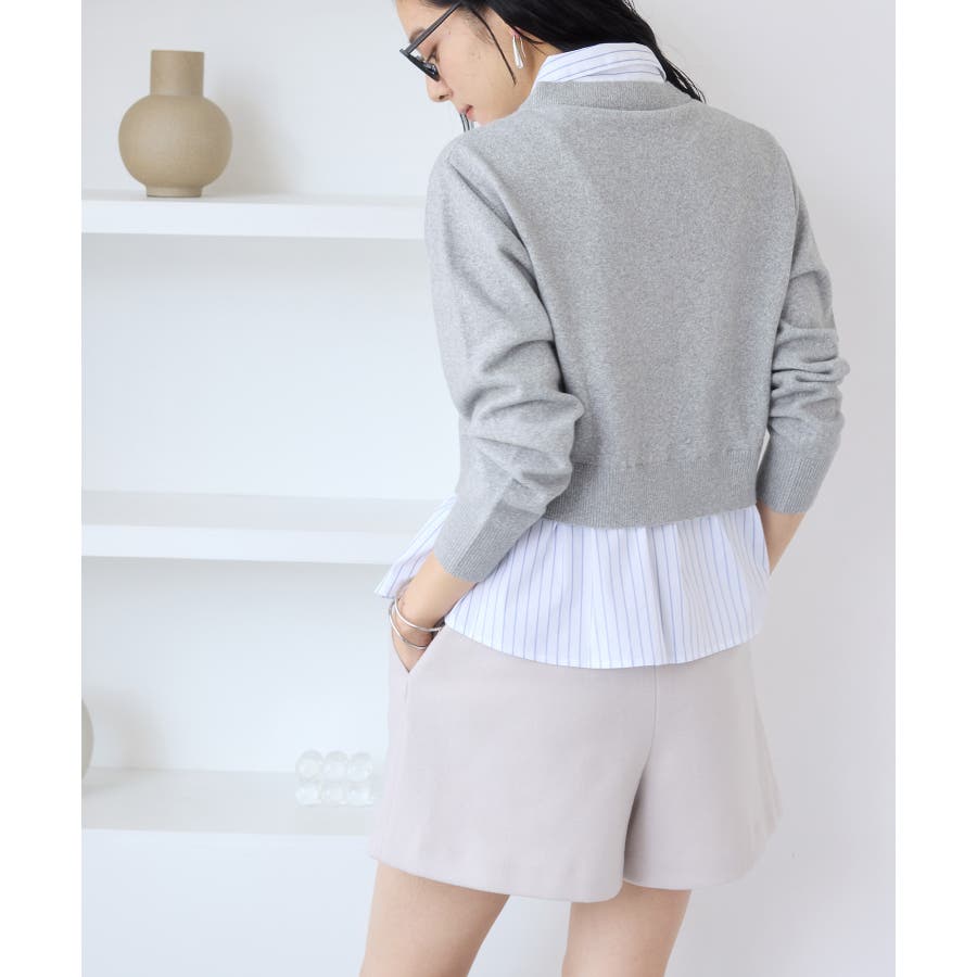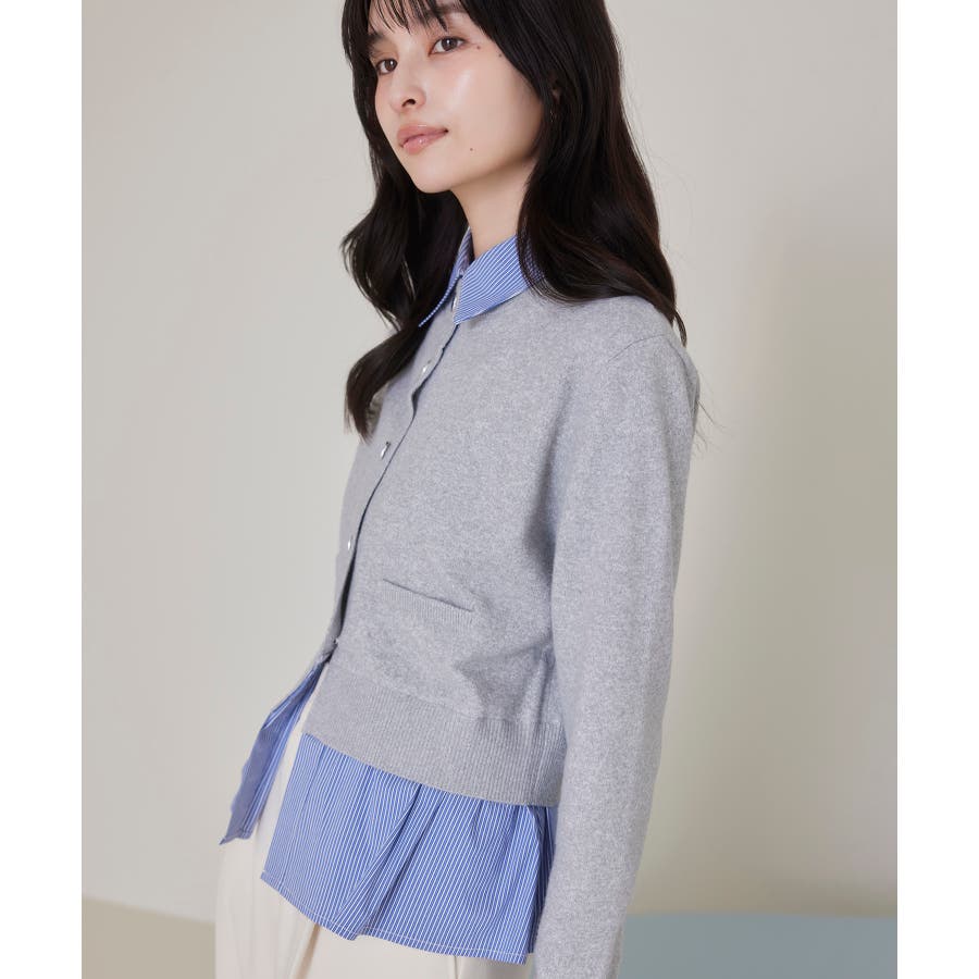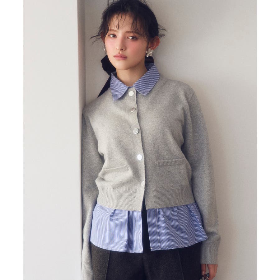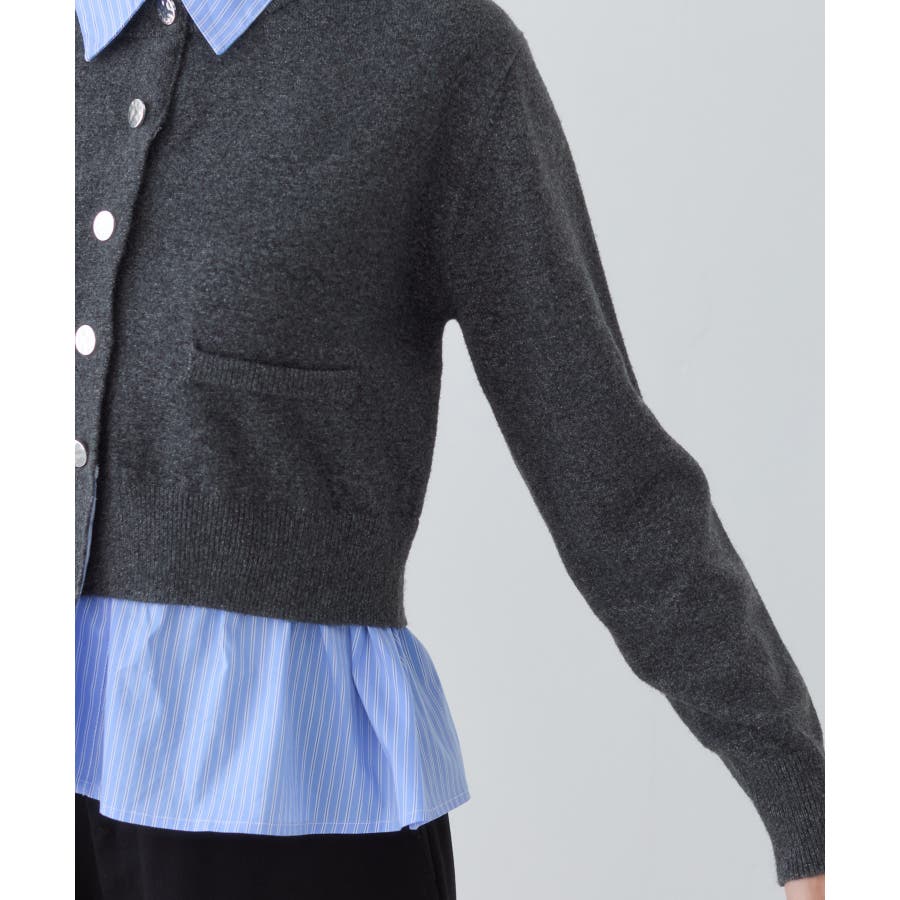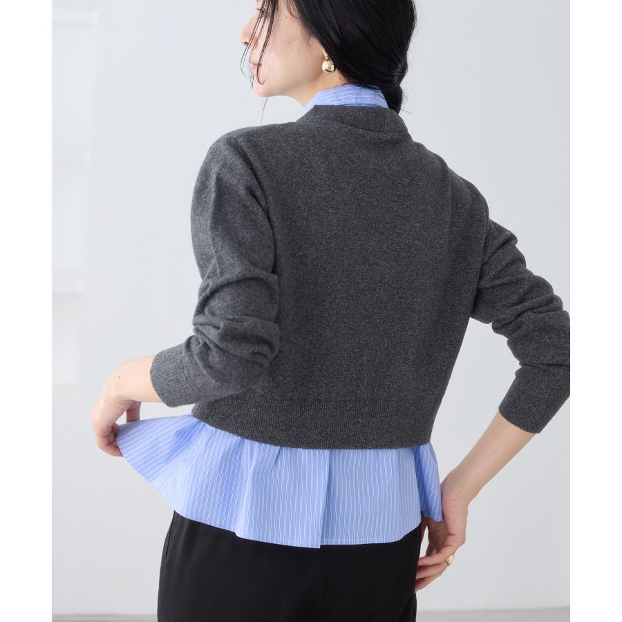 コンパクトシルエットのカーディガンにシャツをレイヤードしたデザインが1枚で完成されるニットトップス。