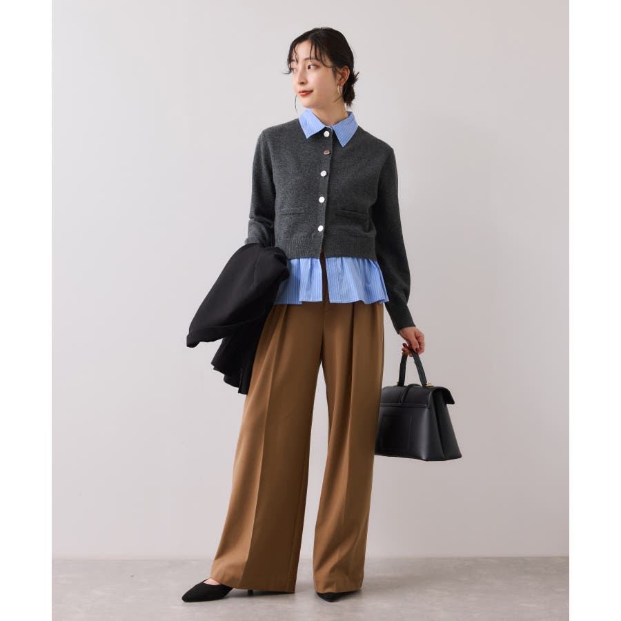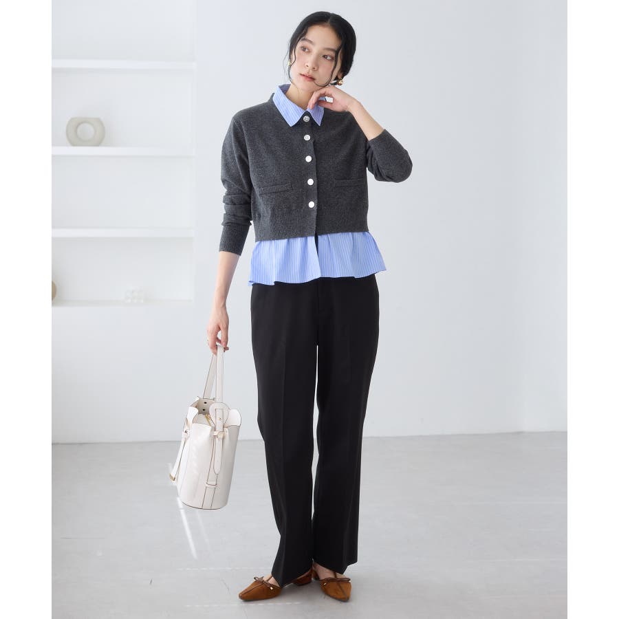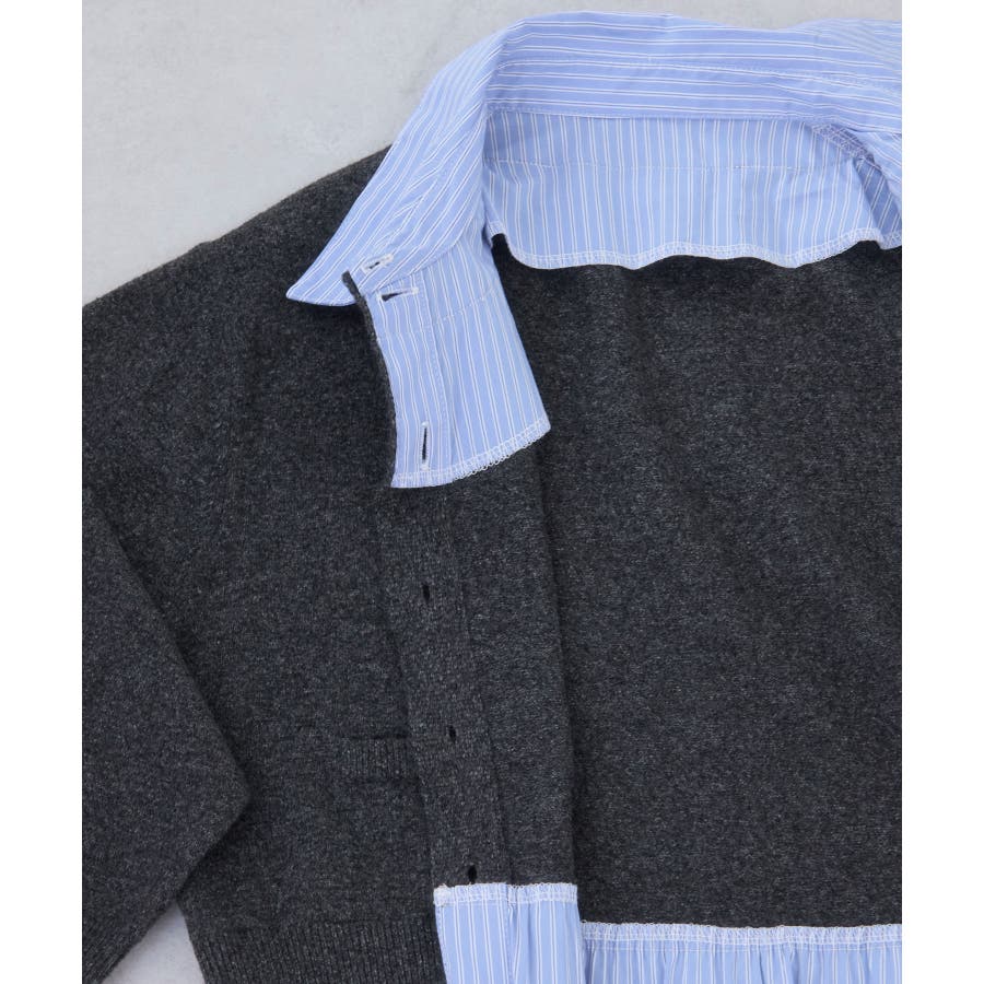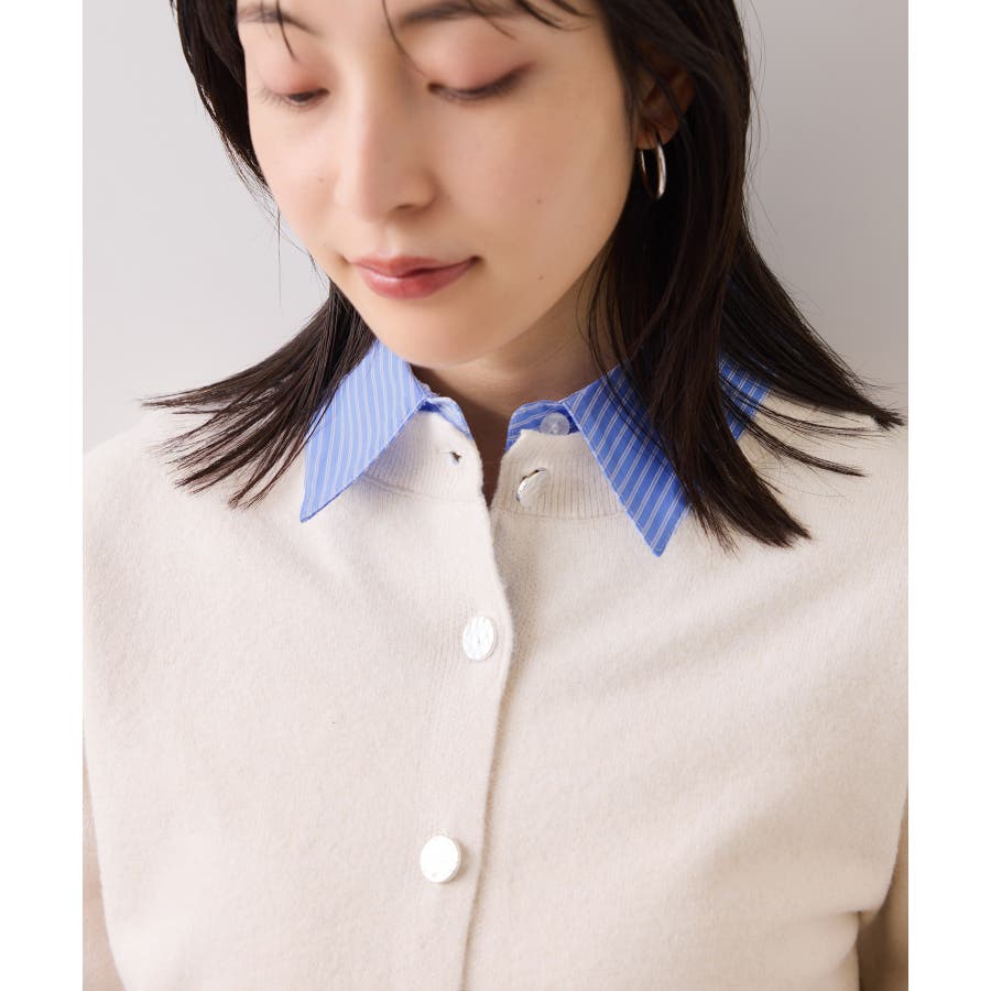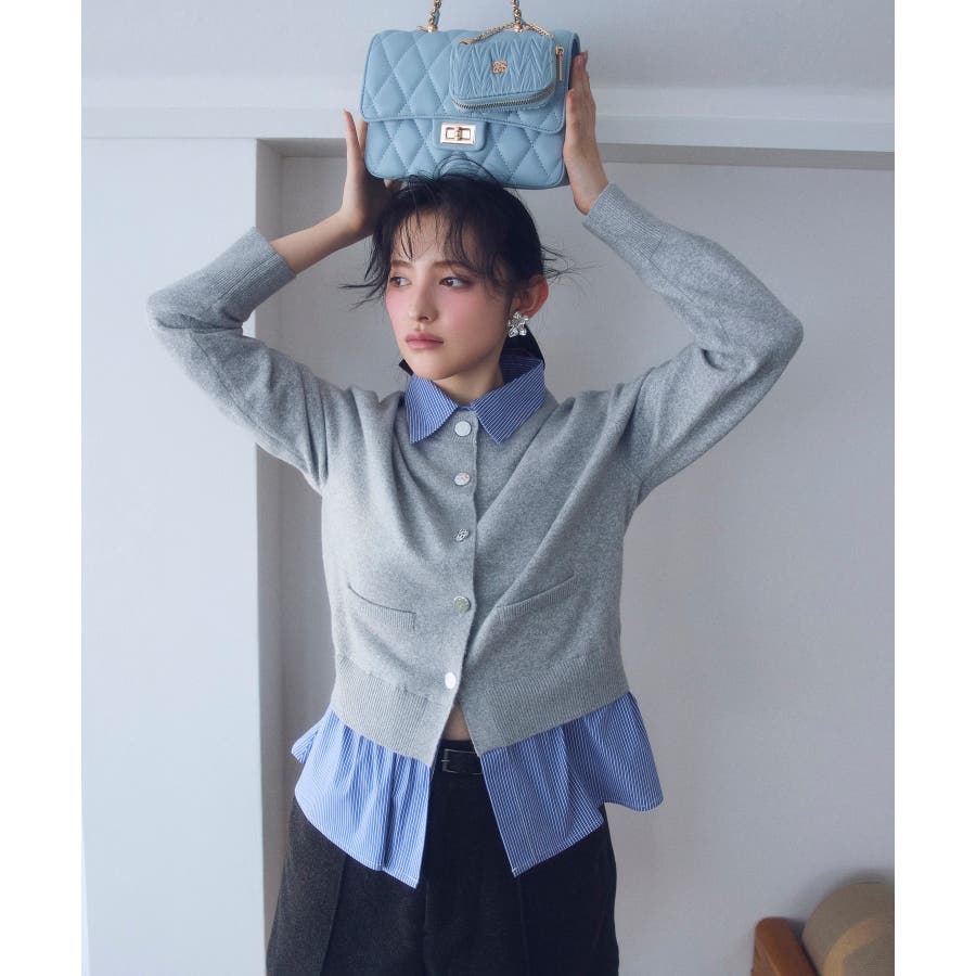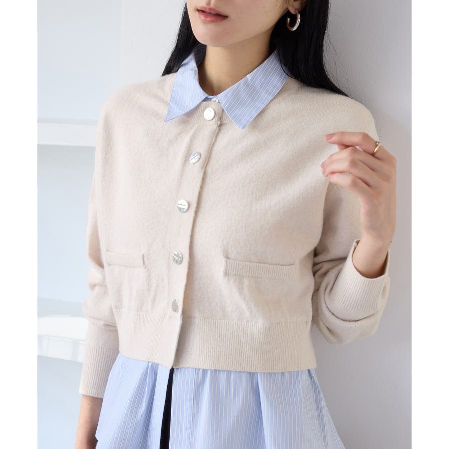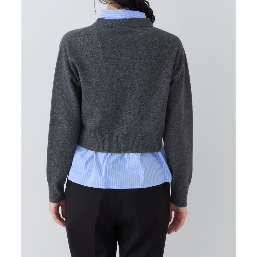 コンパクトシルエットのカーディガンにシャツをレイヤードしたデザインが1枚で完成されるニットトップス。