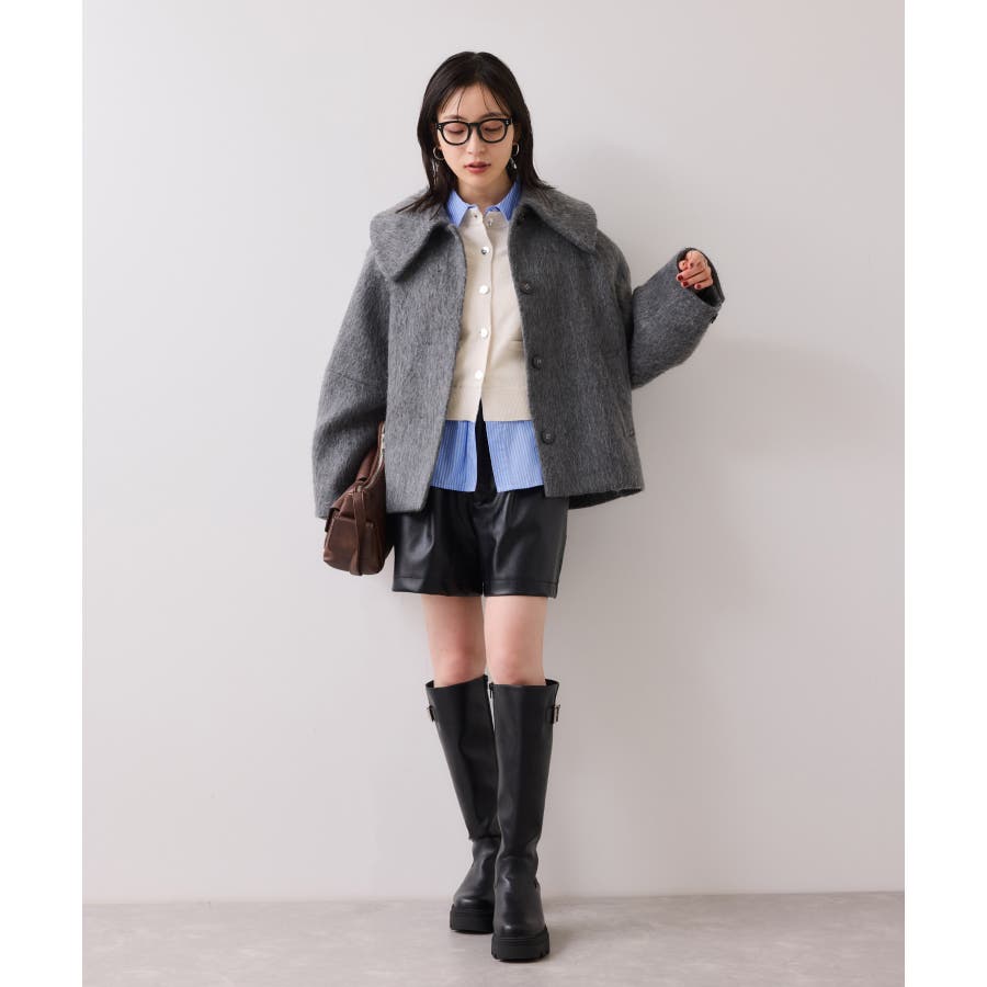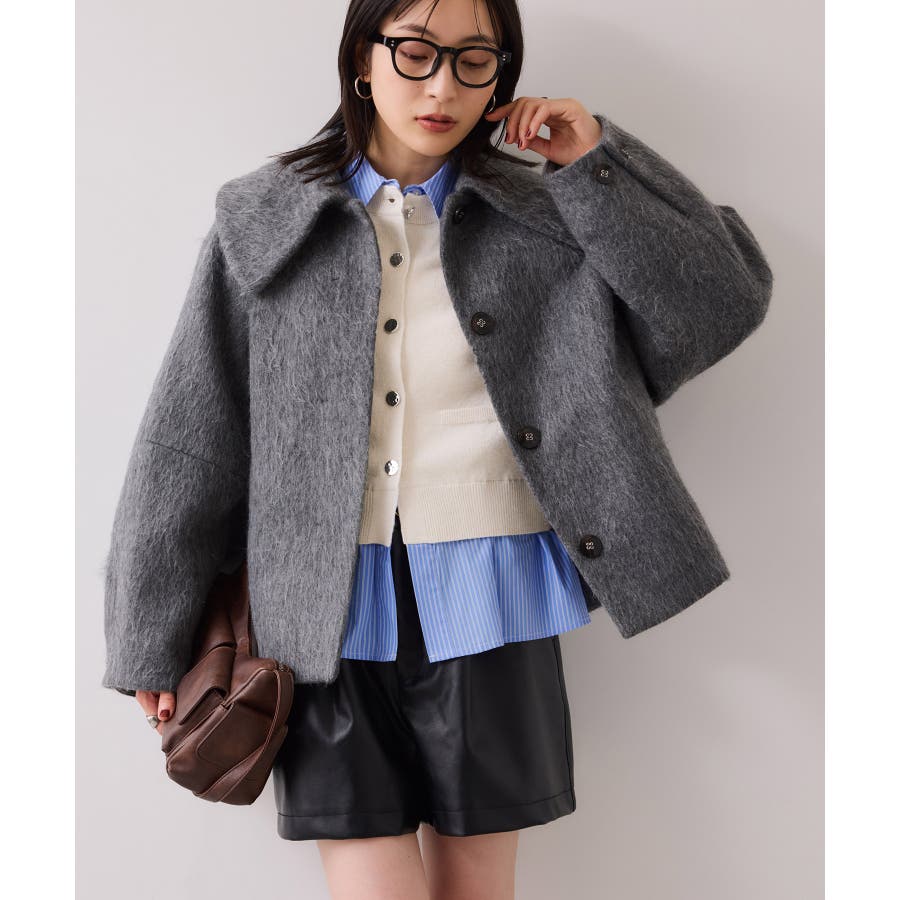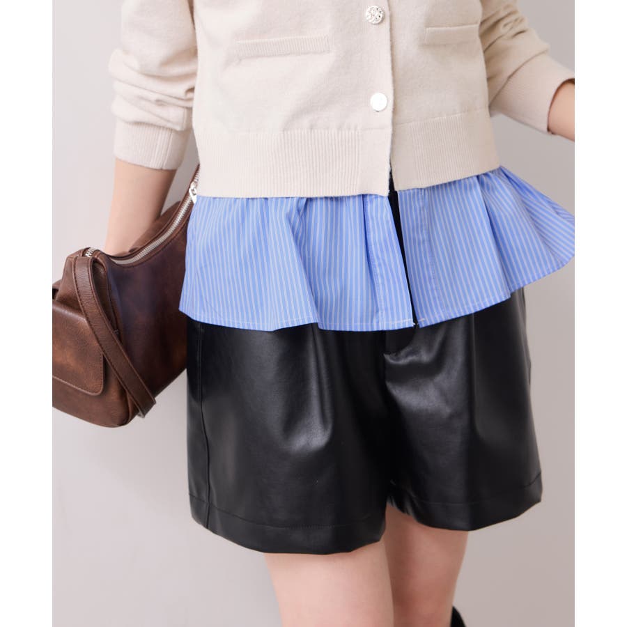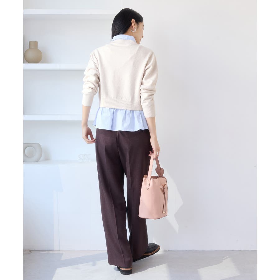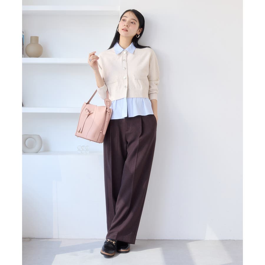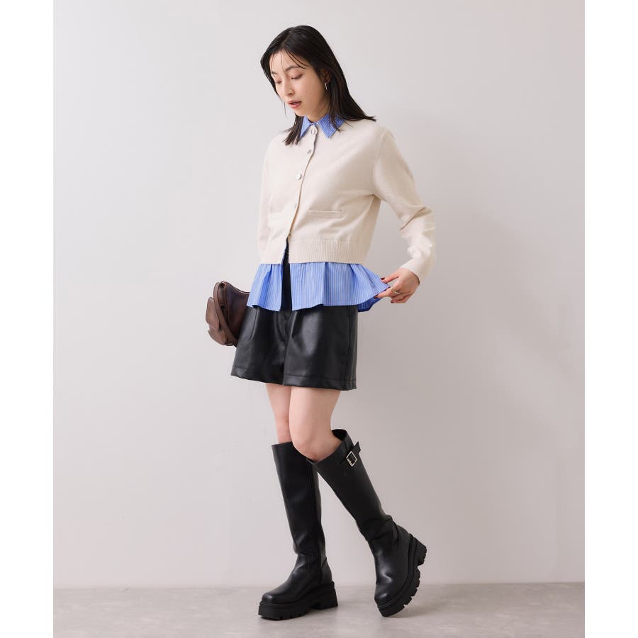 コンパクトシルエットのカーディガンにシャツをレイヤードしたデザインが1枚で完成されるニットトップス。