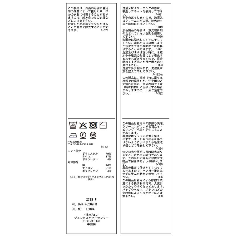 | 素材 | (ニット部分) ポリエステル 79% ナイロン 17% ポリウレタン 4% (布帛部分) 綿 76% ナイロン 21% ポリウレタン 3% |