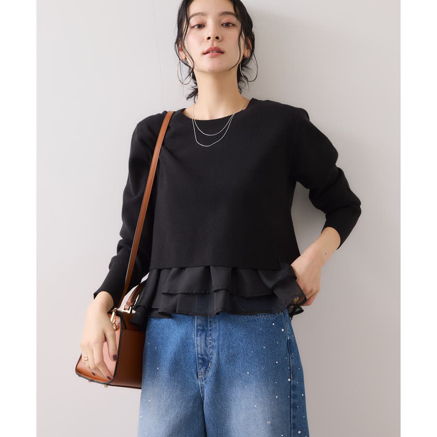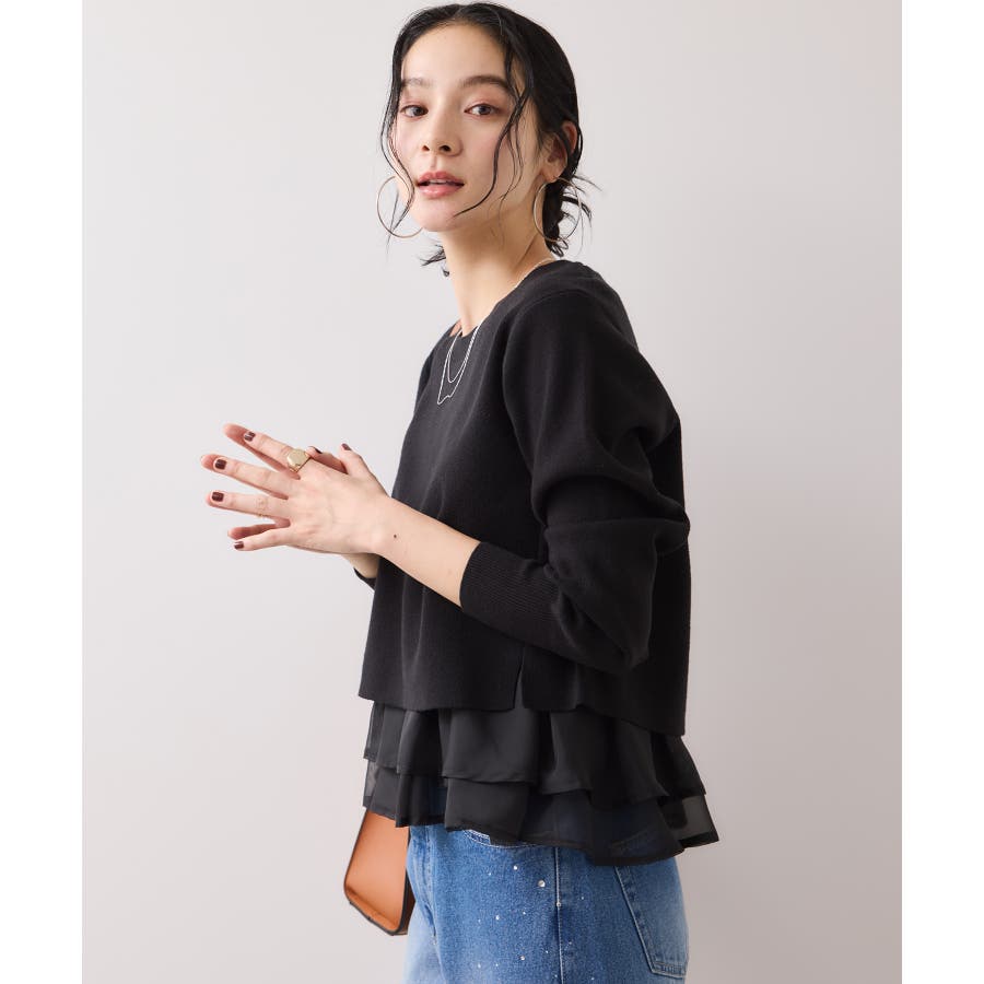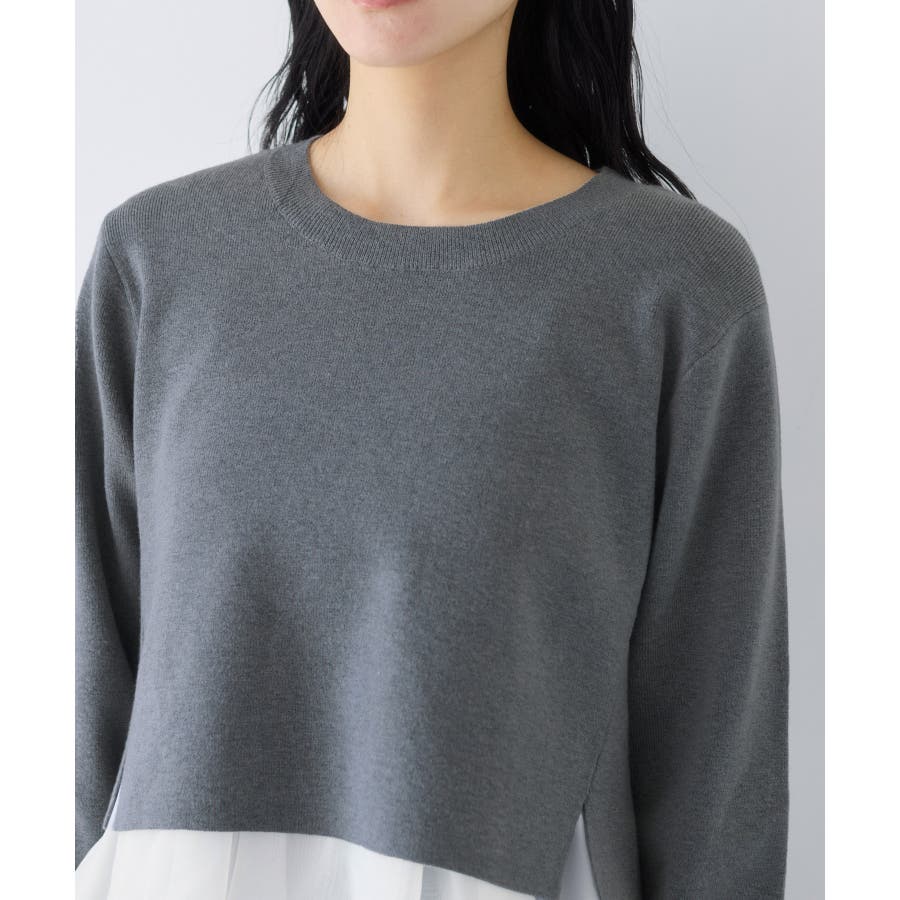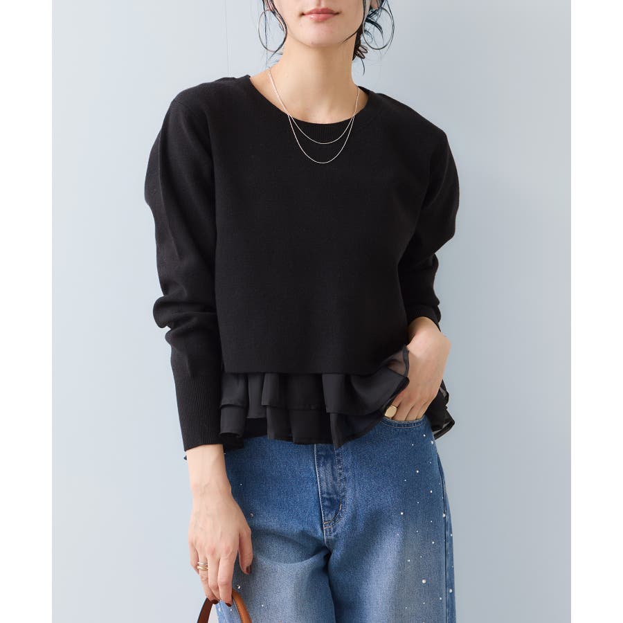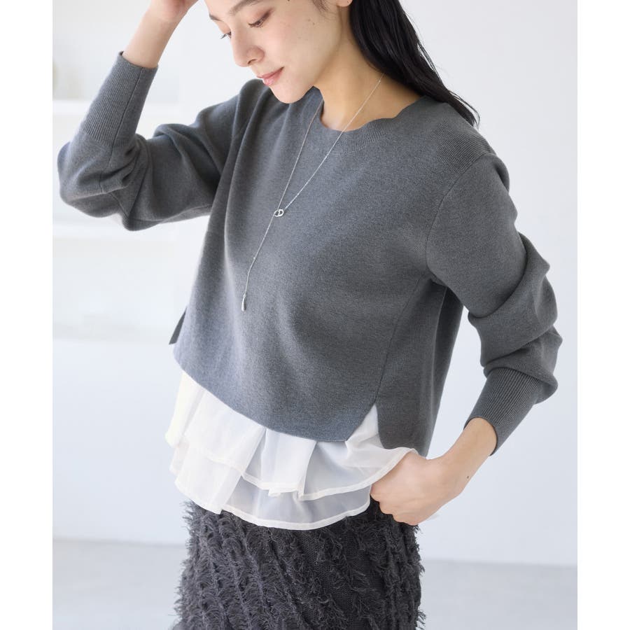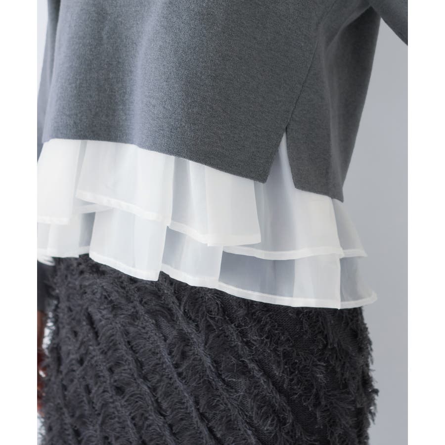 ・裾からオーガンジーペプラムが見えているドッキングニット
