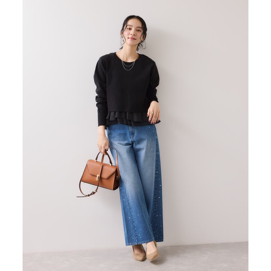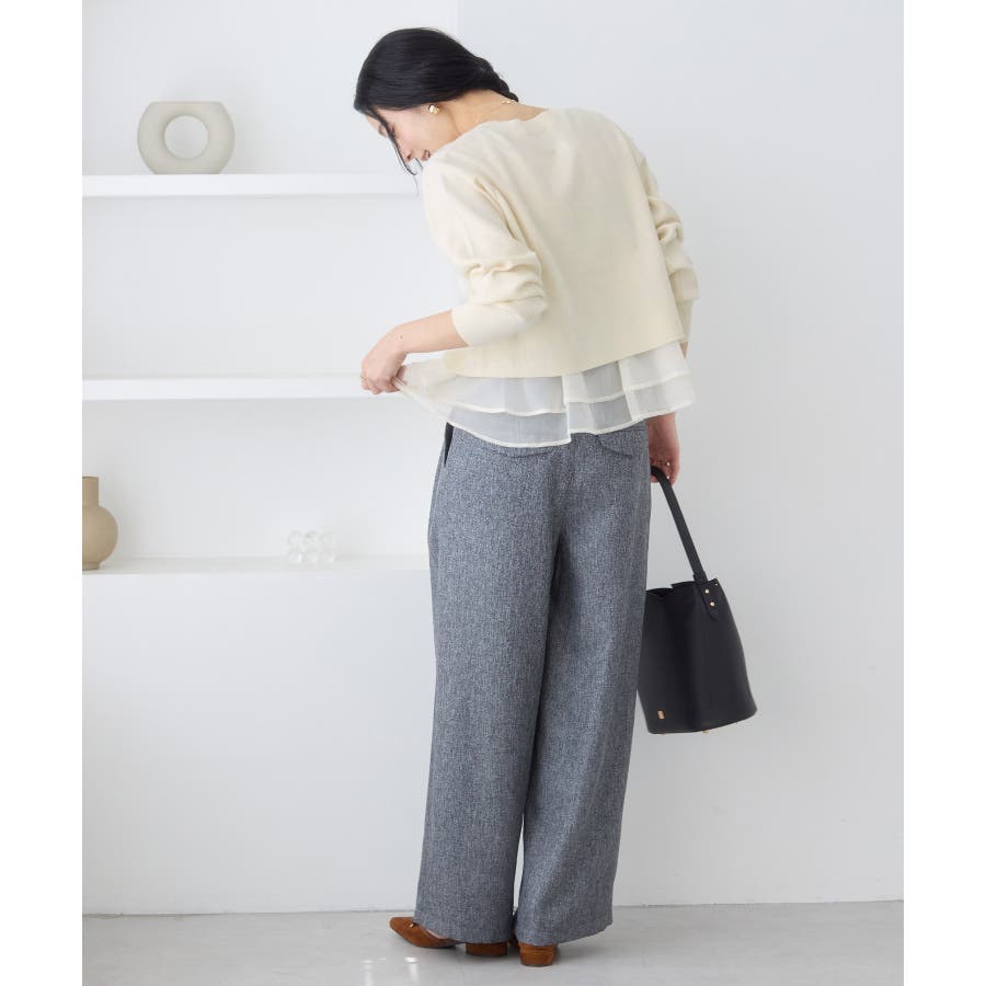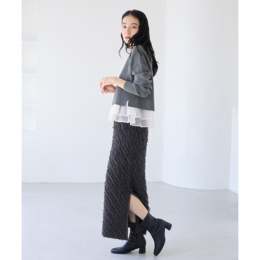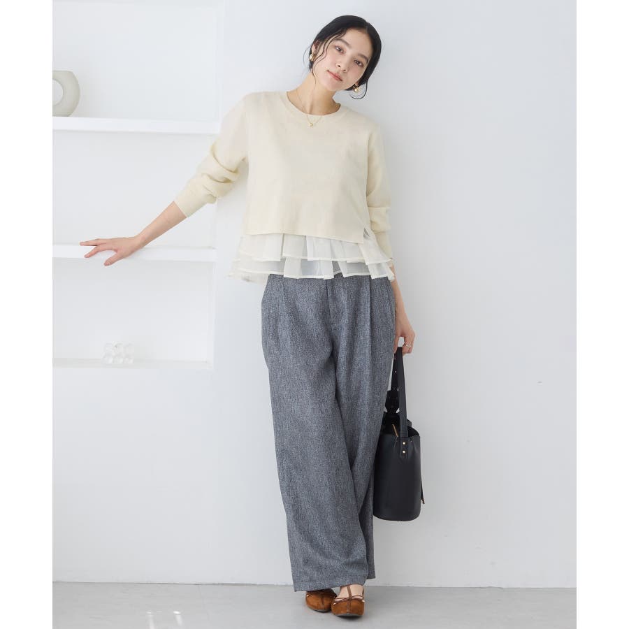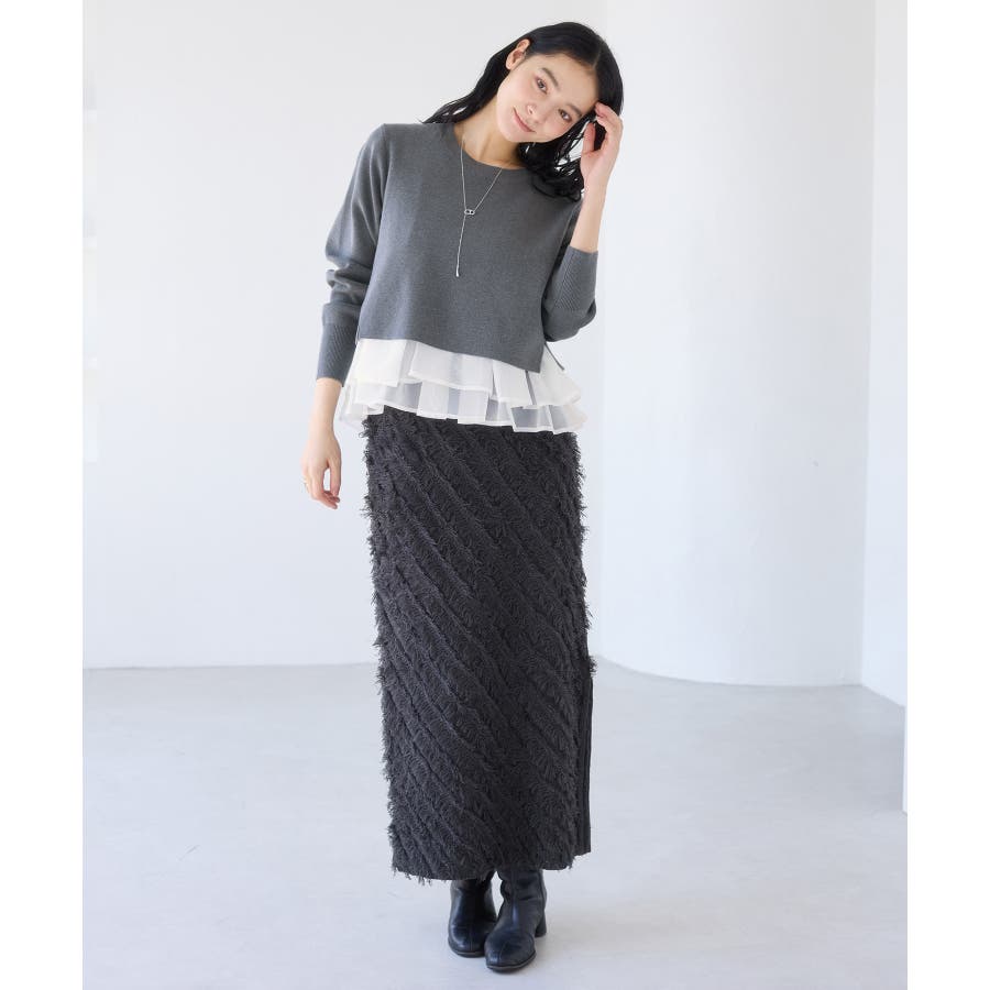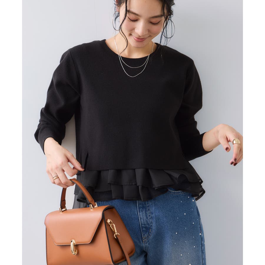 ・裾からオーガンジーペプラムが見えているドッキングニット