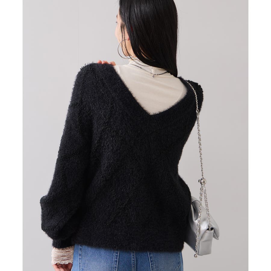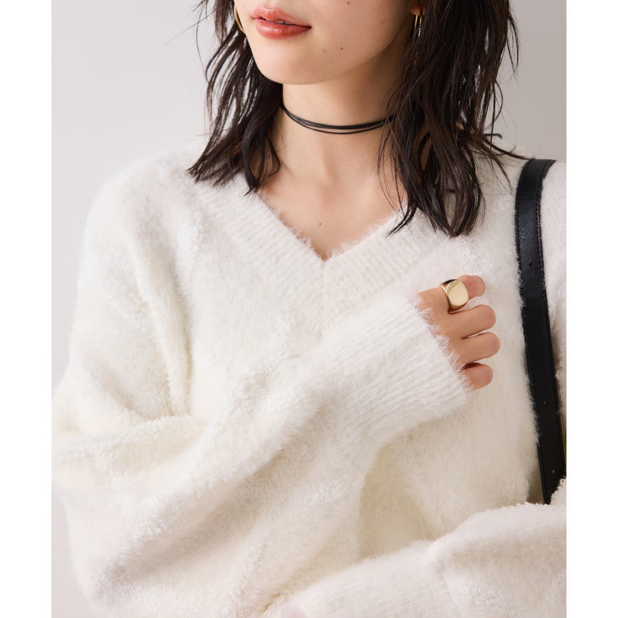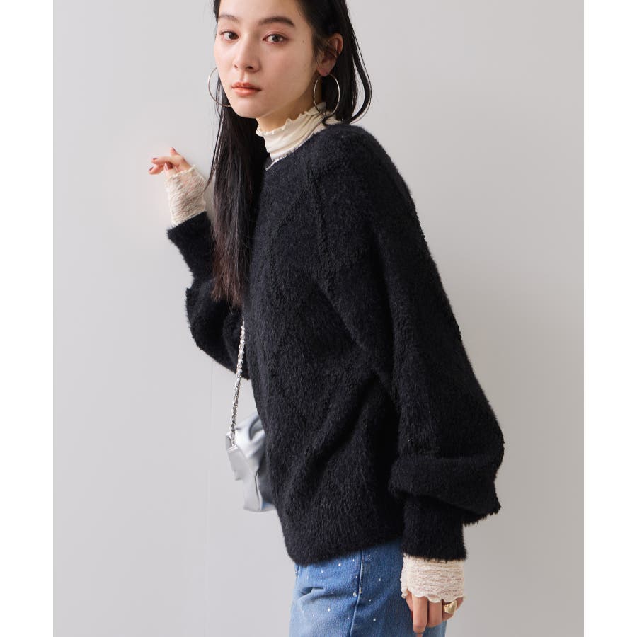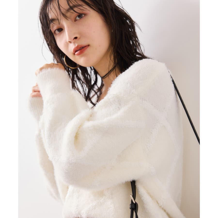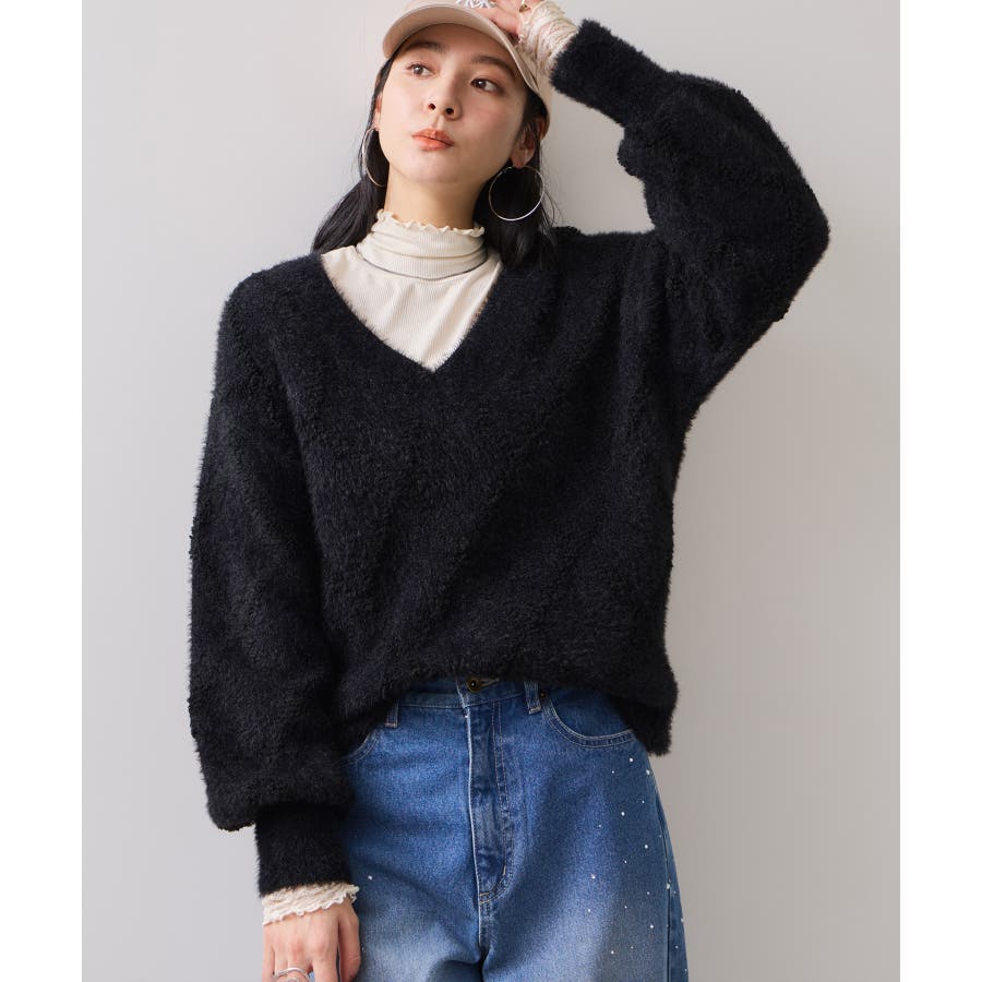 柄が同色系でさり気ないので着やすいアイテムです。Vネックとクルーネックの前後2WAYで着ることが出来て、ぽわんとした袖感もモテ要素があって可愛い1枚。