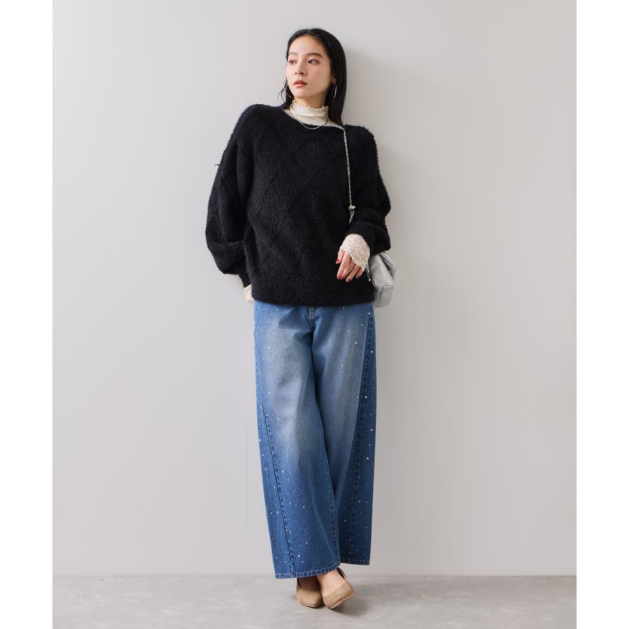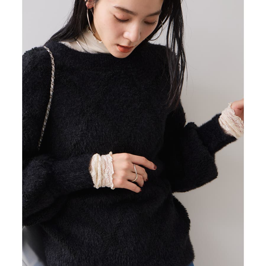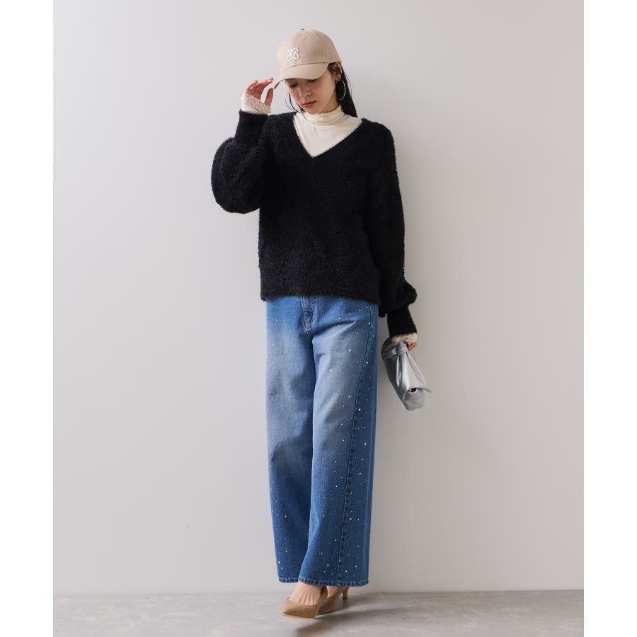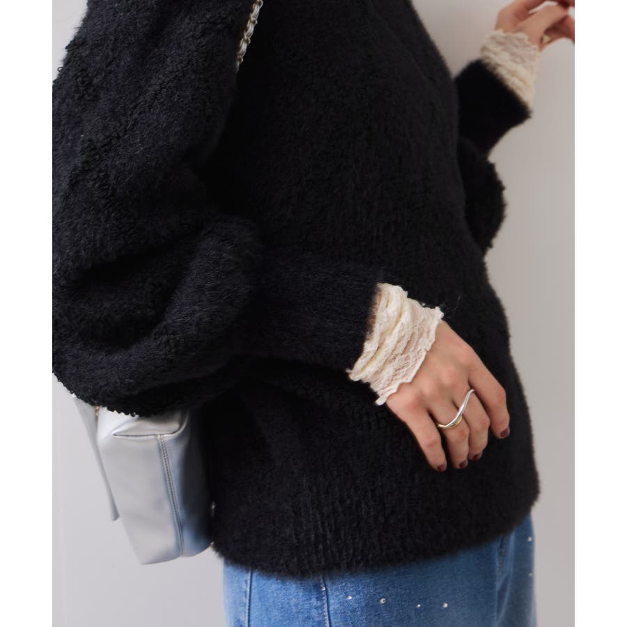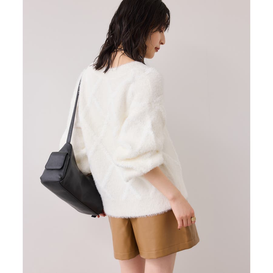 柄が同色系でさり気ないので着やすいアイテムです。Vネックとクルーネックの前後2WAYで着ることが出来て、ぽわんとした袖感もモテ要素があって可愛い1枚。