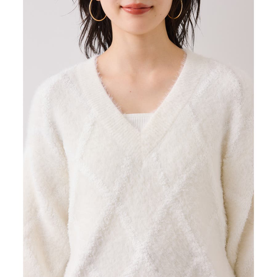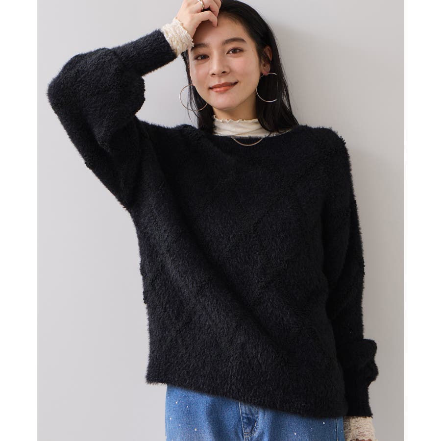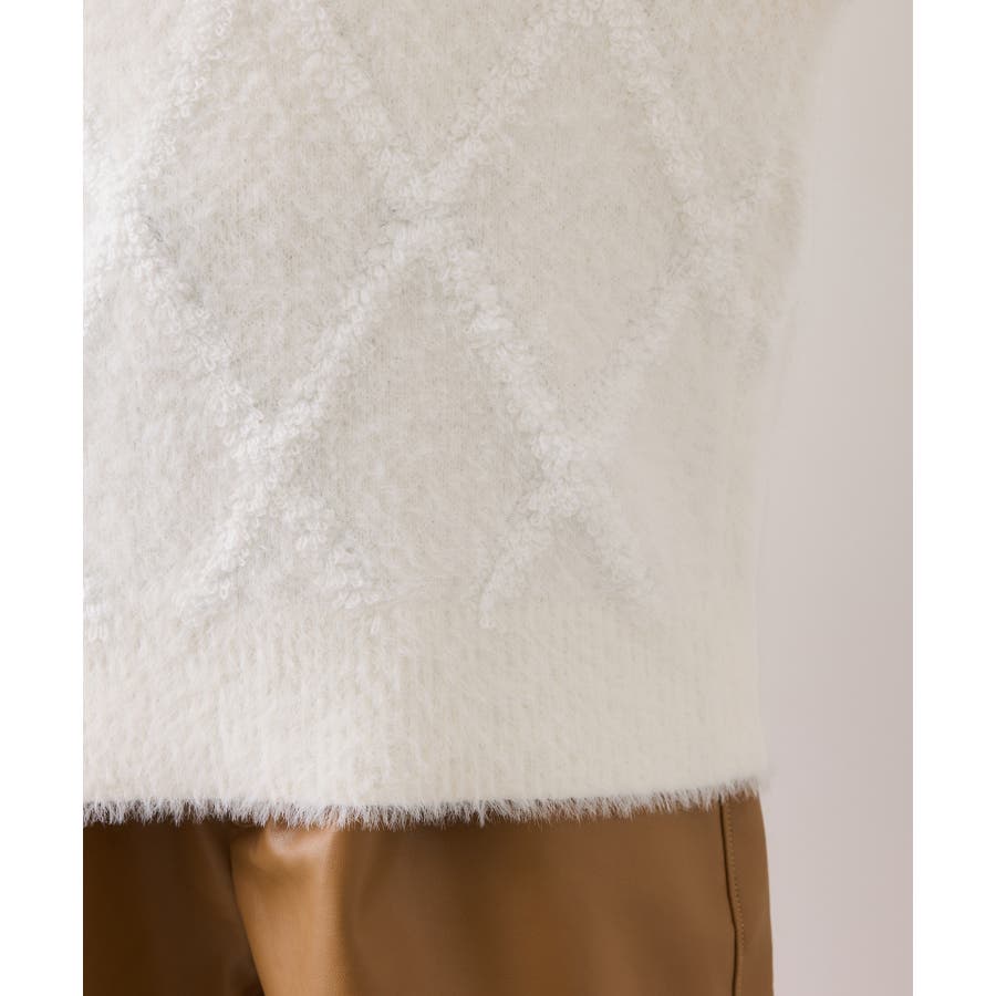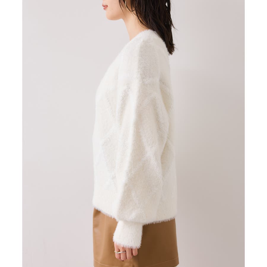 ふわふわのシャギーの糸とブークレの糸を混ぜてアーガイル柄に編んだモテニット。