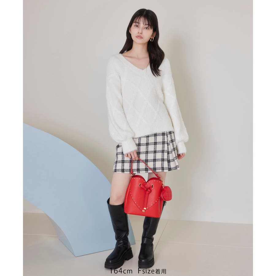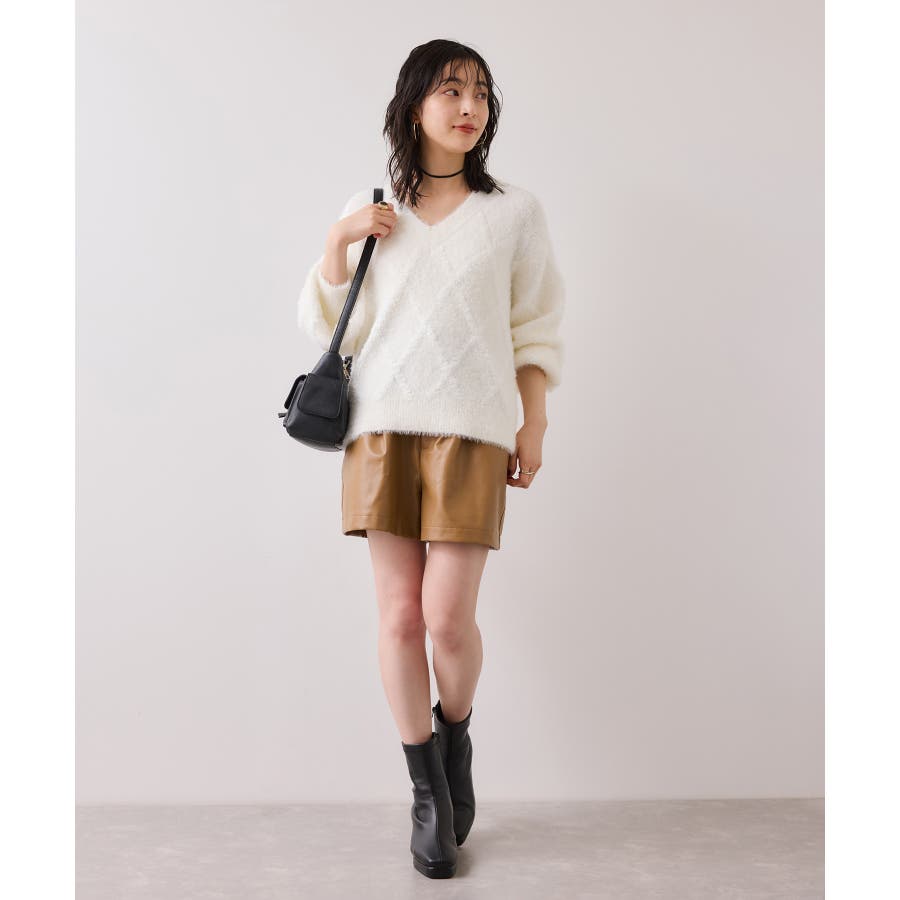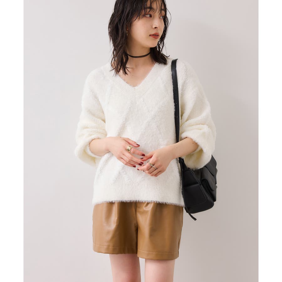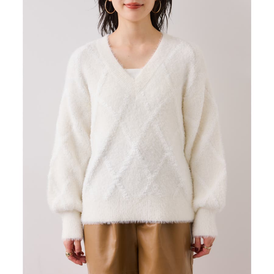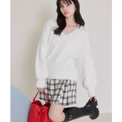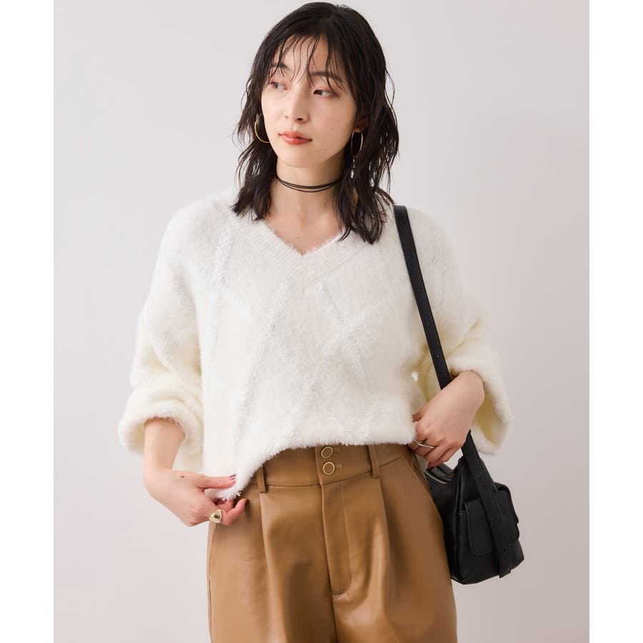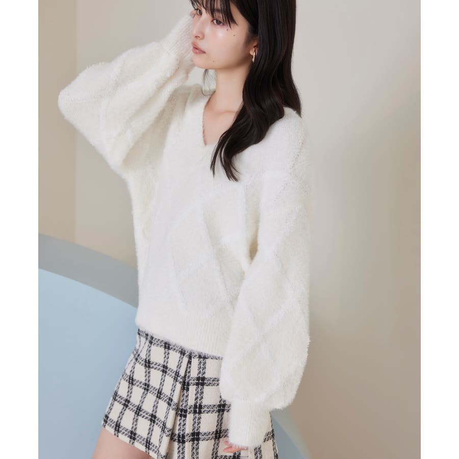 冬の季節に着たくなるふわふわ素材のアーガイル柄のニットは、1枚で華奢ネックレスと合わせ、鎖骨を見せる女っぽスタイルがおすすめです!