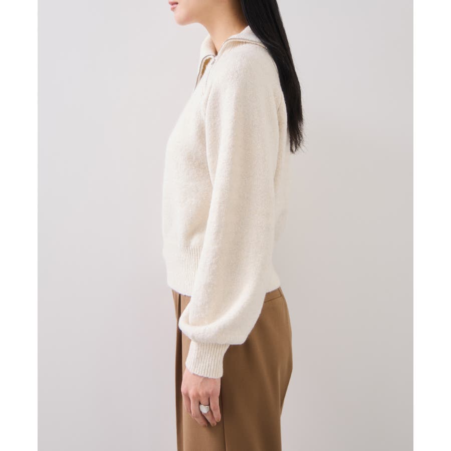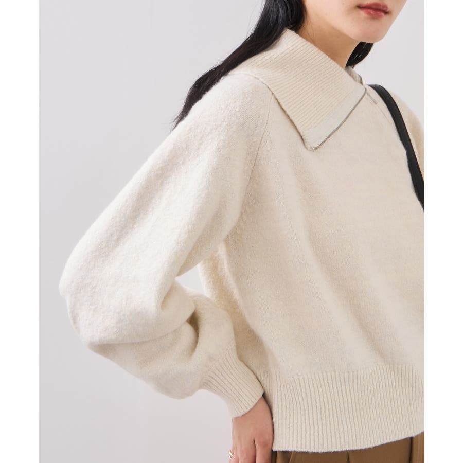 ハイネックデザインなのでジップで斜めに空きを作り、抜け感を演出。袖口、裾はしっかりと止まるようリブにしています。