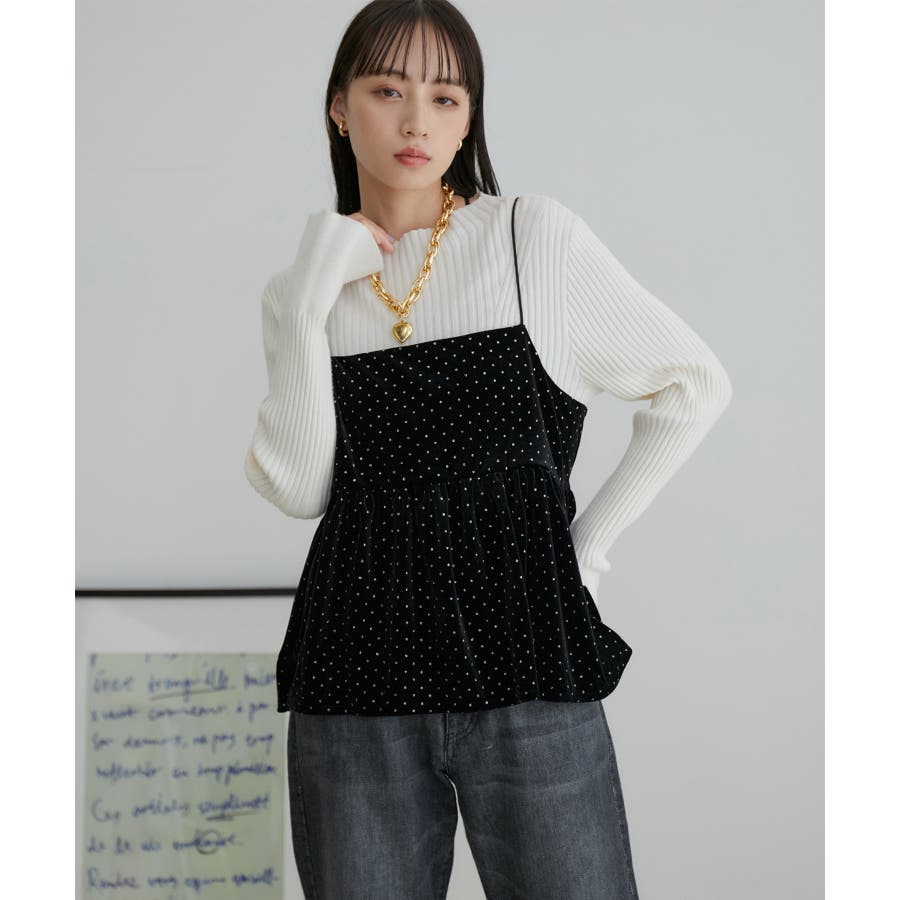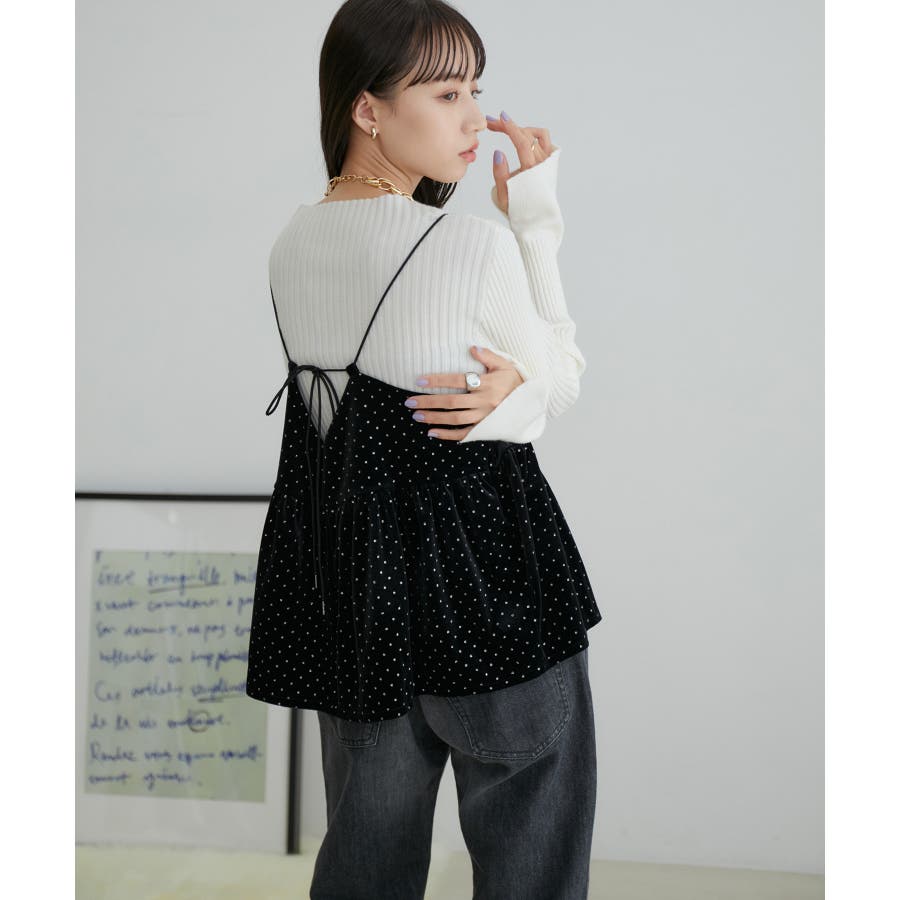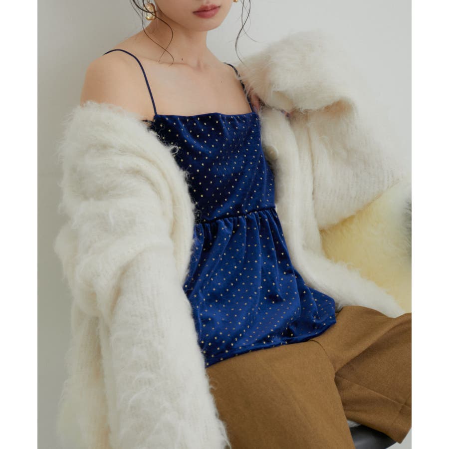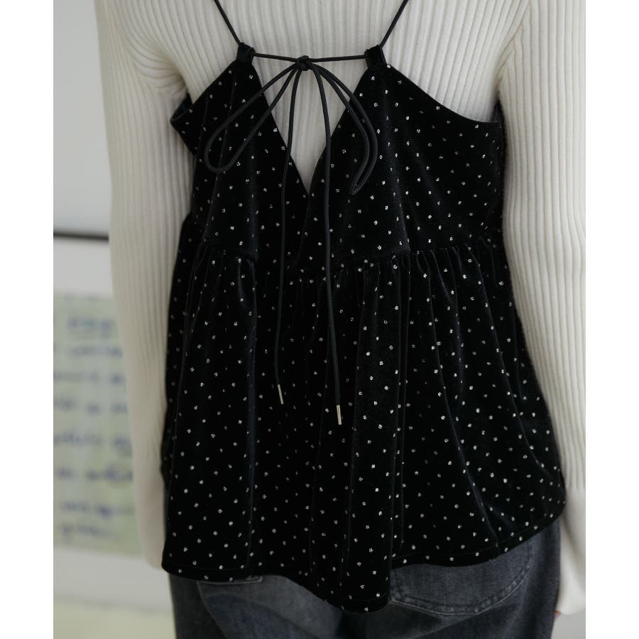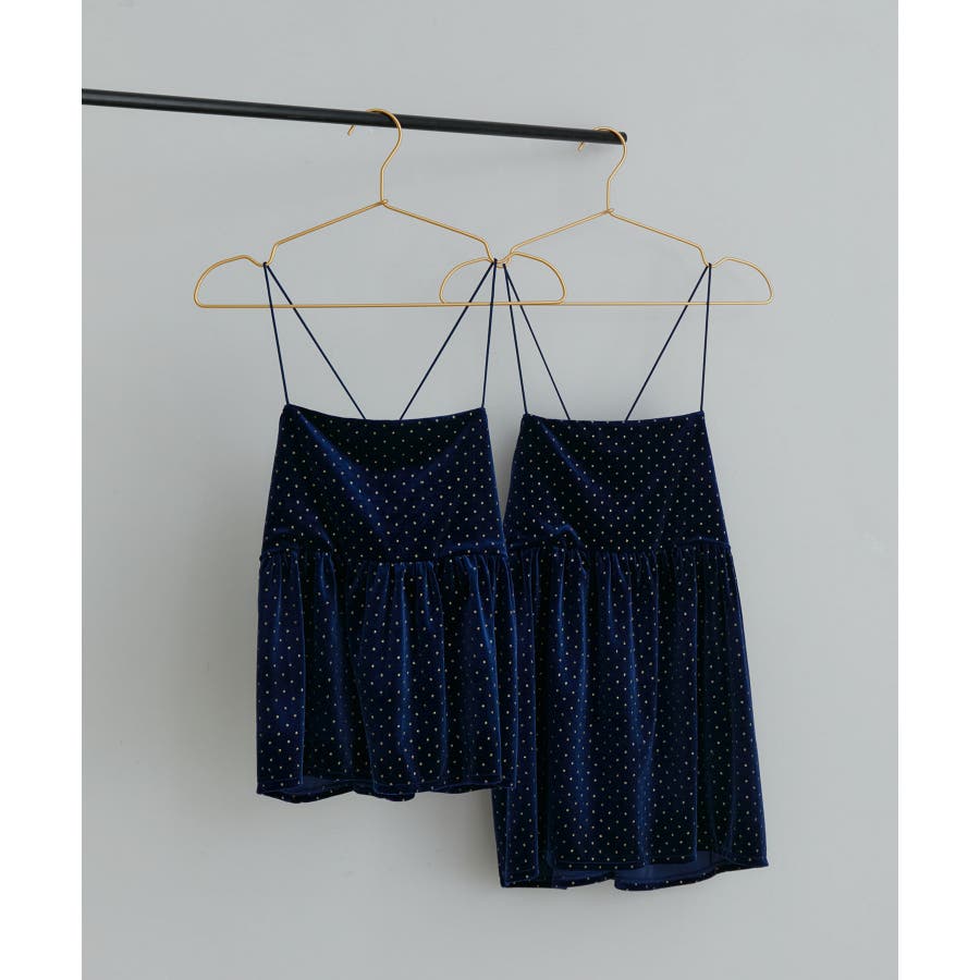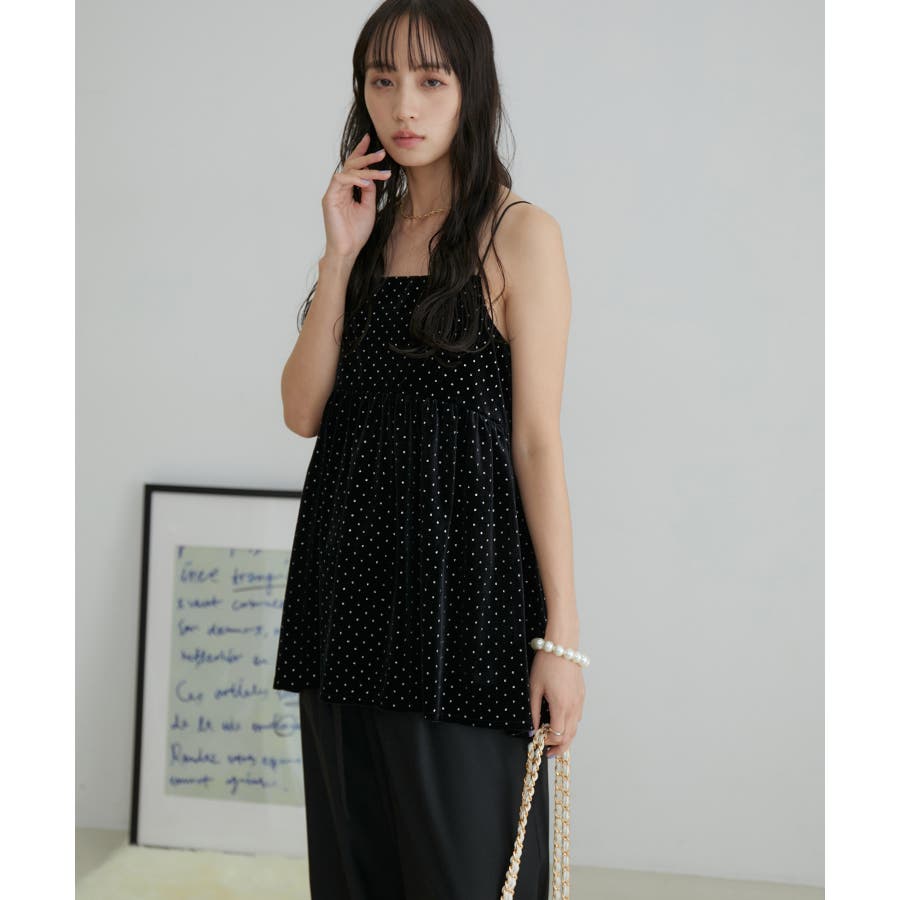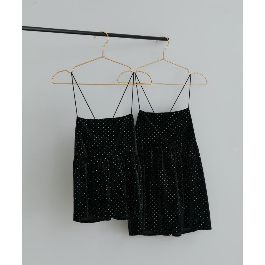 【デザイン・シルエット】 今年注目素材のベロアにラメドットのプリントを施したキャミソールです。