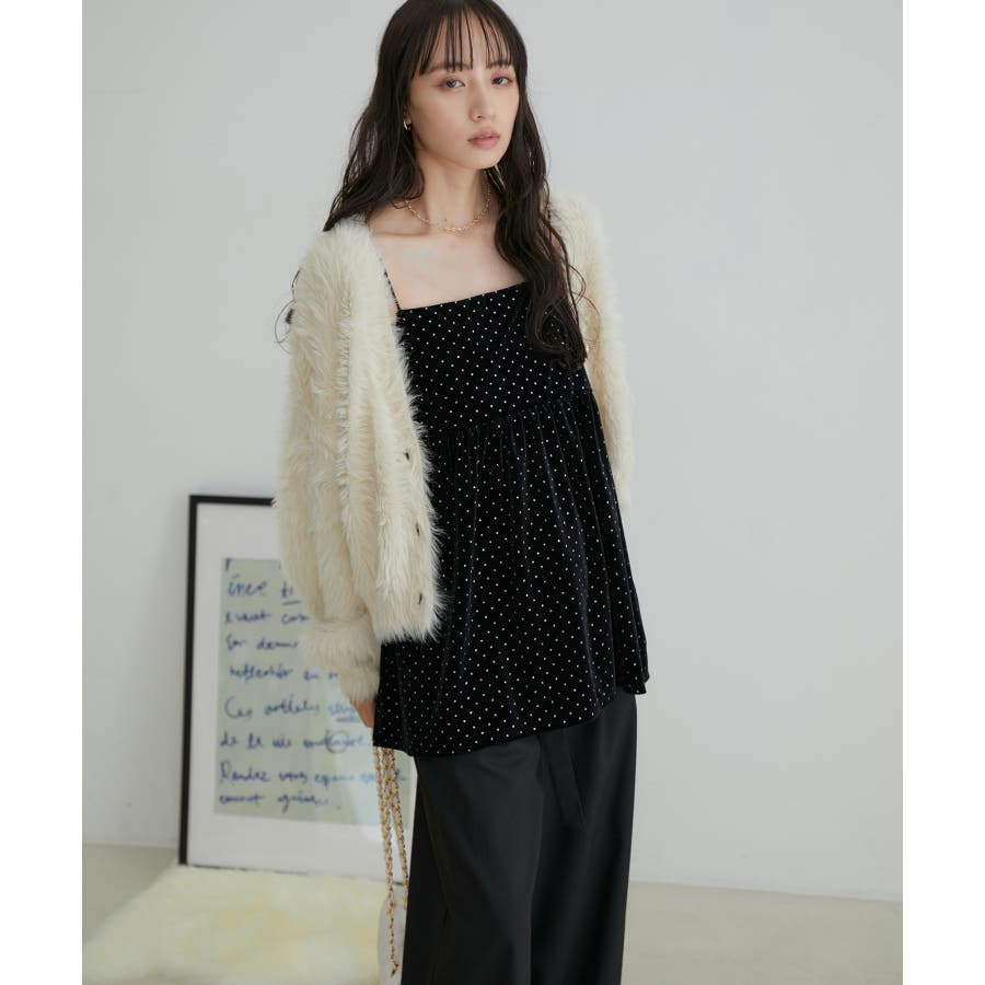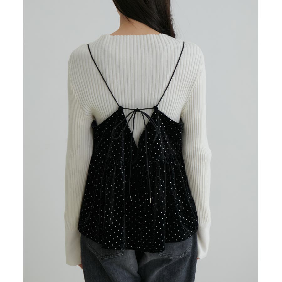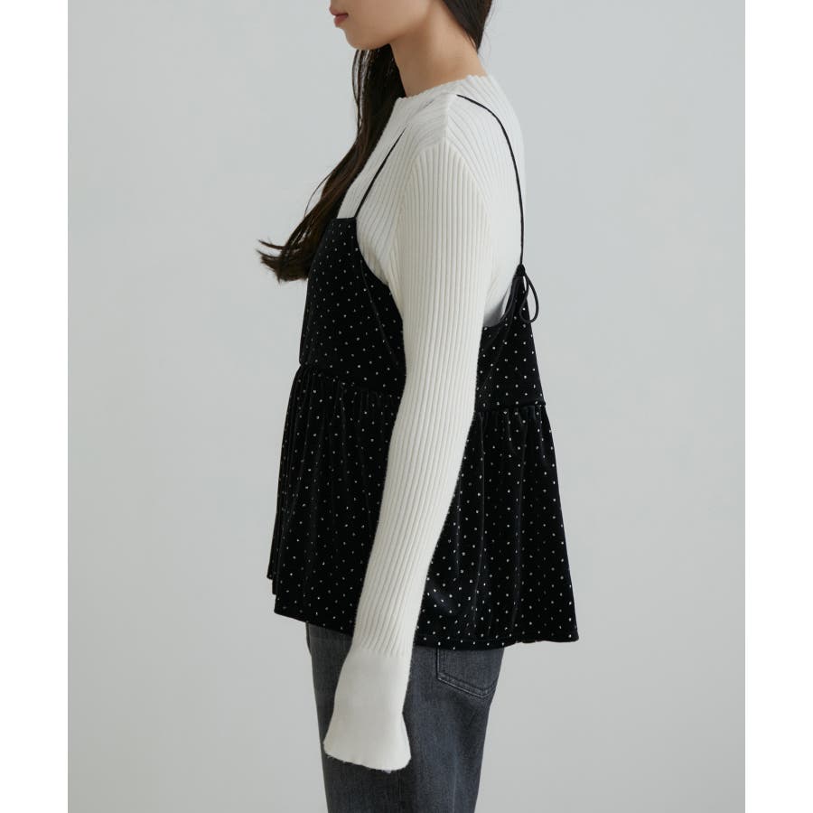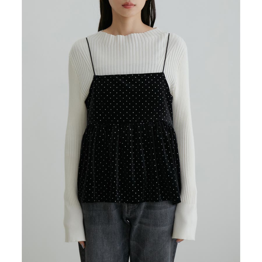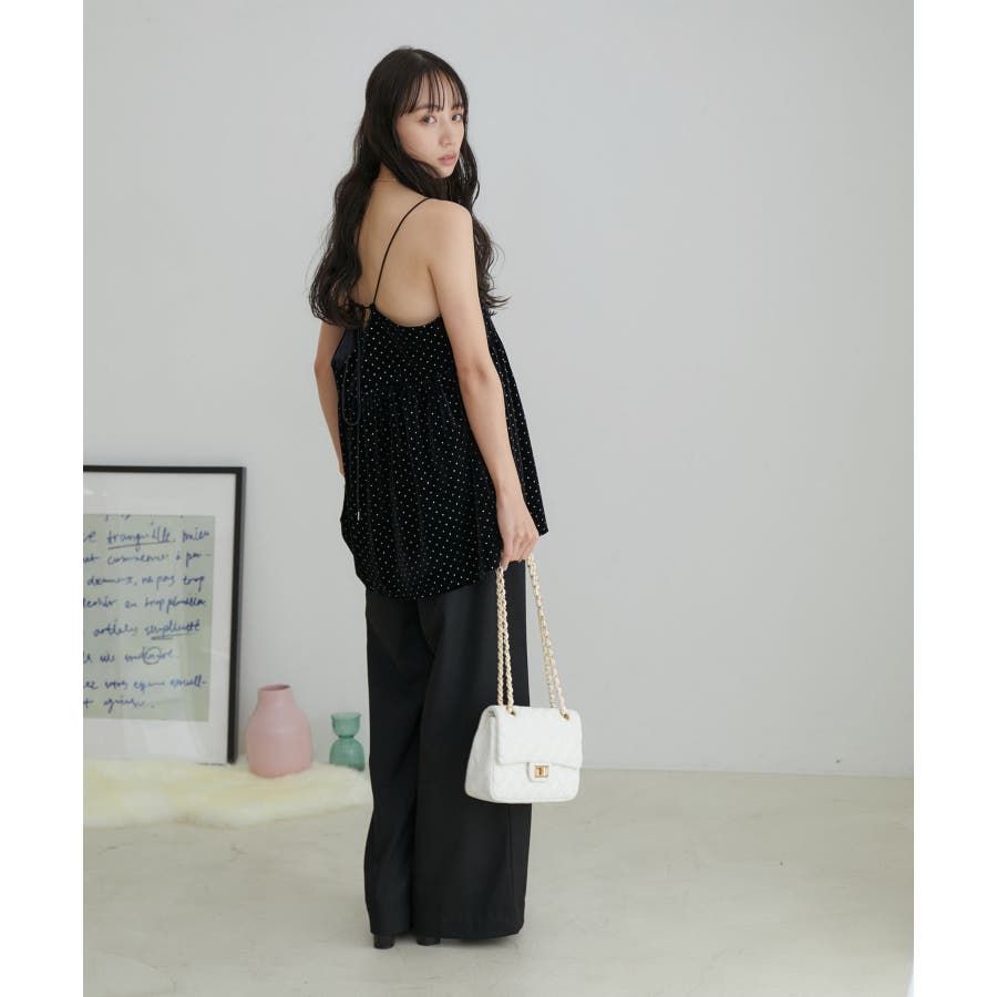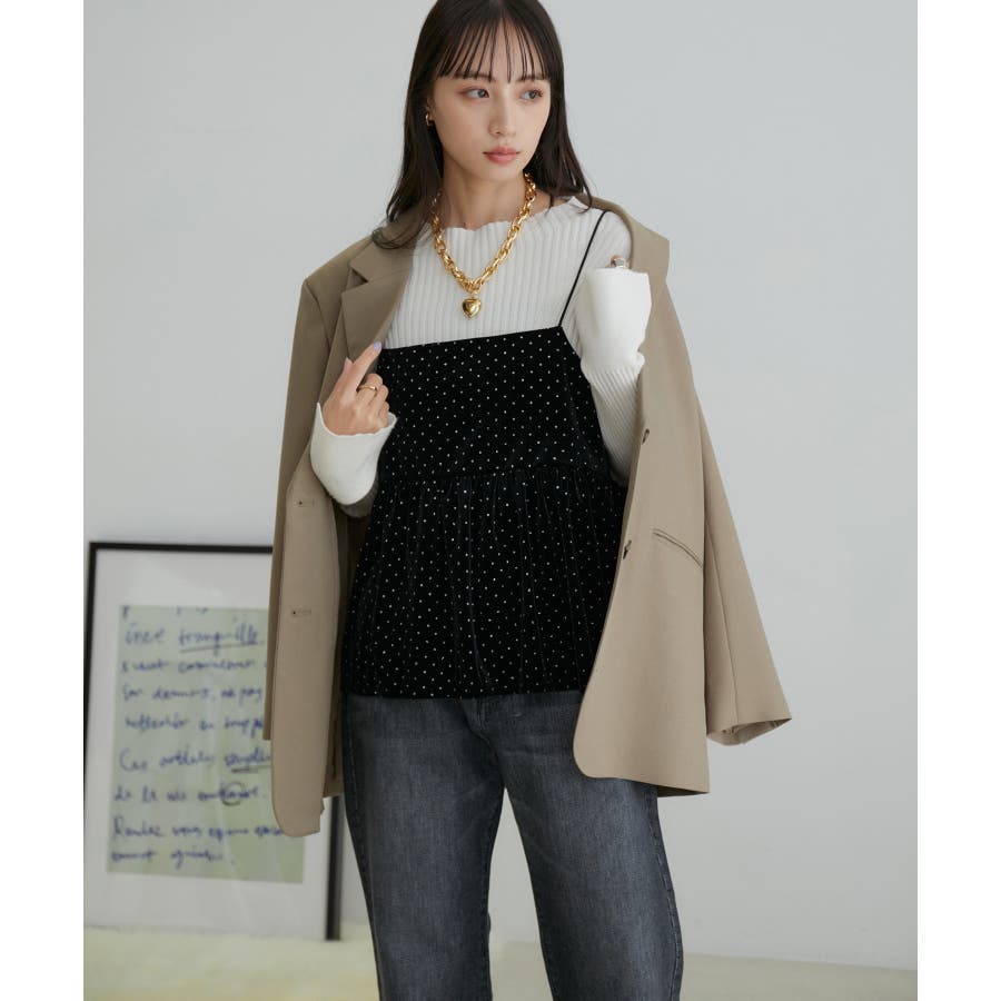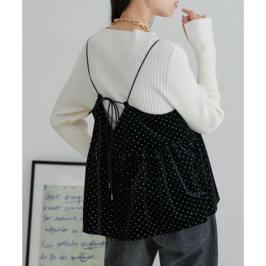 【デザイン・シルエット】 今年注目素材のベロアにラメドットのプリントを施したキャミソールです。
