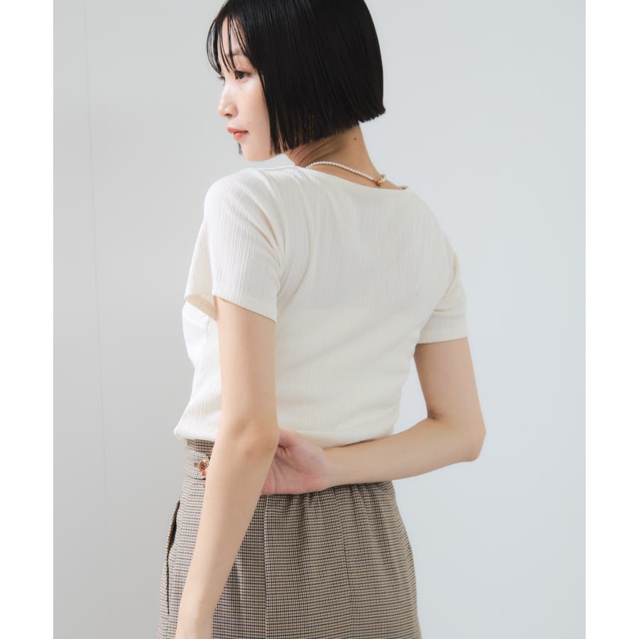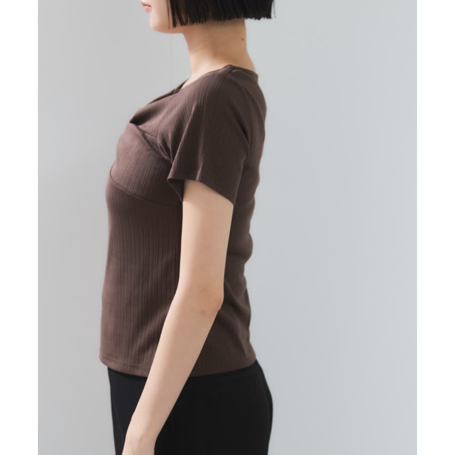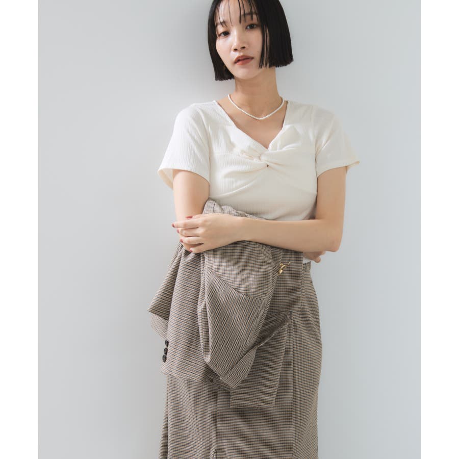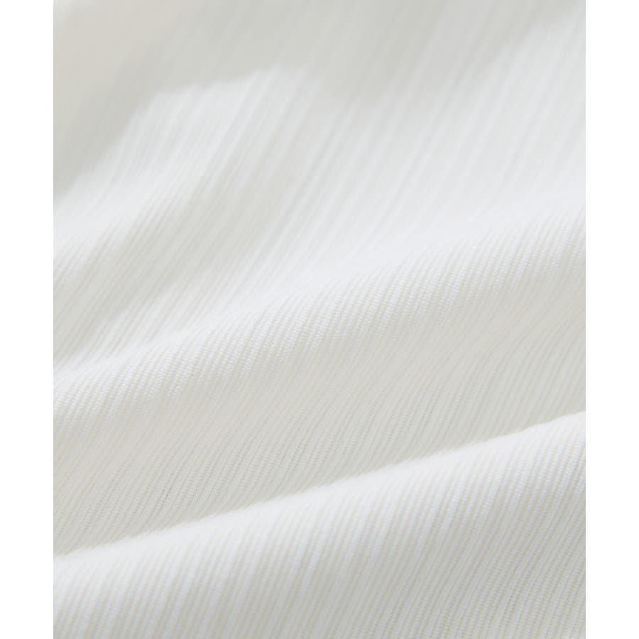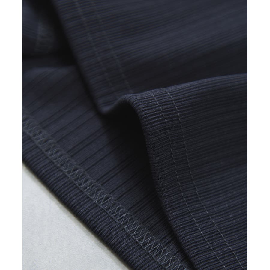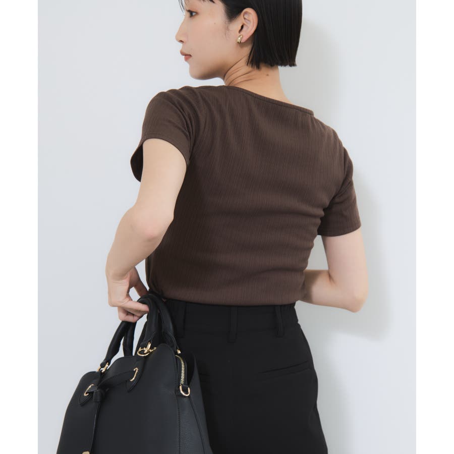 素材がリブなので気になる体のラインを拾わないところもうれしいポイント。ネジリ位置が高めなのでインスタイルも脚長見えに。暑い時期から着れて、秋に入ればジャケットインに使ってもデザインポイントが顔回りを華やかに見せてくれます。
