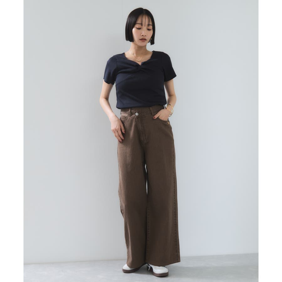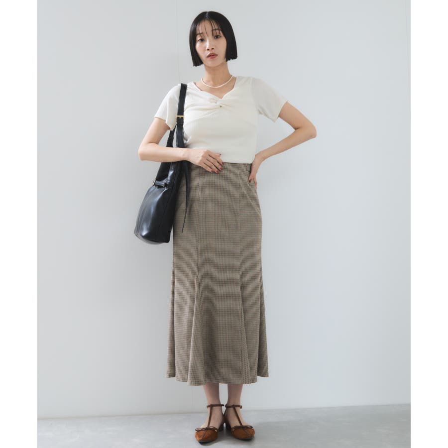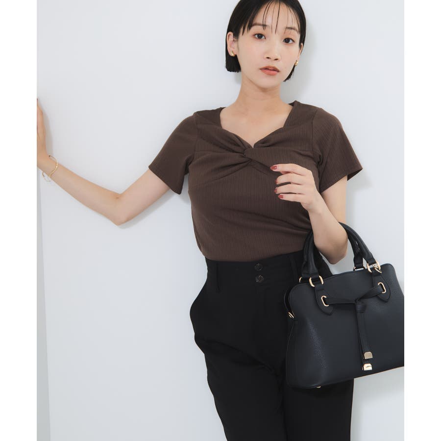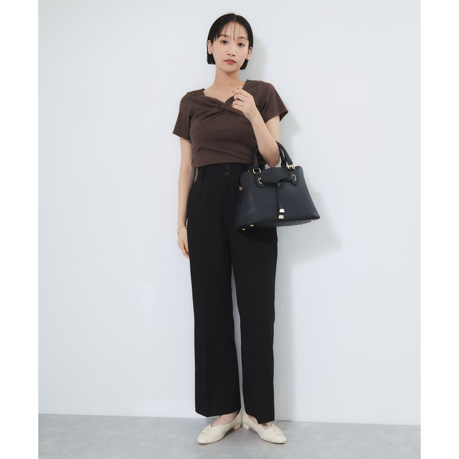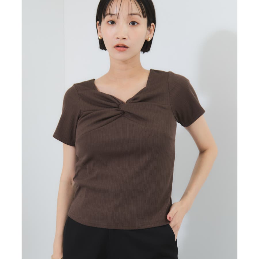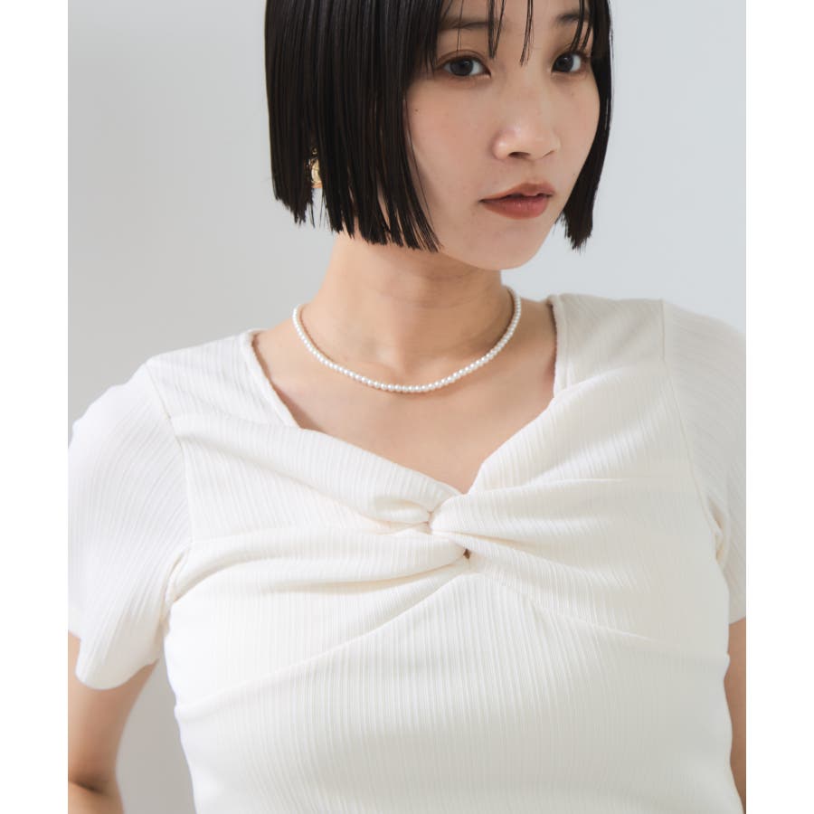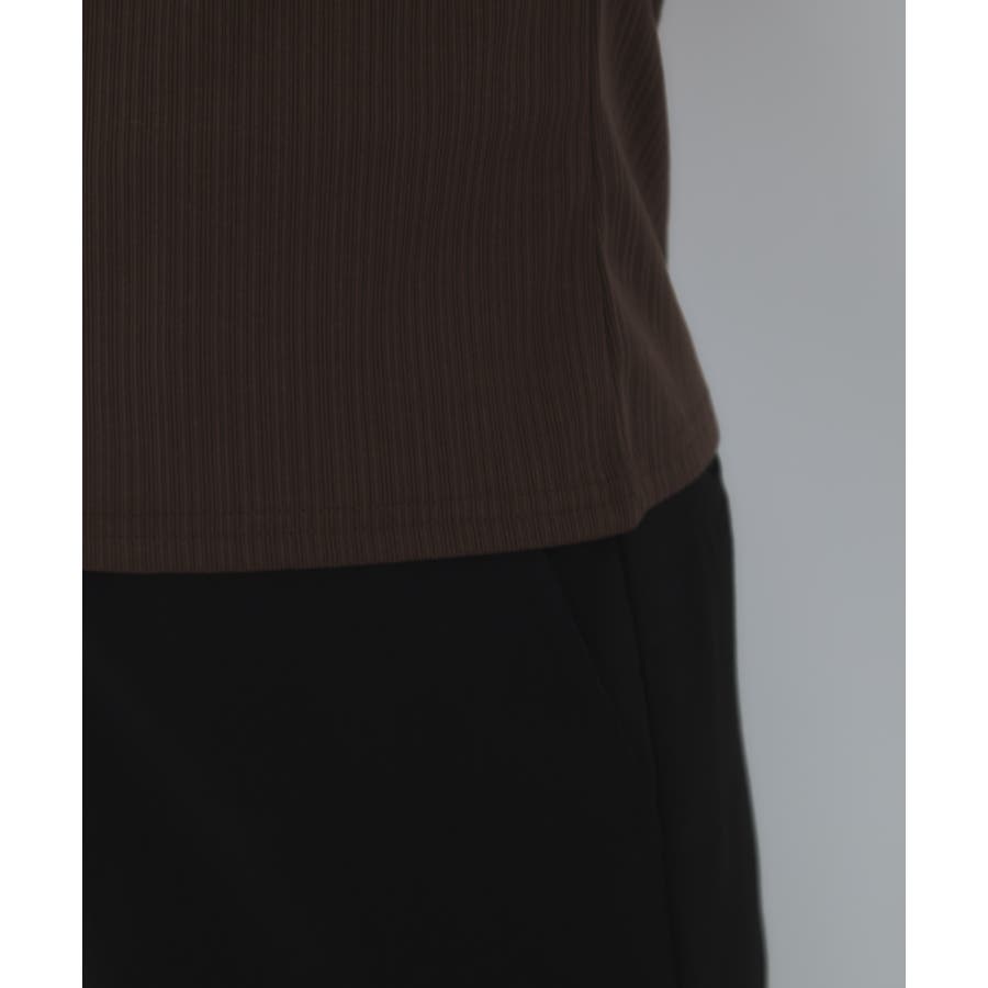 素材がリブなので気になる体のラインを拾わないところもうれしいポイント。ネジリ位置が高めなのでインスタイルも脚長見えに。暑い時期から着れて、秋に入ればジャケットインに使ってもデザインポイントが顔回りを華やかに見せてくれます。