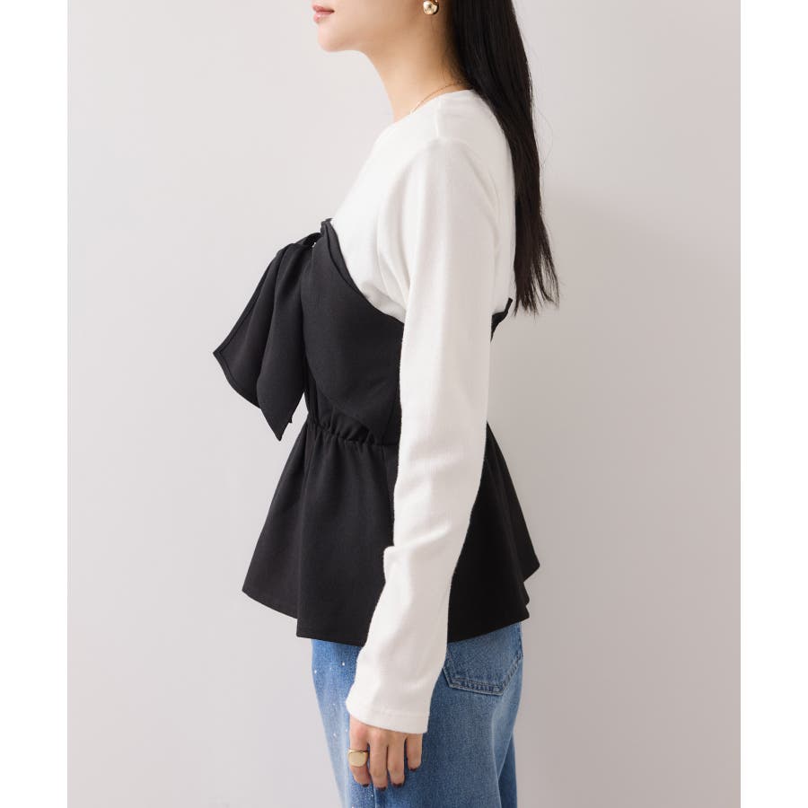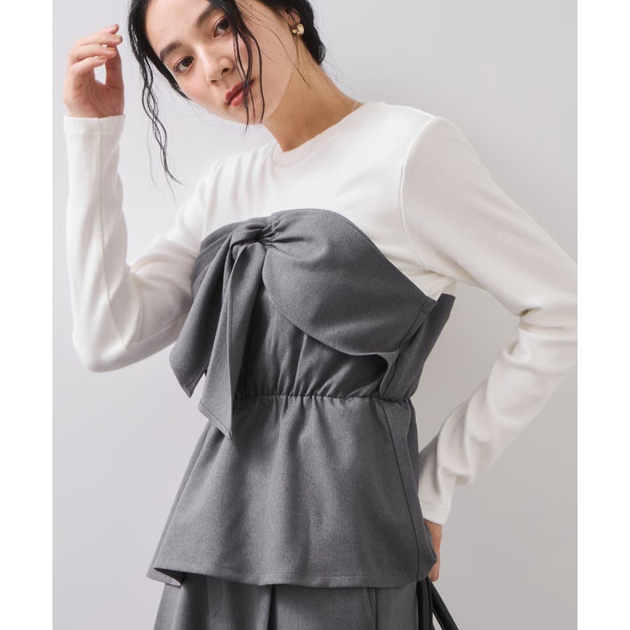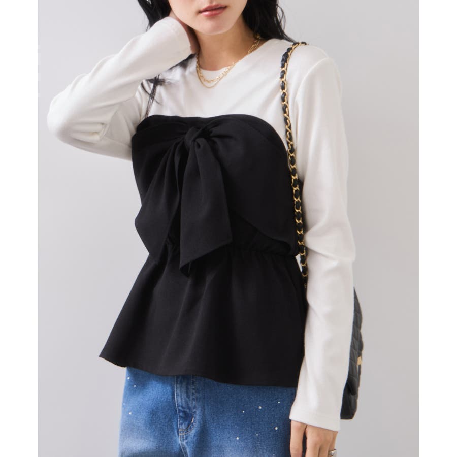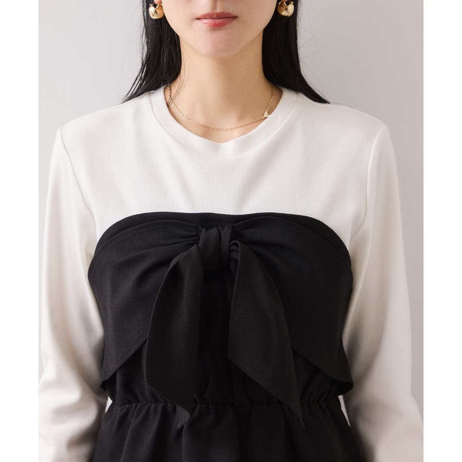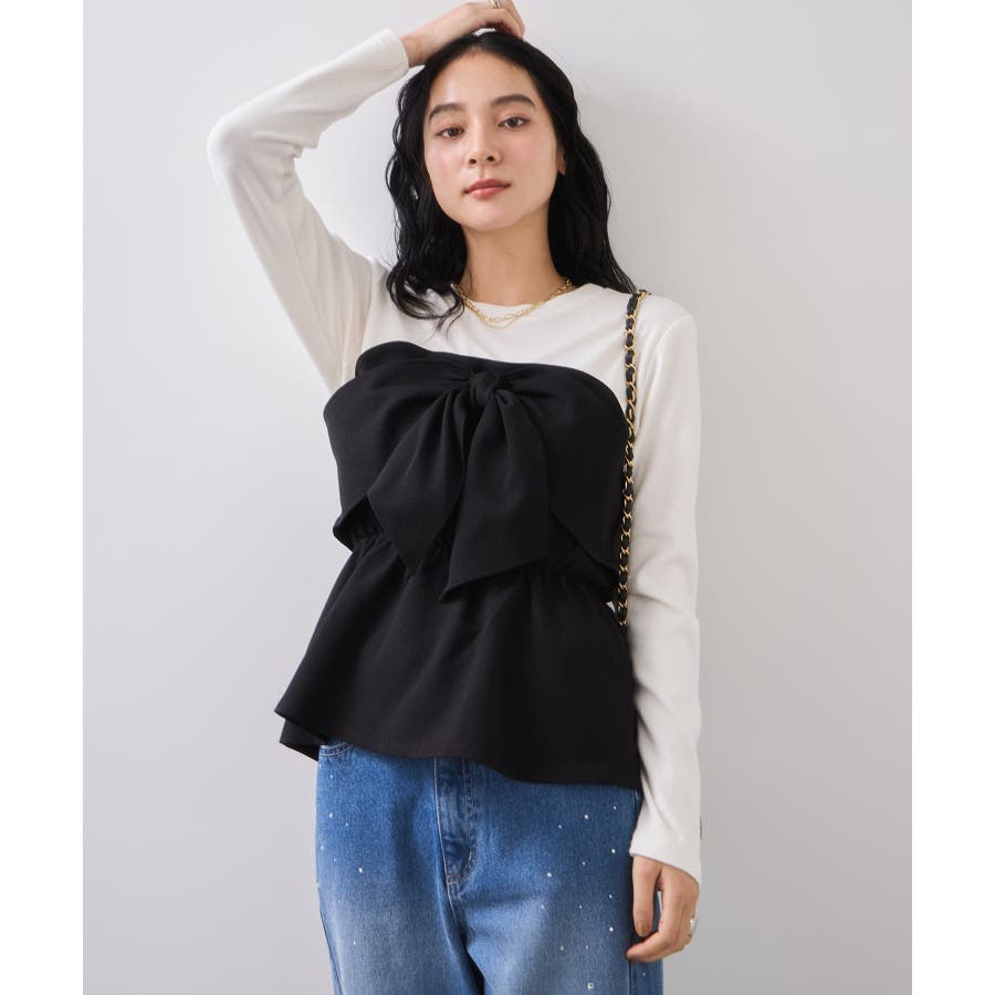 フロントのリボンモチーフがカワイイ、コンパクトシルエットの華奢見えするフェミニンなトップスです。