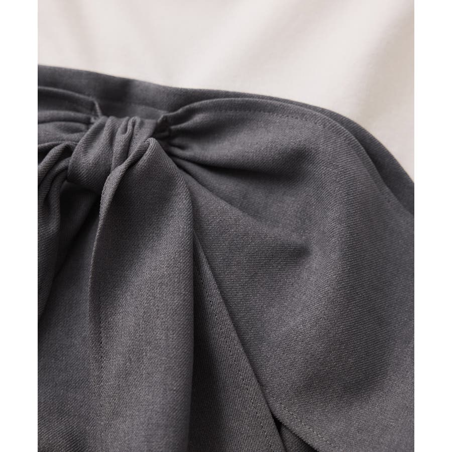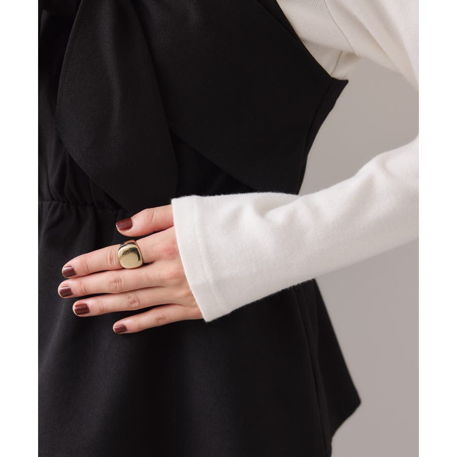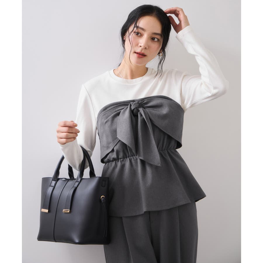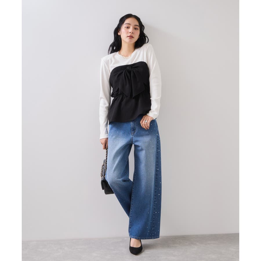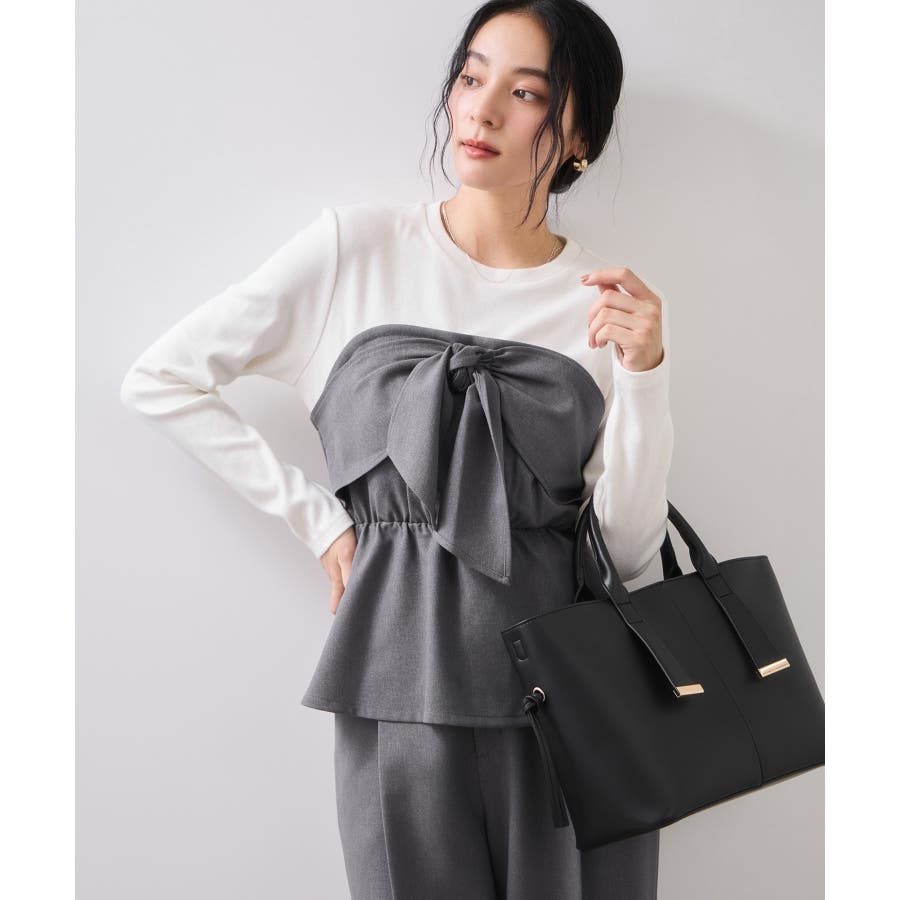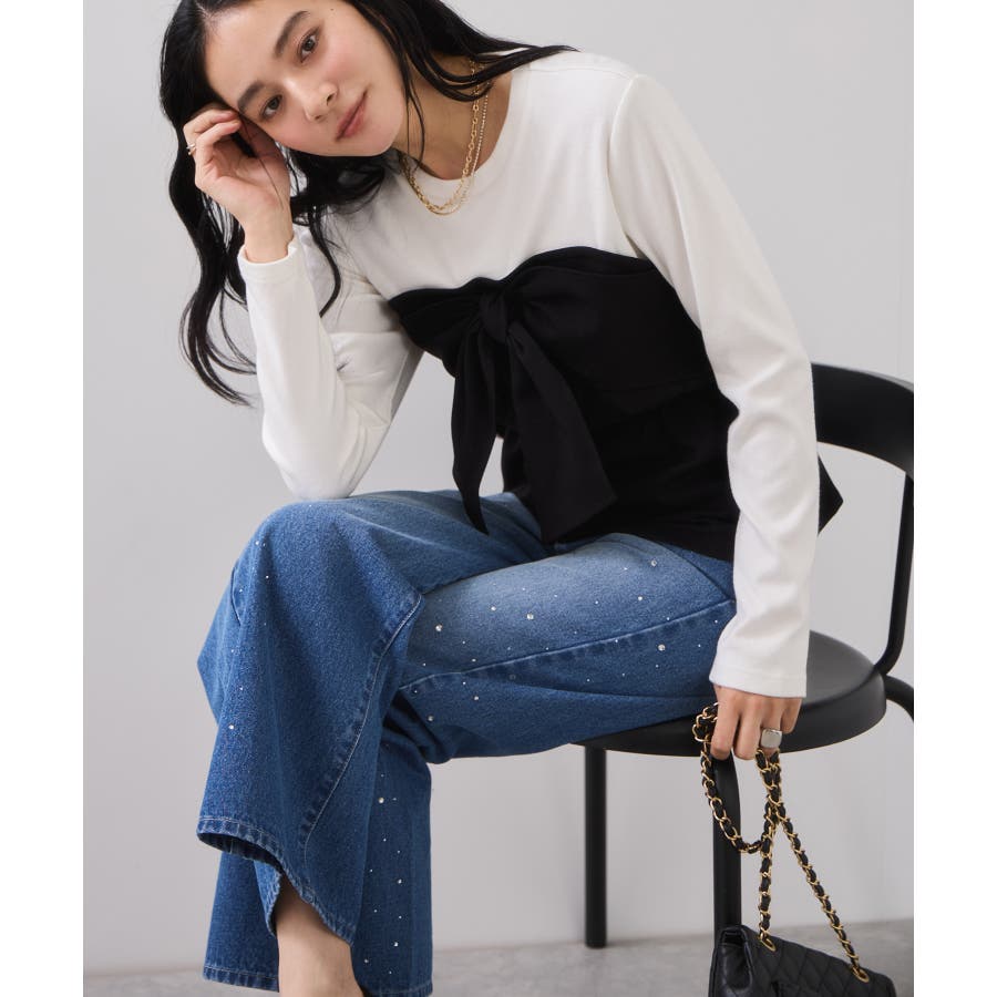 フロントのリボンモチーフがカワイイ、コンパクトシルエットの華奢見えするフェミニンなトップスです。