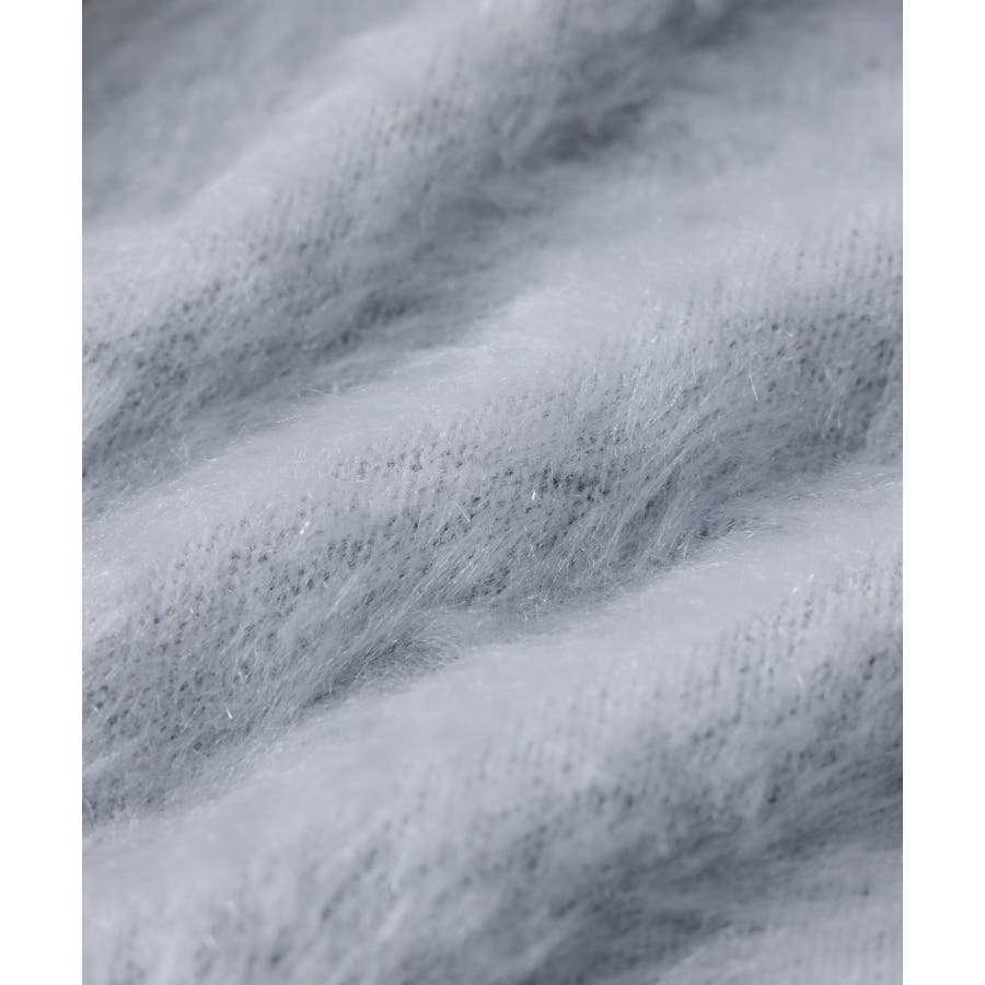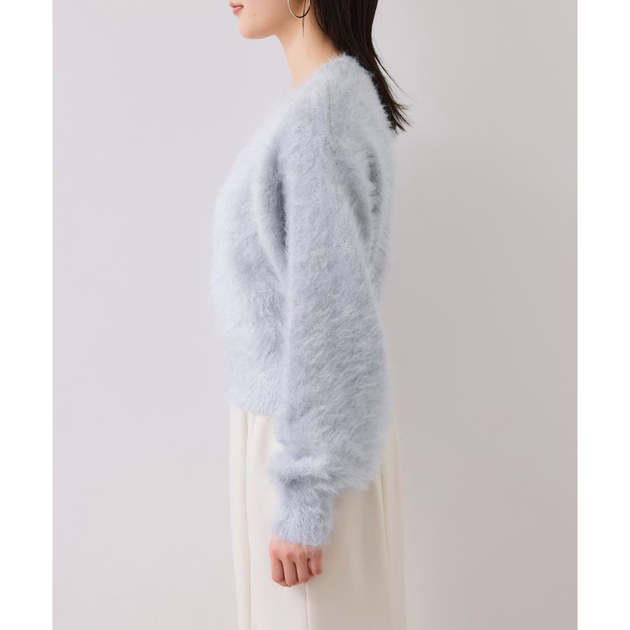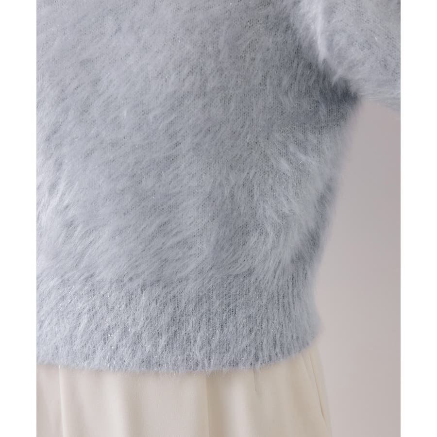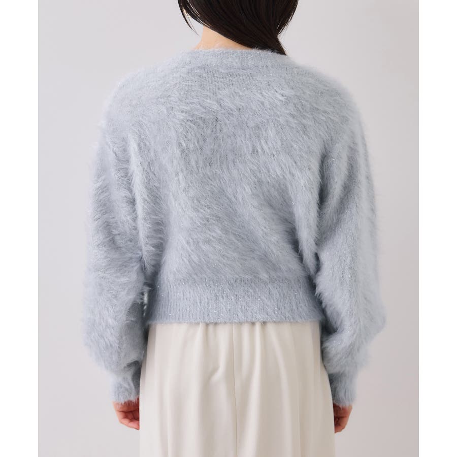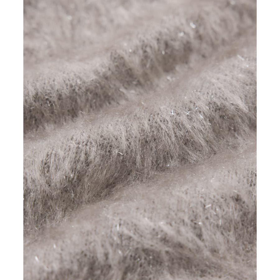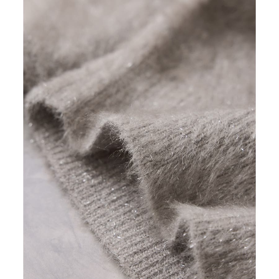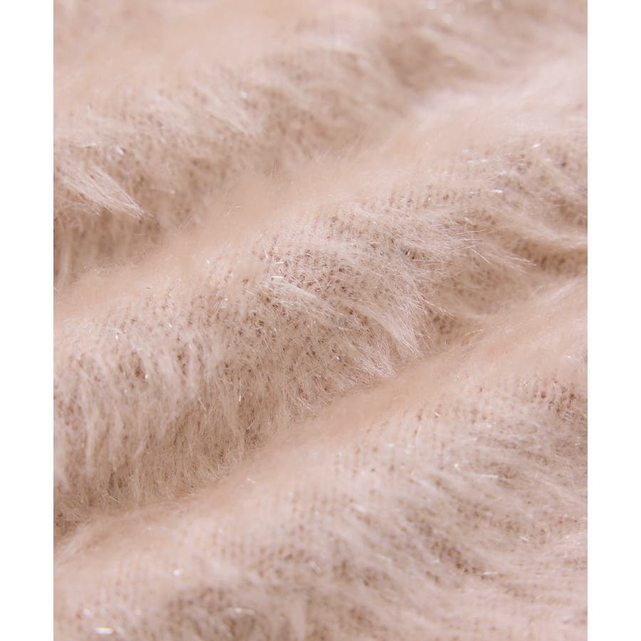 メタルヤーン(メタリックなラメ糸)とネコヤーン(ネコのような細い毛足の糸)を掛け合わせたキラキラ×フワフワのニット。