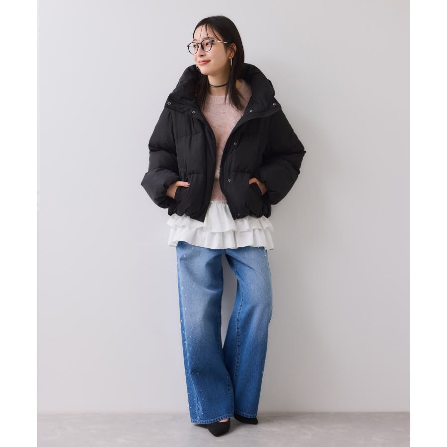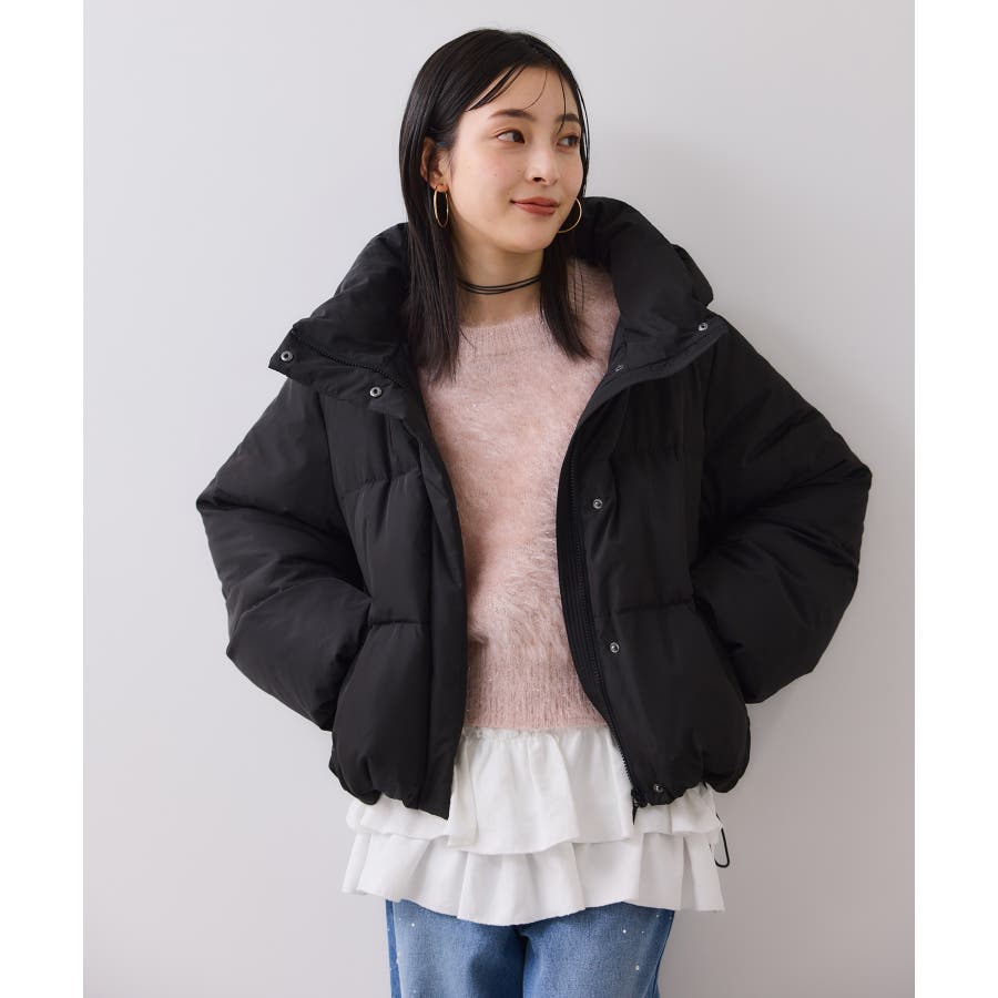 トップスにボリュームがあるのでミニ丈ボトムでバランスよくスタイリングするのがおすすめ!