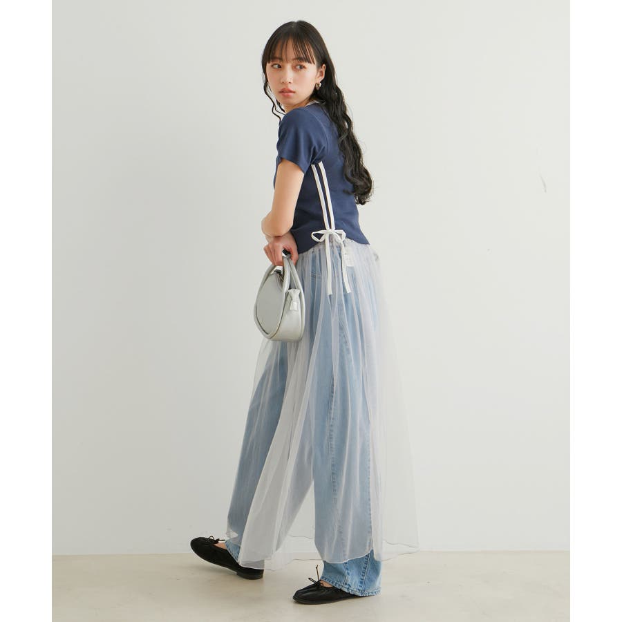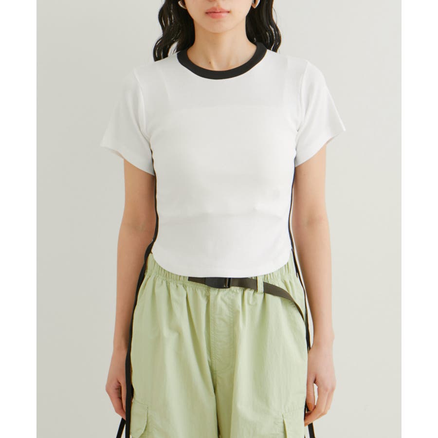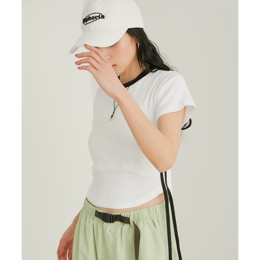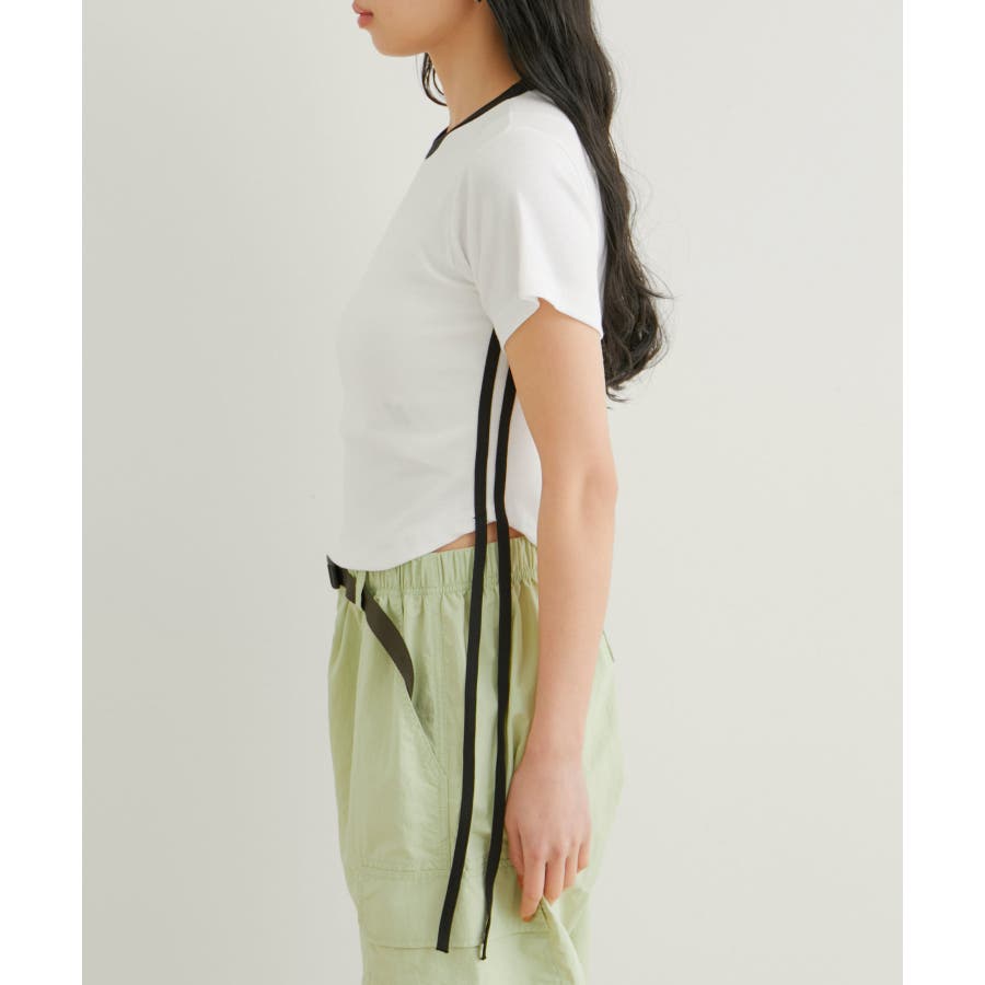 ◆2024春夏◆ 【デザイン・シルエット】 甘さのあるリボンにスポーティな要素を取り入れたサイドラインがポイント! サイドはラウンドしているため、スポーティさに肌見せをプラス。