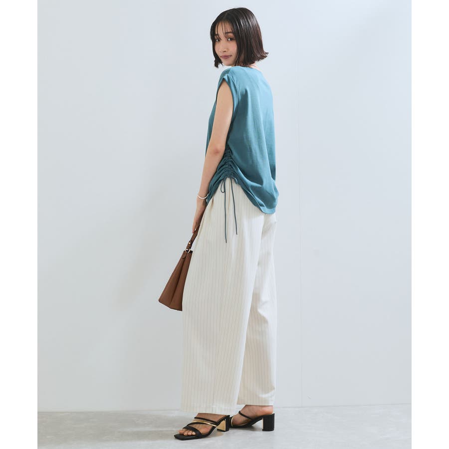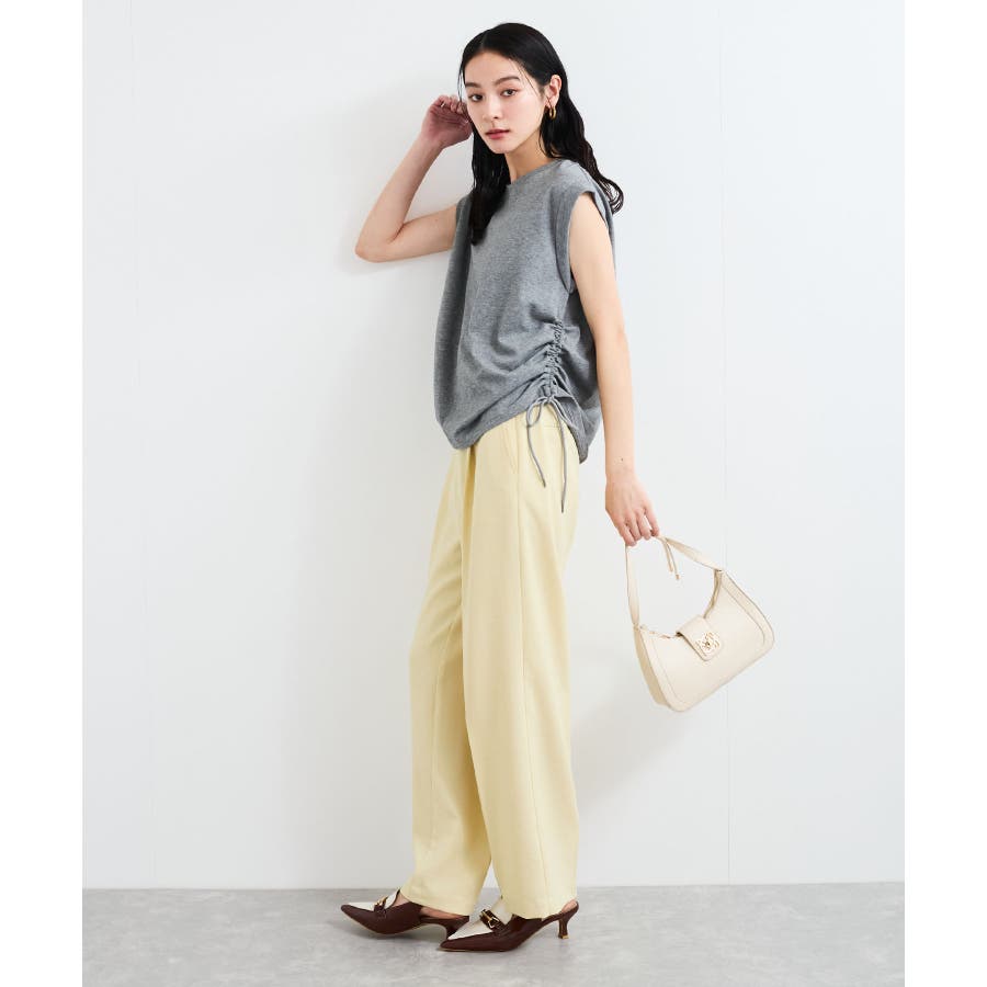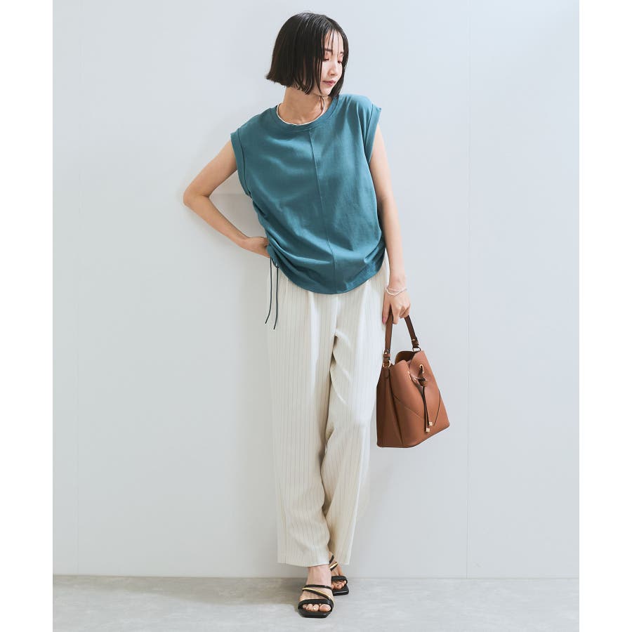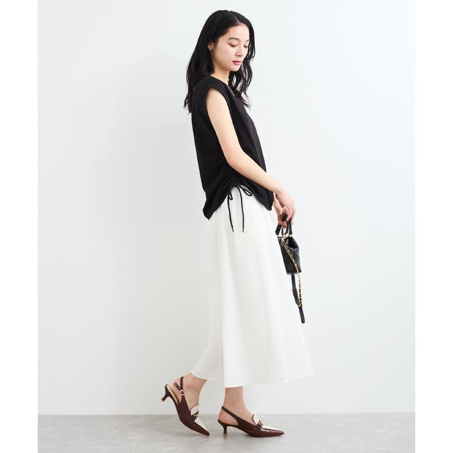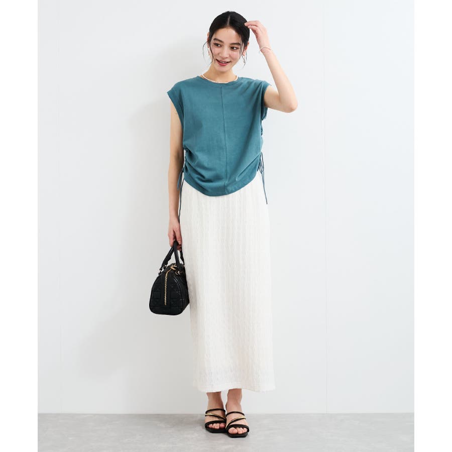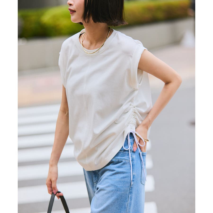 サイドのドローコードを調節し、ハイウエストパンツやロングスカートなどと合わせた女性らしいカジュアルスタイルも◎