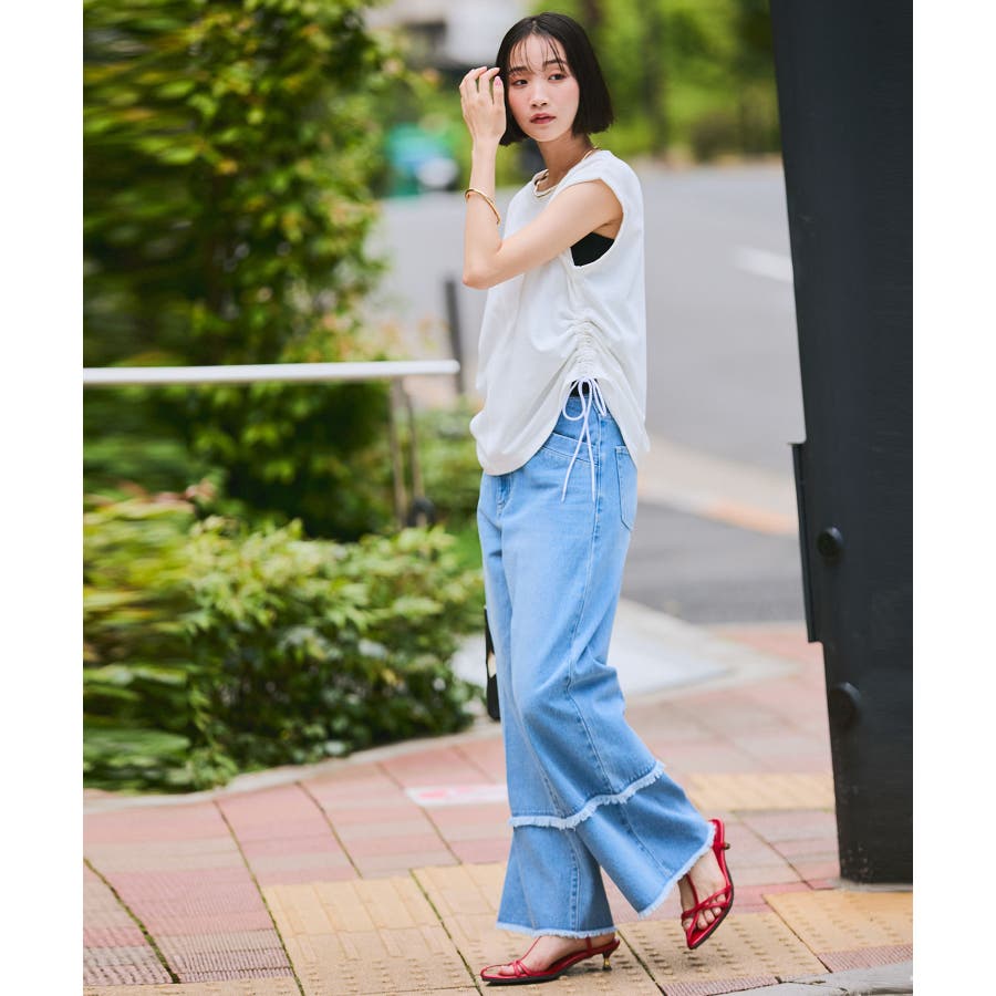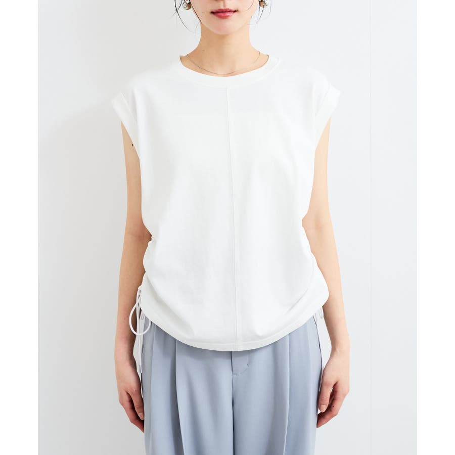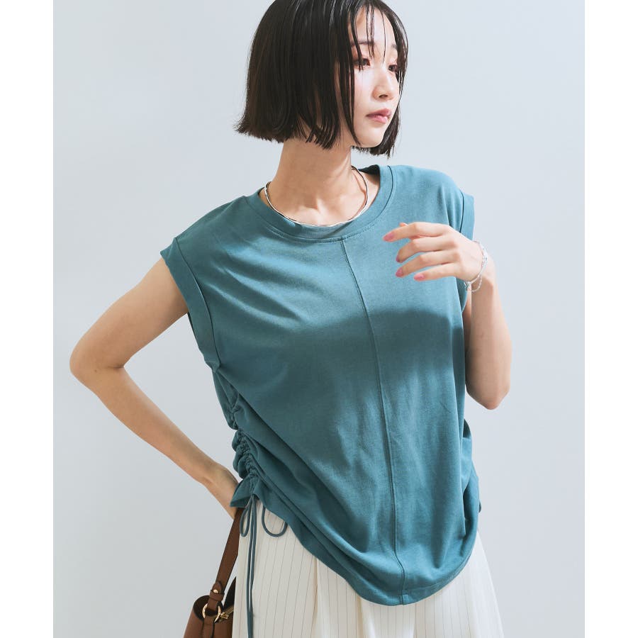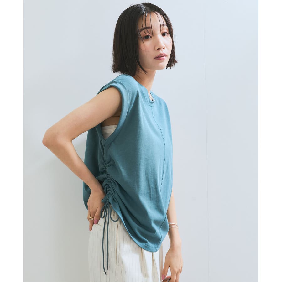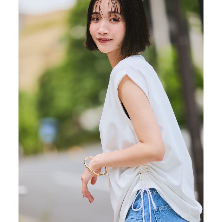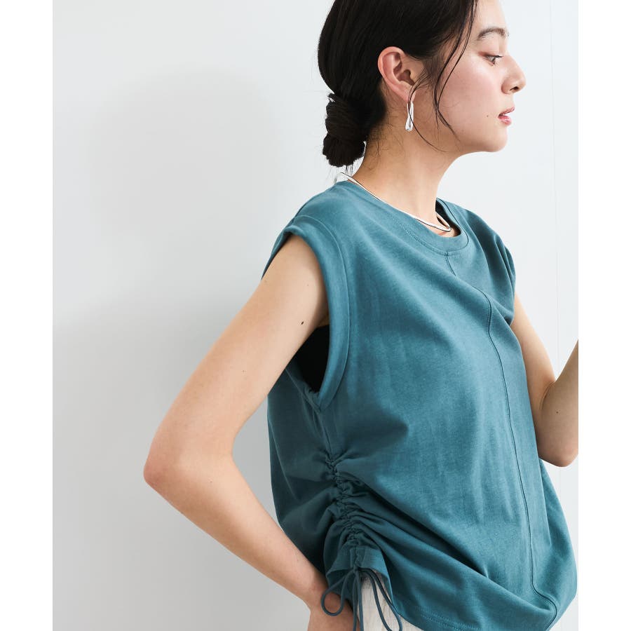 サイドのドローコードを調節し、ハイウエストパンツやロングスカートなどと合わせた女性らしいカジュアルスタイルも◎