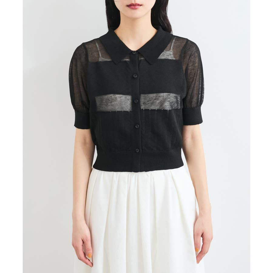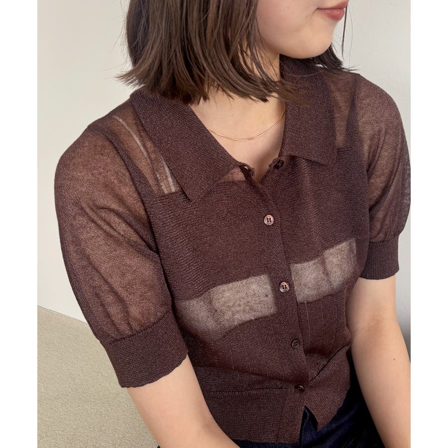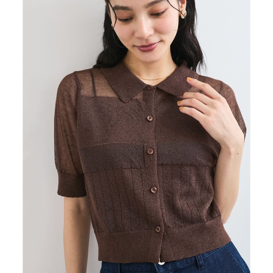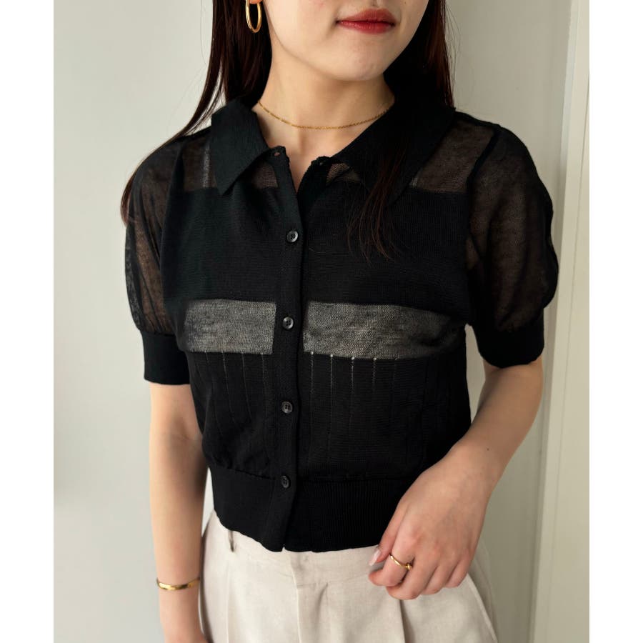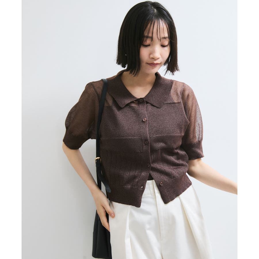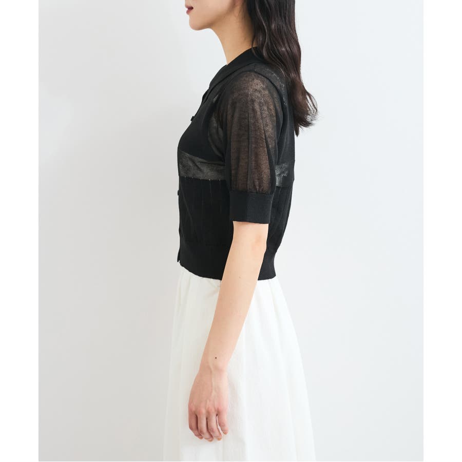 ・編み地の切り替えデザインで、カジュアルすぎず女性らしく着れるポロデザインに。