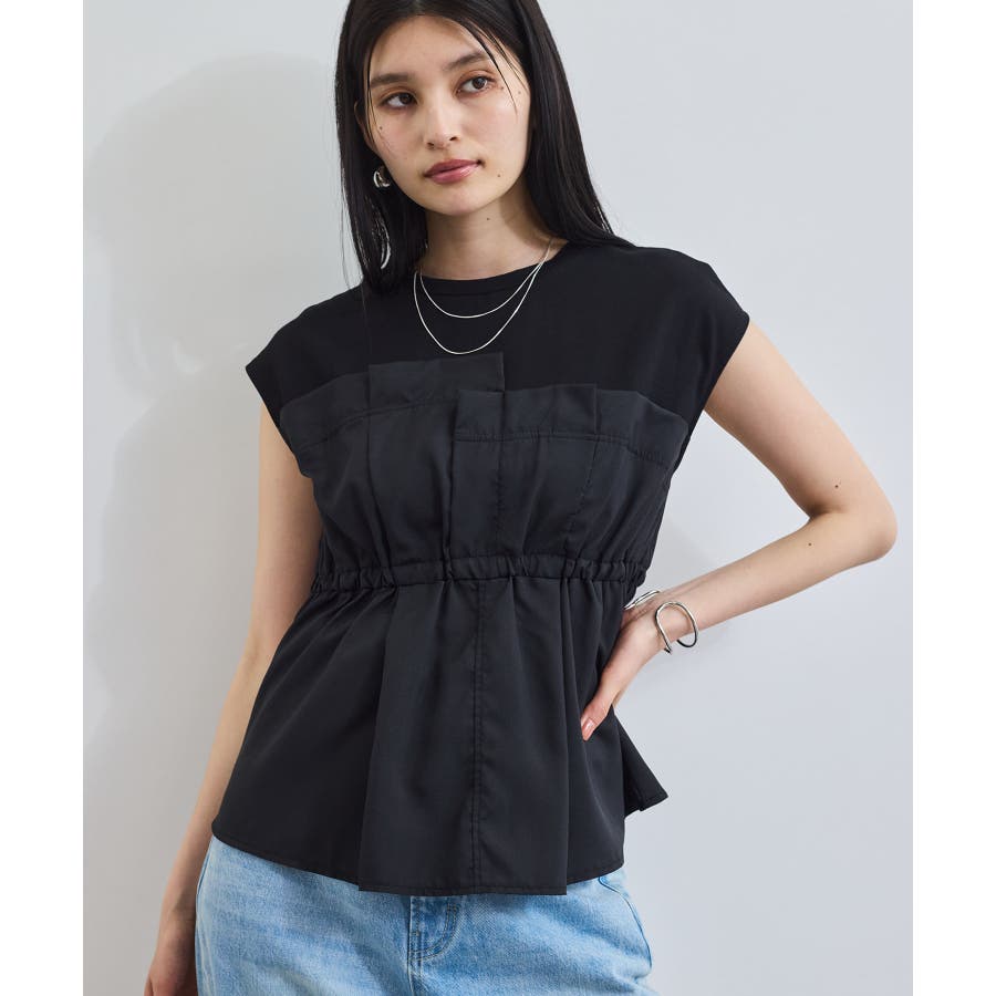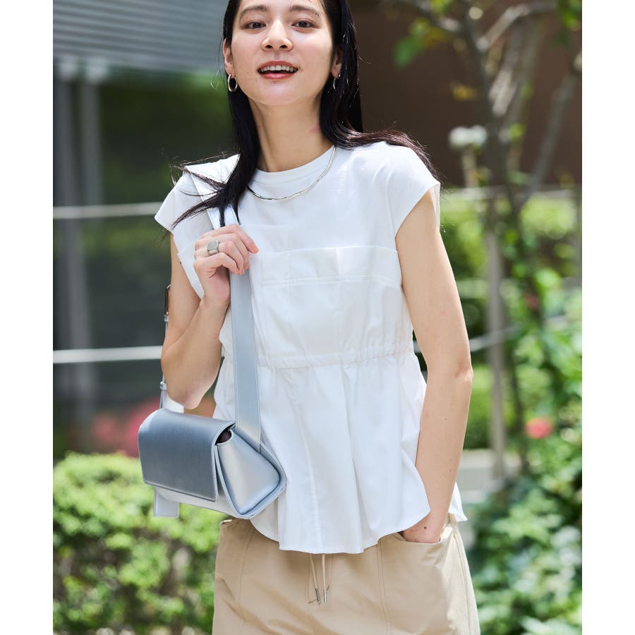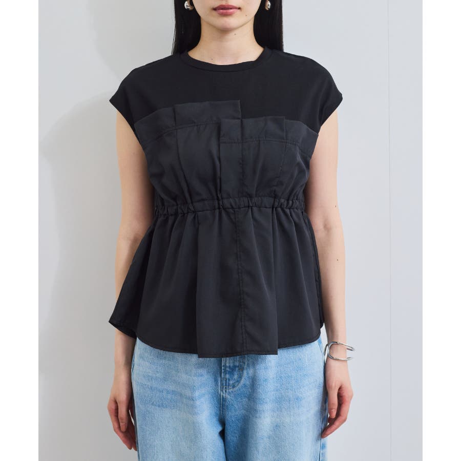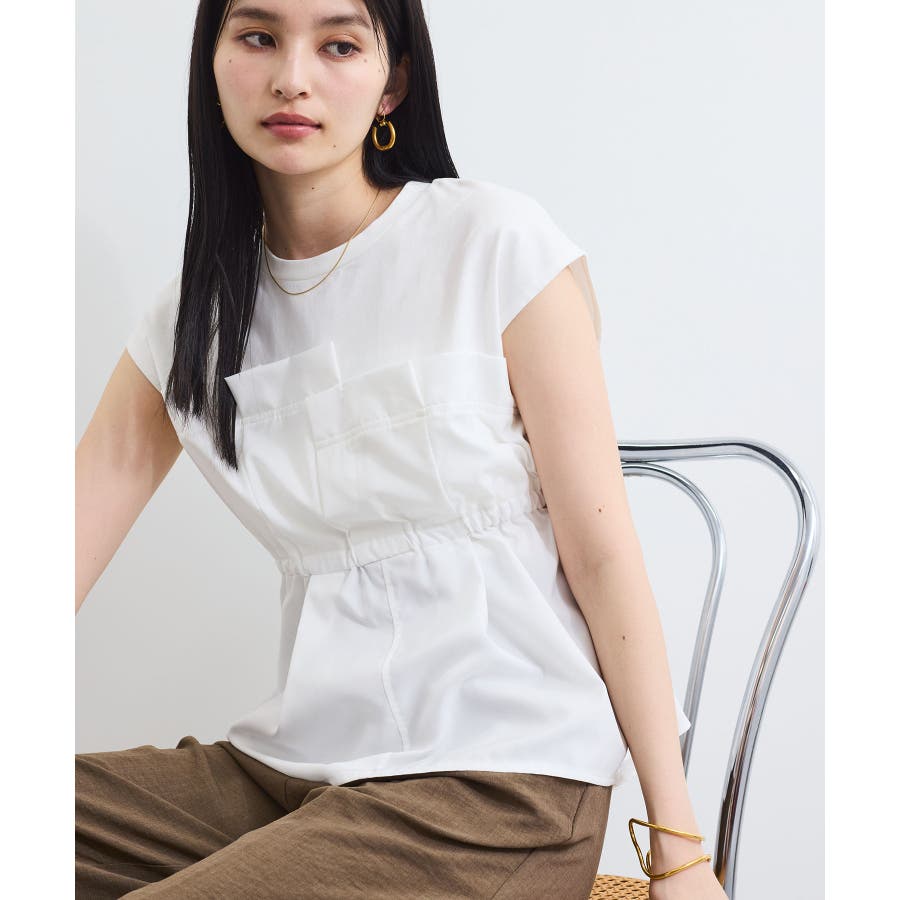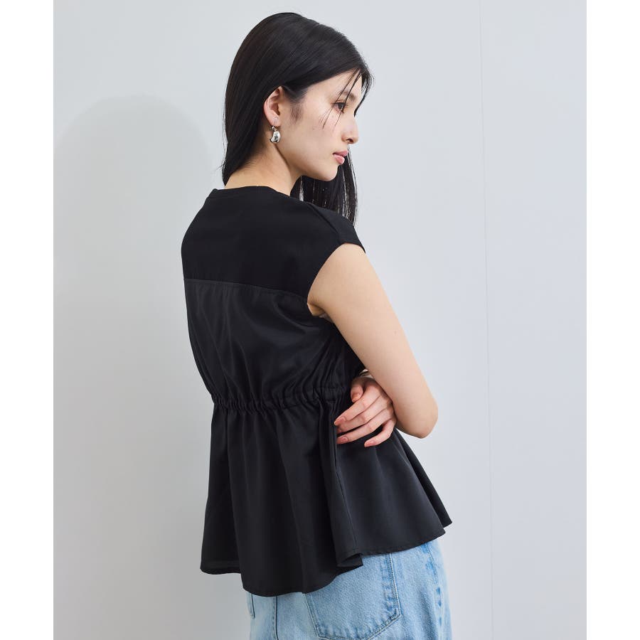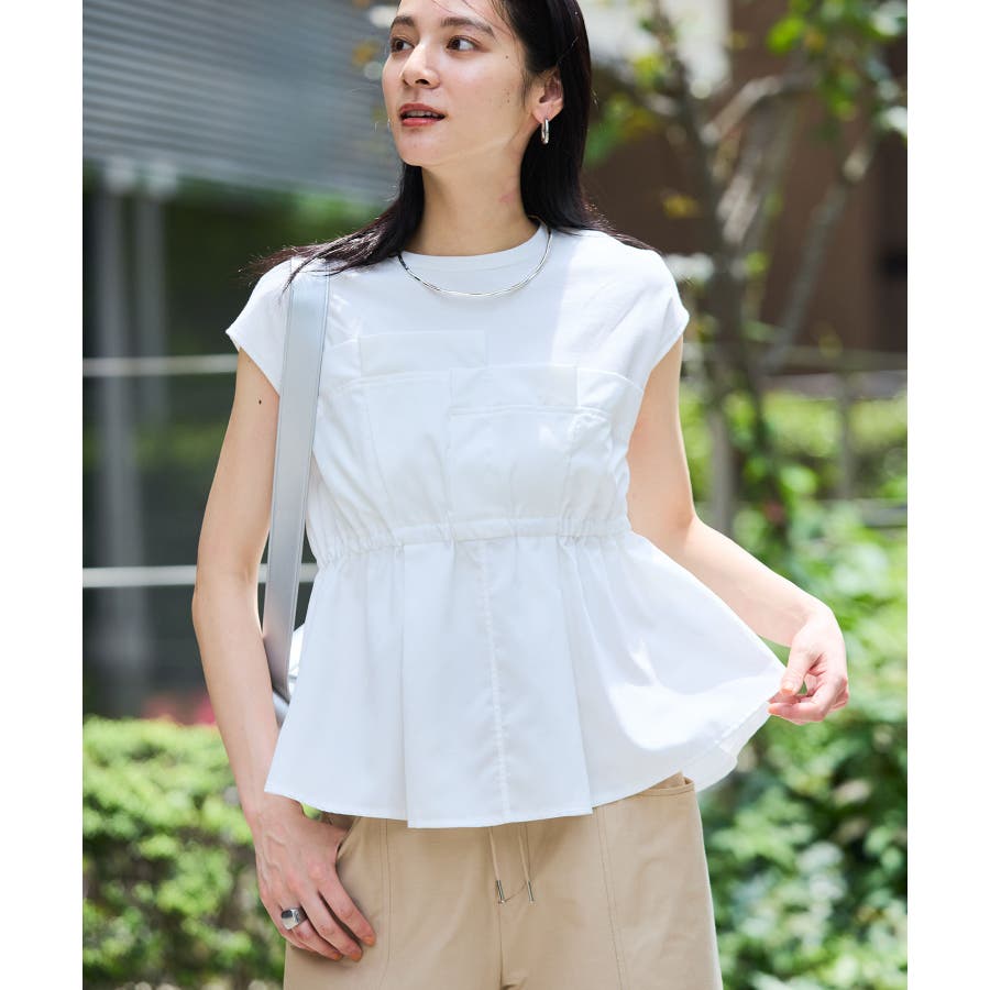 ・サラリと着れるカットソー生地とふわりと揺れる布帛の異素材が目を惹くデザインペプラムトップス。