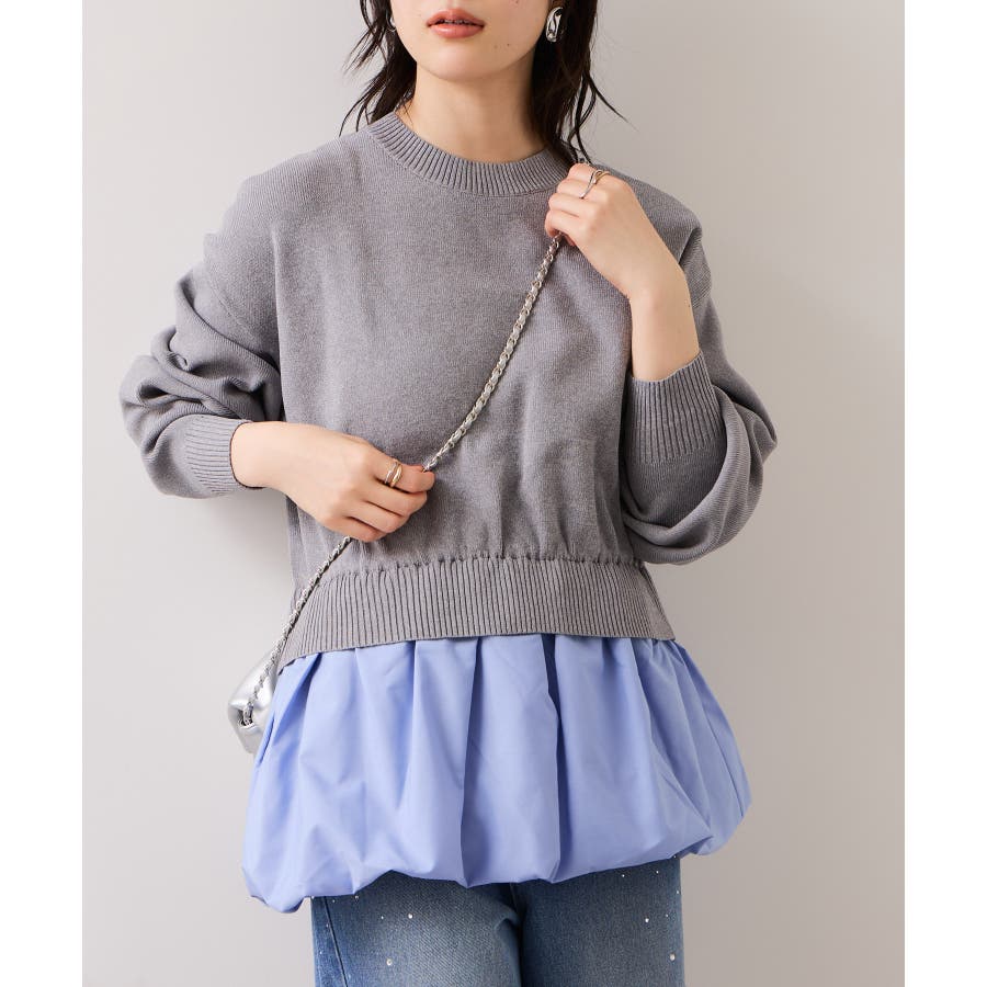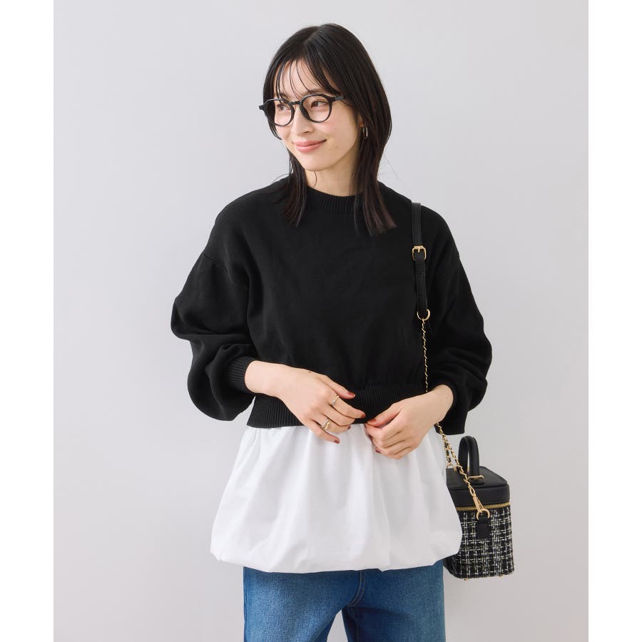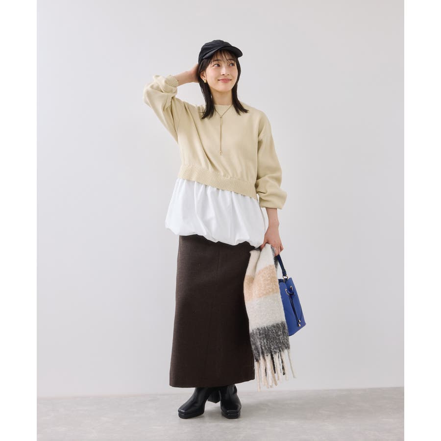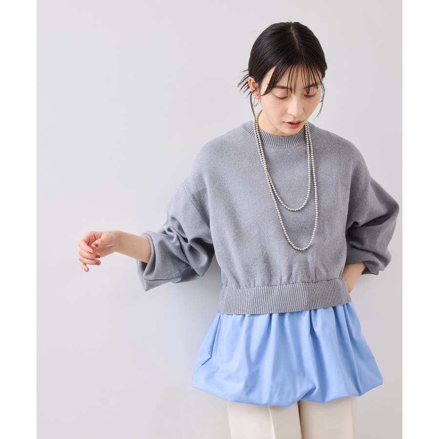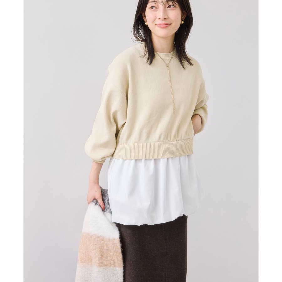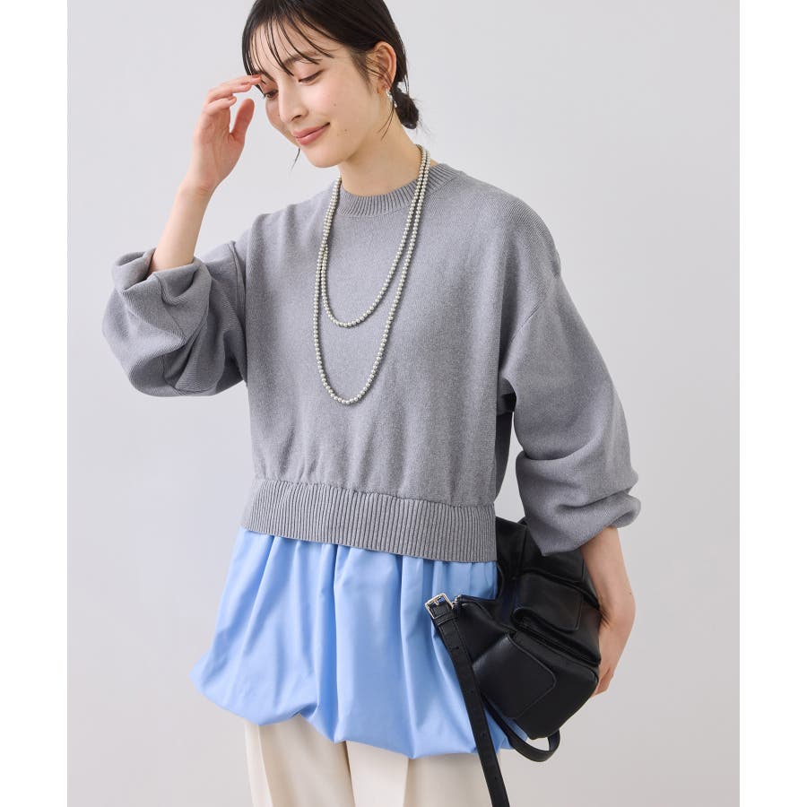 ニットとシャツをドッキングした、1枚でレイヤードスタイルが楽しめるトップス。上身頃はコンパクト見えするニット、裾には布帛シャツを組み合わせることでメリハリをプラスしました。ドロップショルダーのゆるっと感がリラックスムードを演出しつつ、シャツ裾のふんわり広がるシルエットが女性らしさを引き立てます。