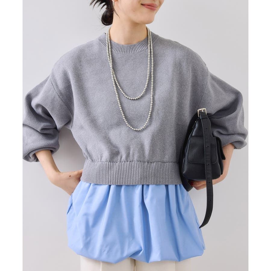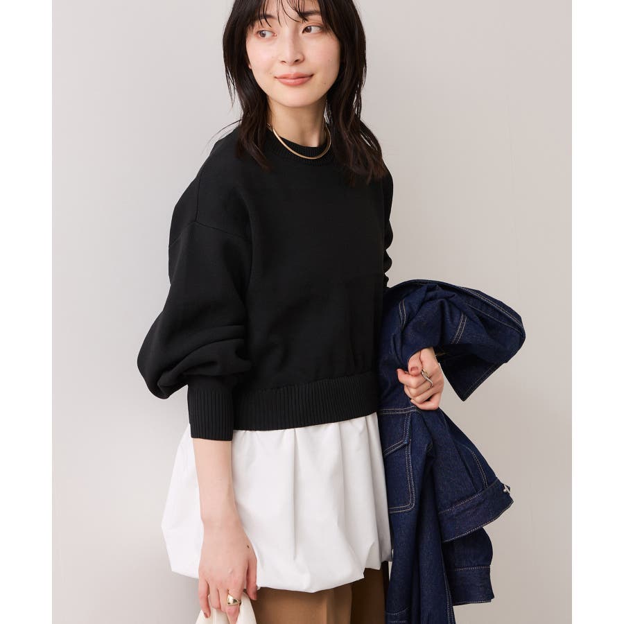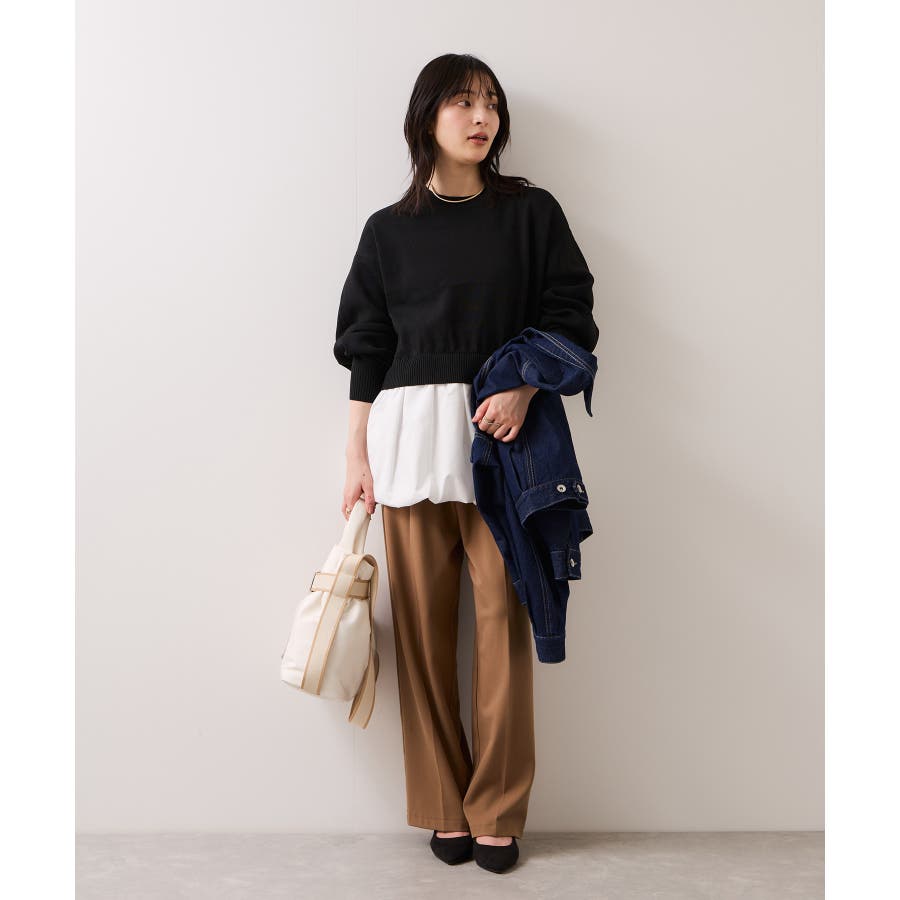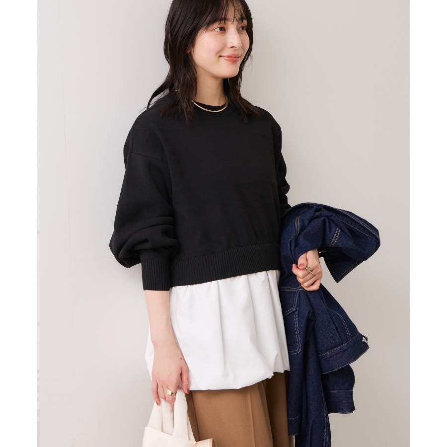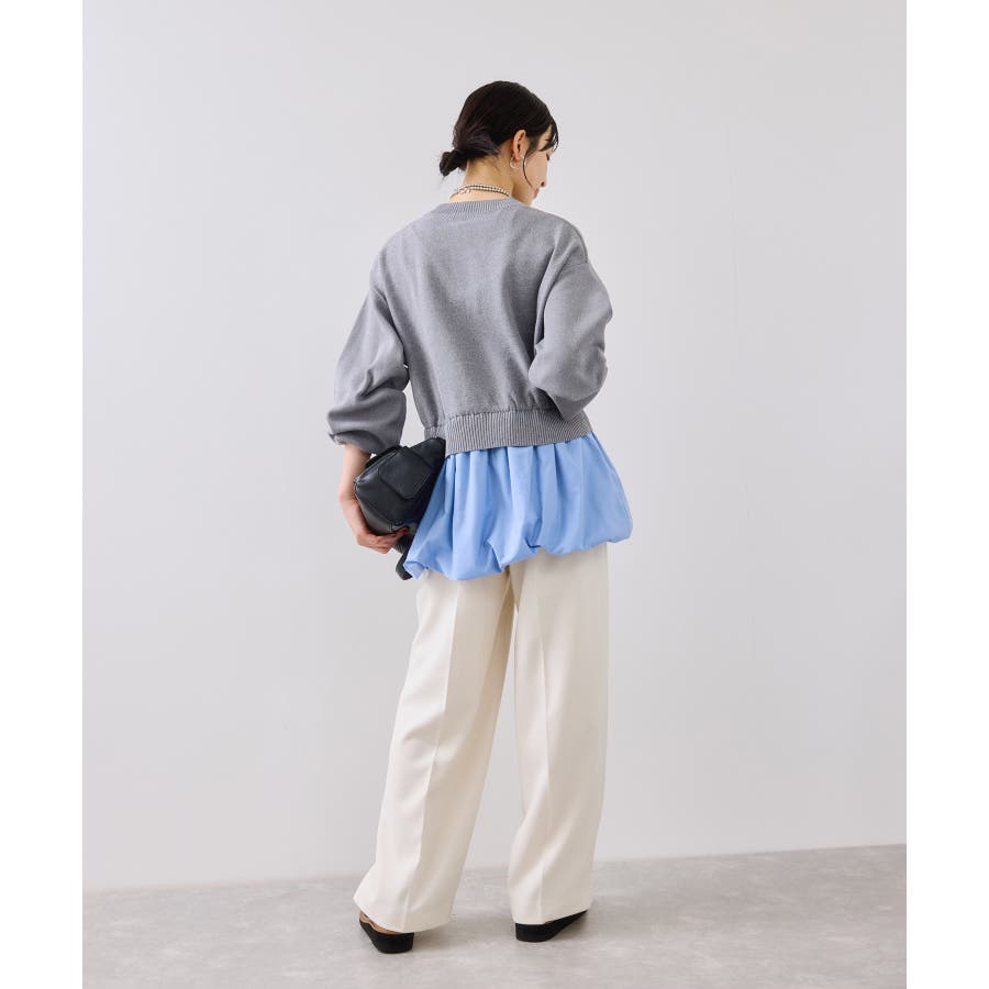 ニットとシャツをドッキングした、1枚でレイヤードスタイルが楽しめるトップス。上身頃はコンパクト見えするニット、裾には布帛シャツを組み合わせることでメリハリをプラスしました。ドロップショルダーのゆるっと感がリラックスムードを演出しつつ、シャツ裾のふんわり広がるシルエットが女性らしさを引き立てます。