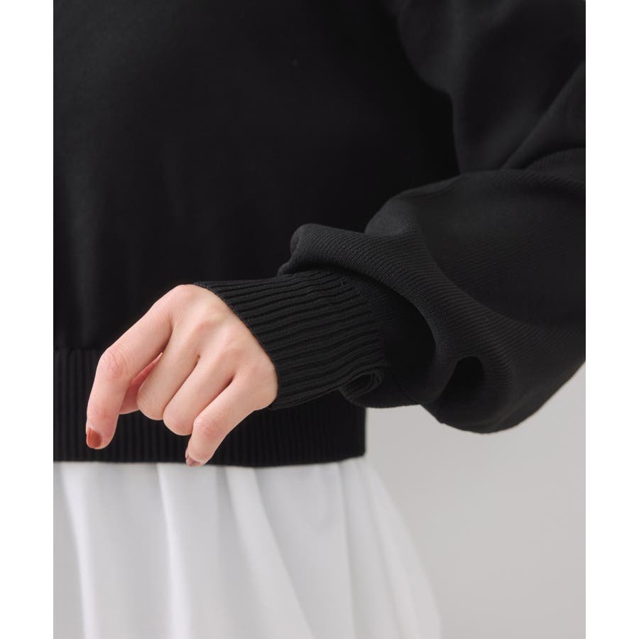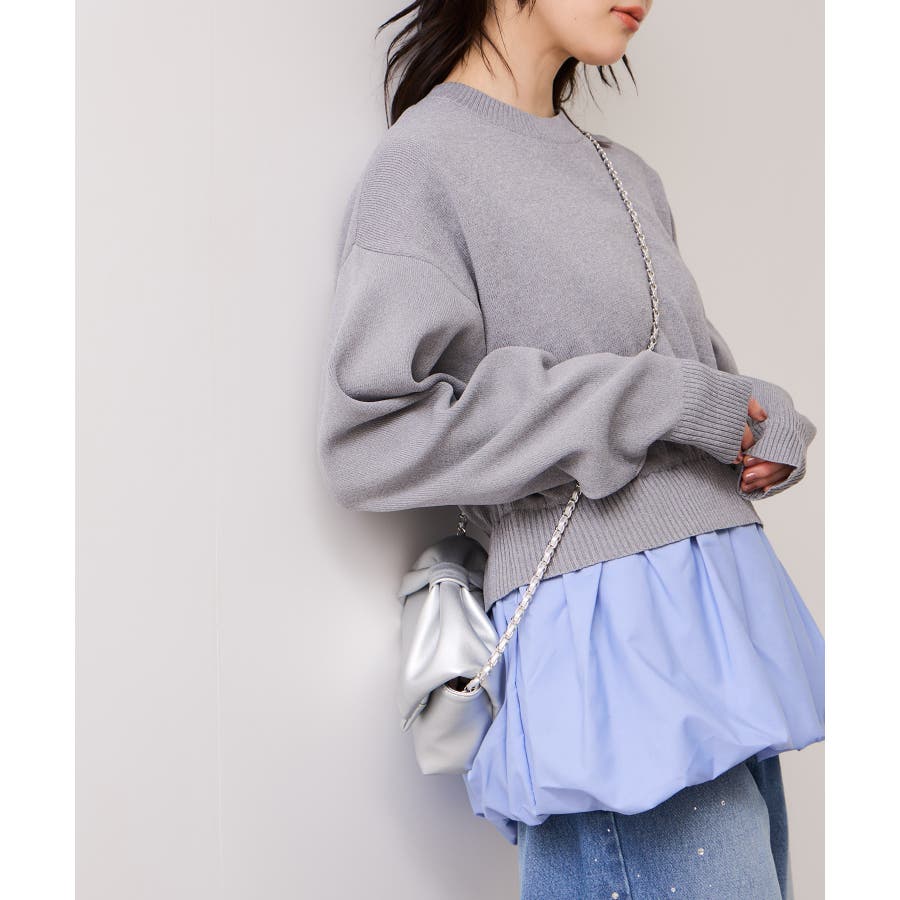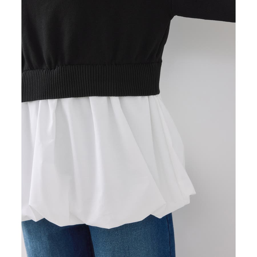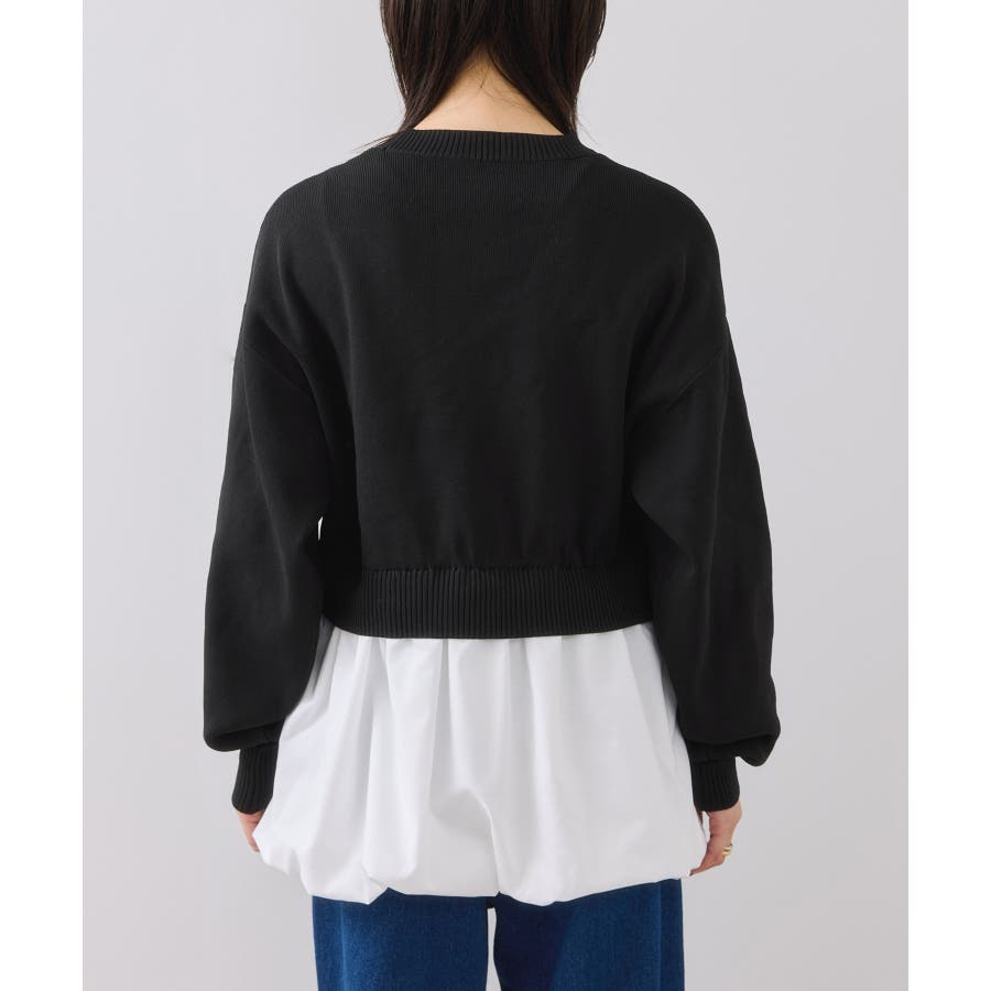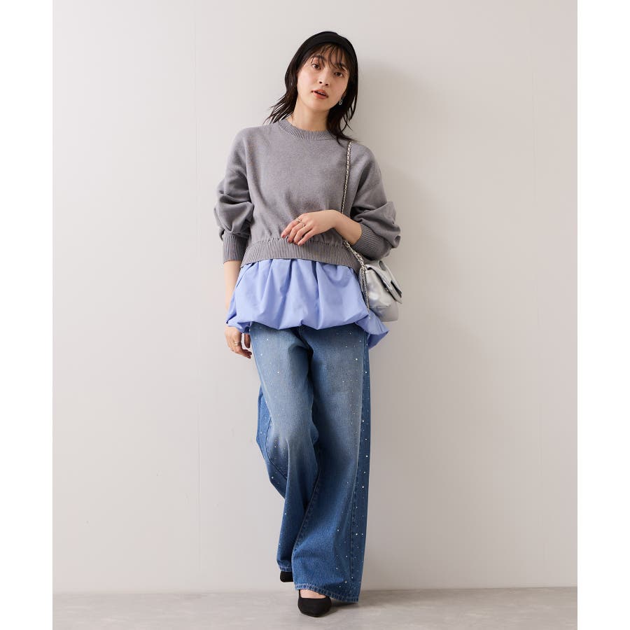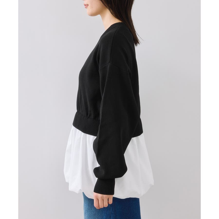ニットとシャツをドッキングした、1枚でレイヤードスタイルが楽しめるトップス。上身頃はコンパクト見えするニット、裾には布帛シャツを組み合わせることでメリハリをプラスしました。ドロップショルダーのゆるっと感がリラックスムードを演出しつつ、シャツ裾のふんわり広がるシルエットが女性らしさを引き立てます。