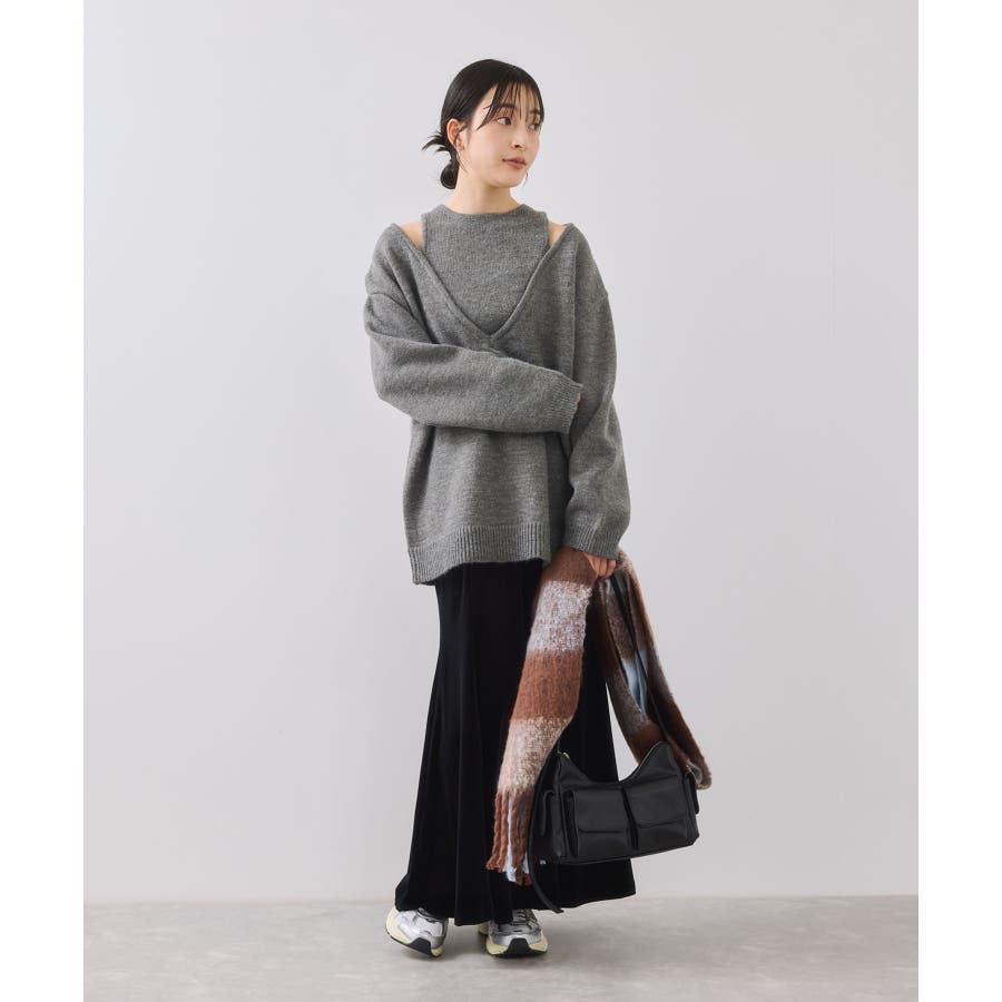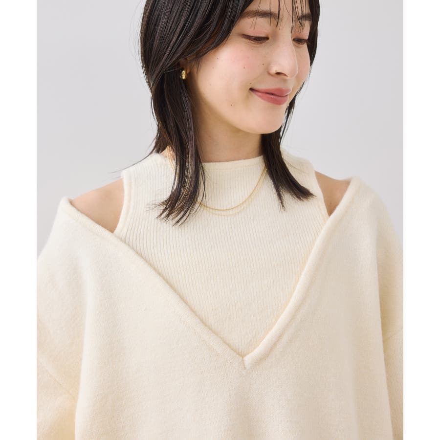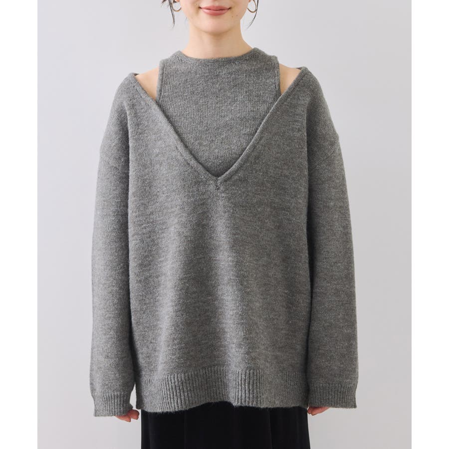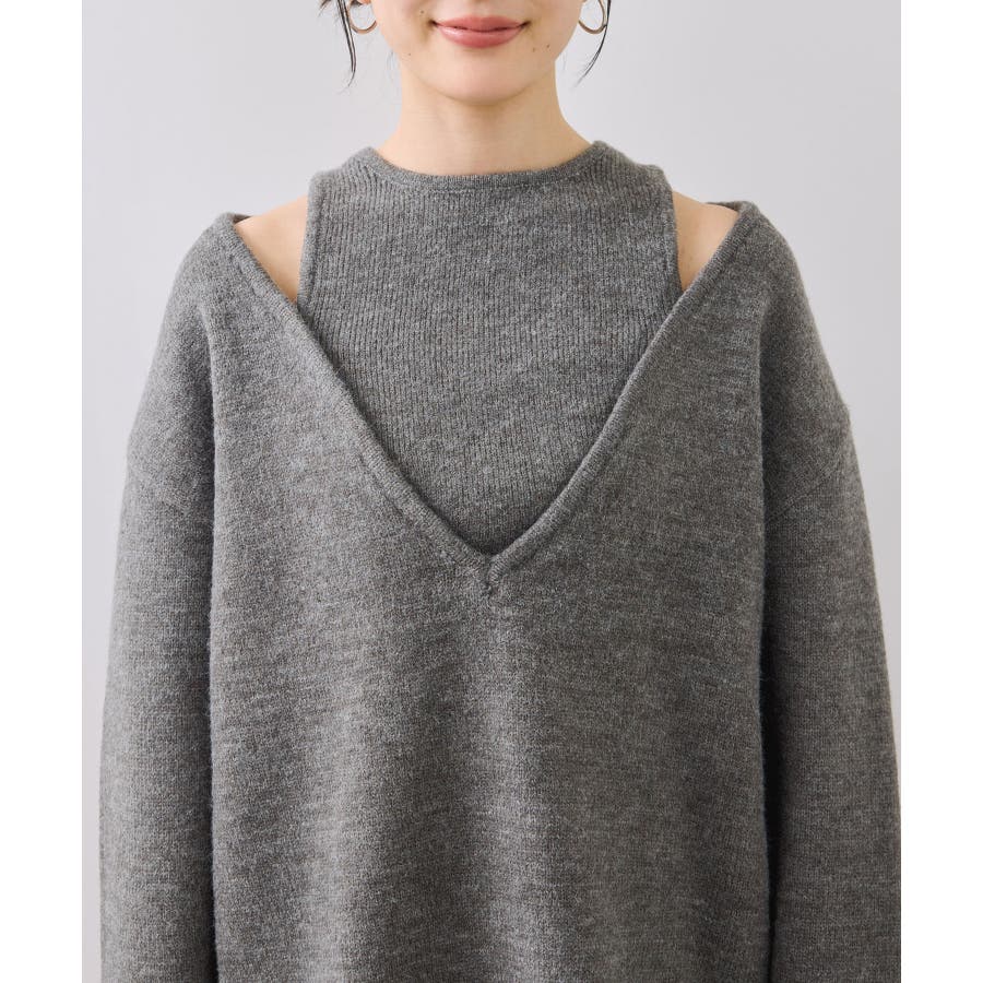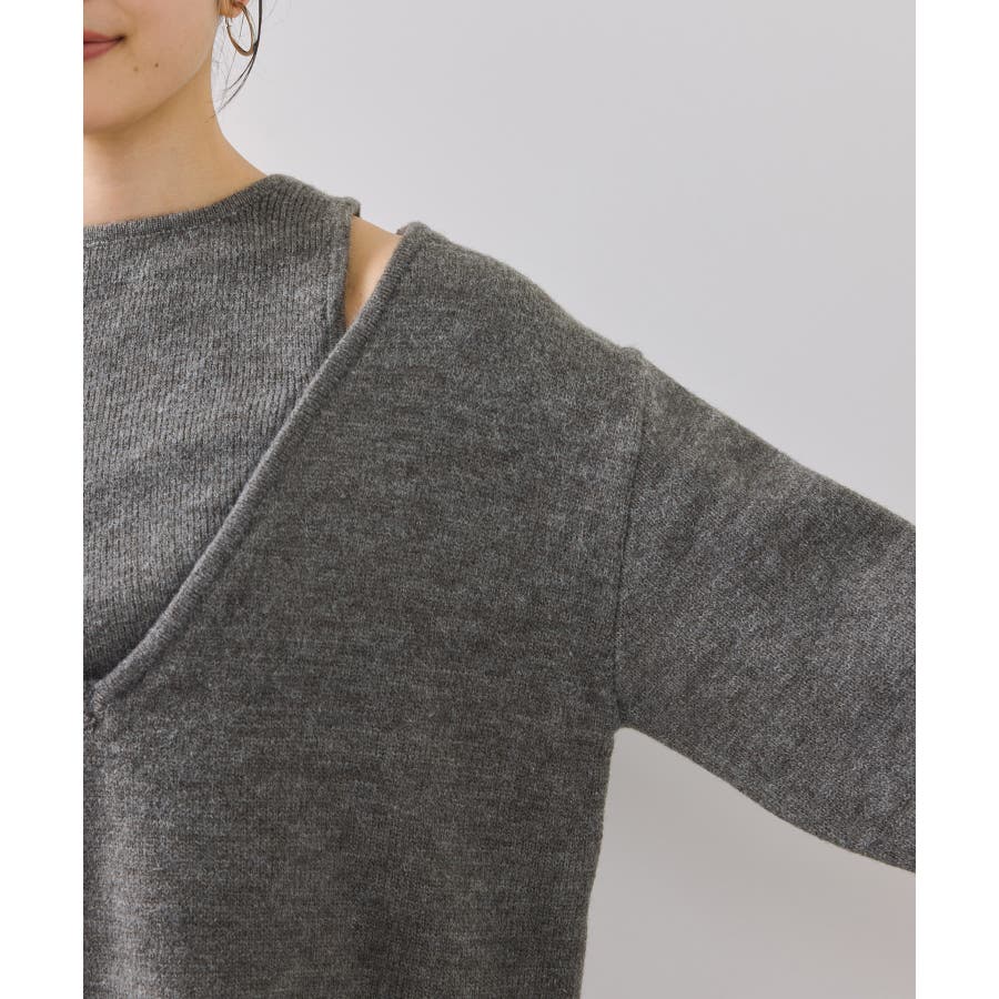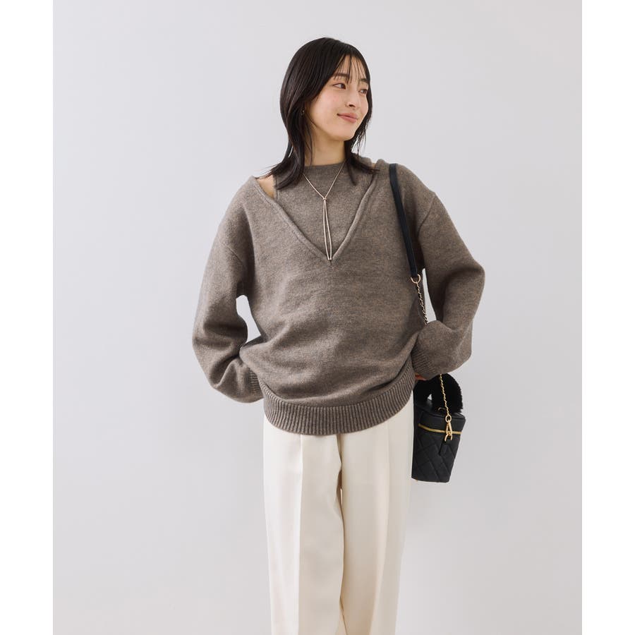 深めのVネックニットとアメスリリブを重ね着したようなレイヤード風デザイン。