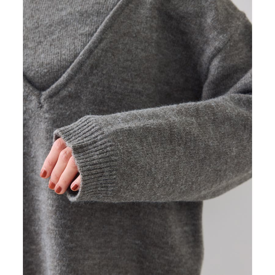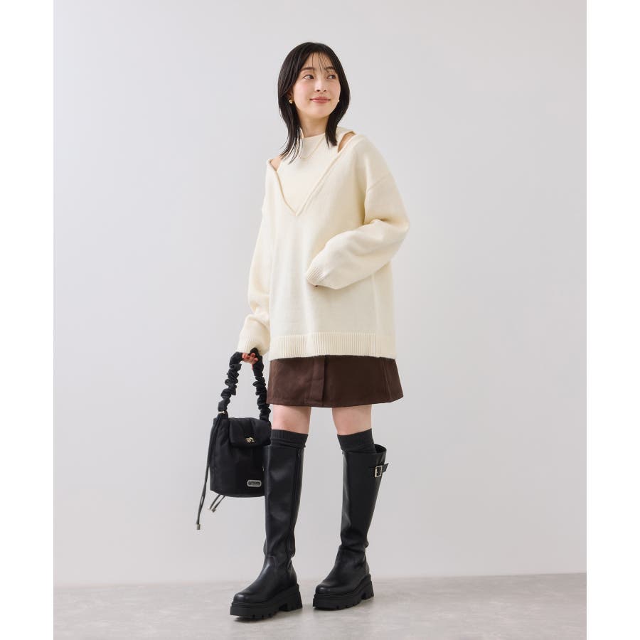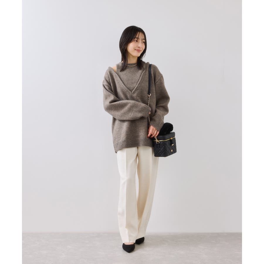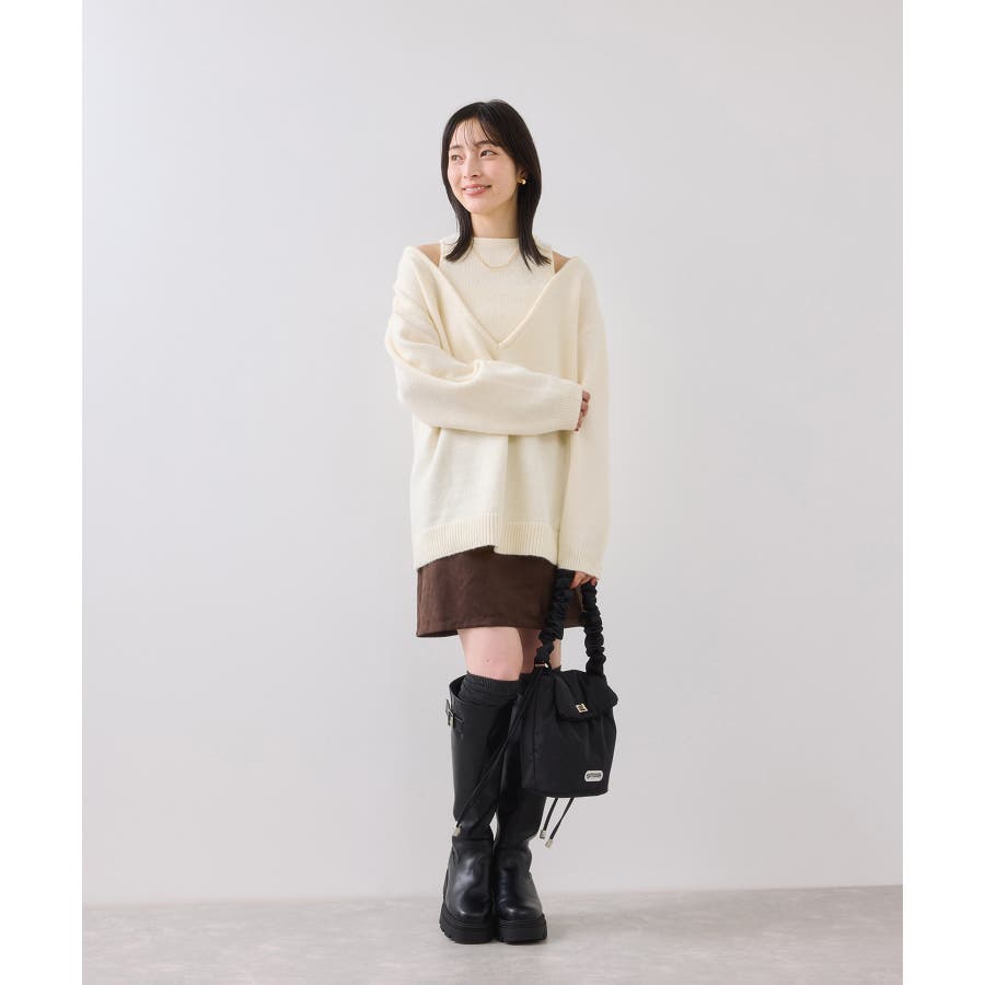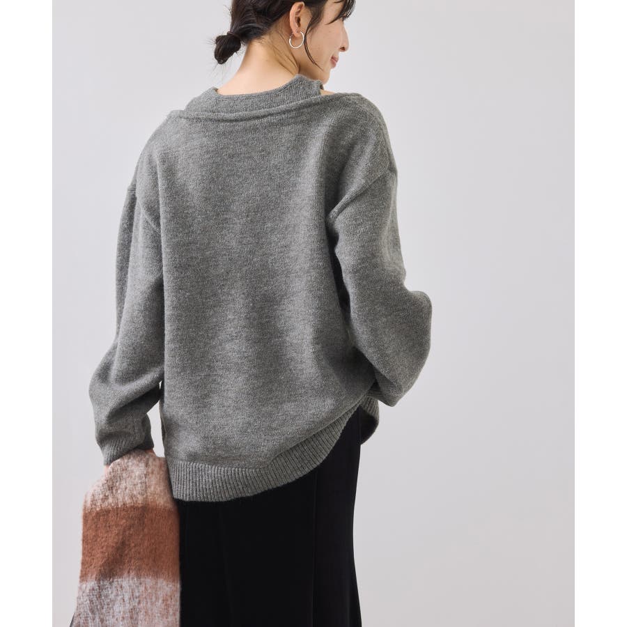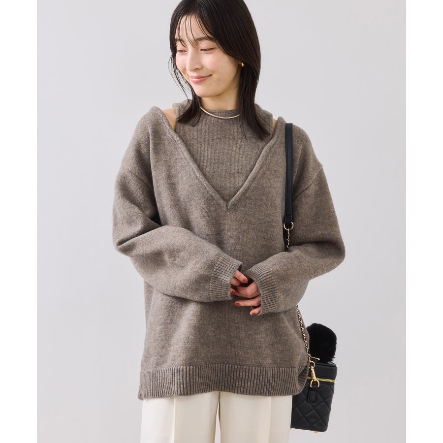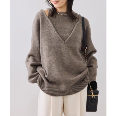 深めのVネックニットとアメスリリブを重ね着したようなレイヤード風デザイン。