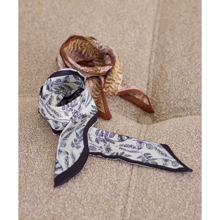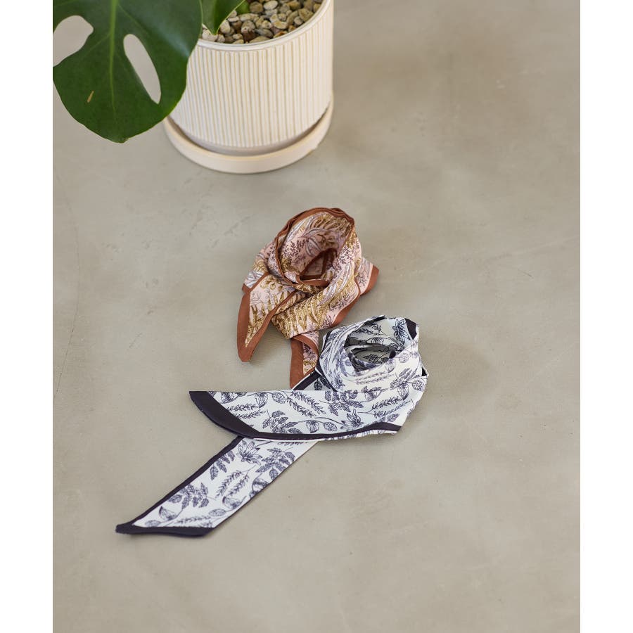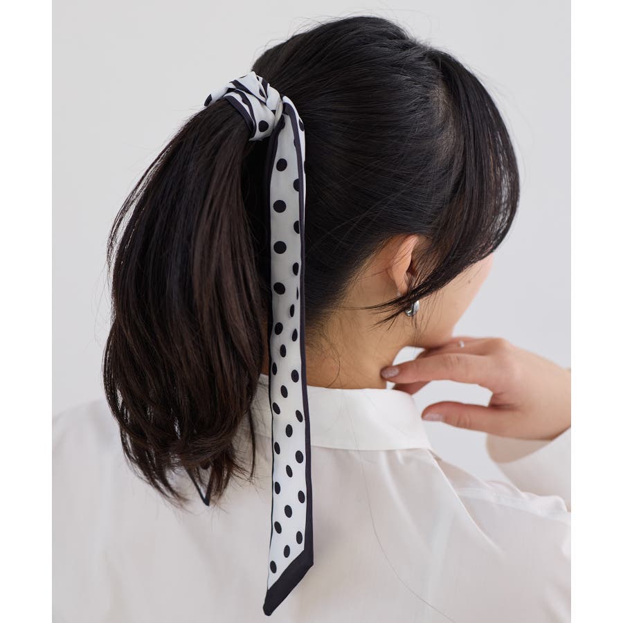 首元に軽く巻いてきれいめスタイルのポイントにしたり、バッグのハンドルに結んでアクセ感覚でプラスするのもおすすめ。ポニーテールやまとめ髪に取り入れて、さりげなくフェミニンさを添えるアレンジも楽しめます。