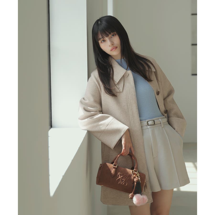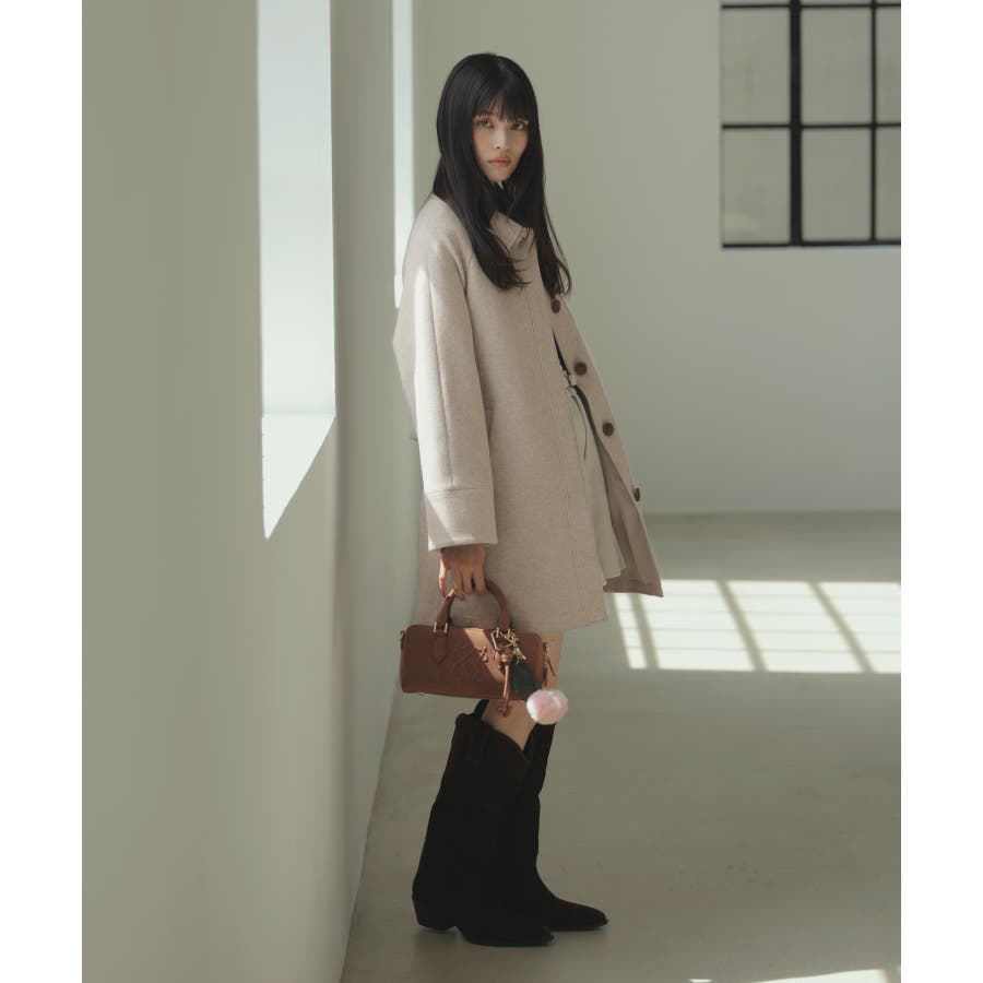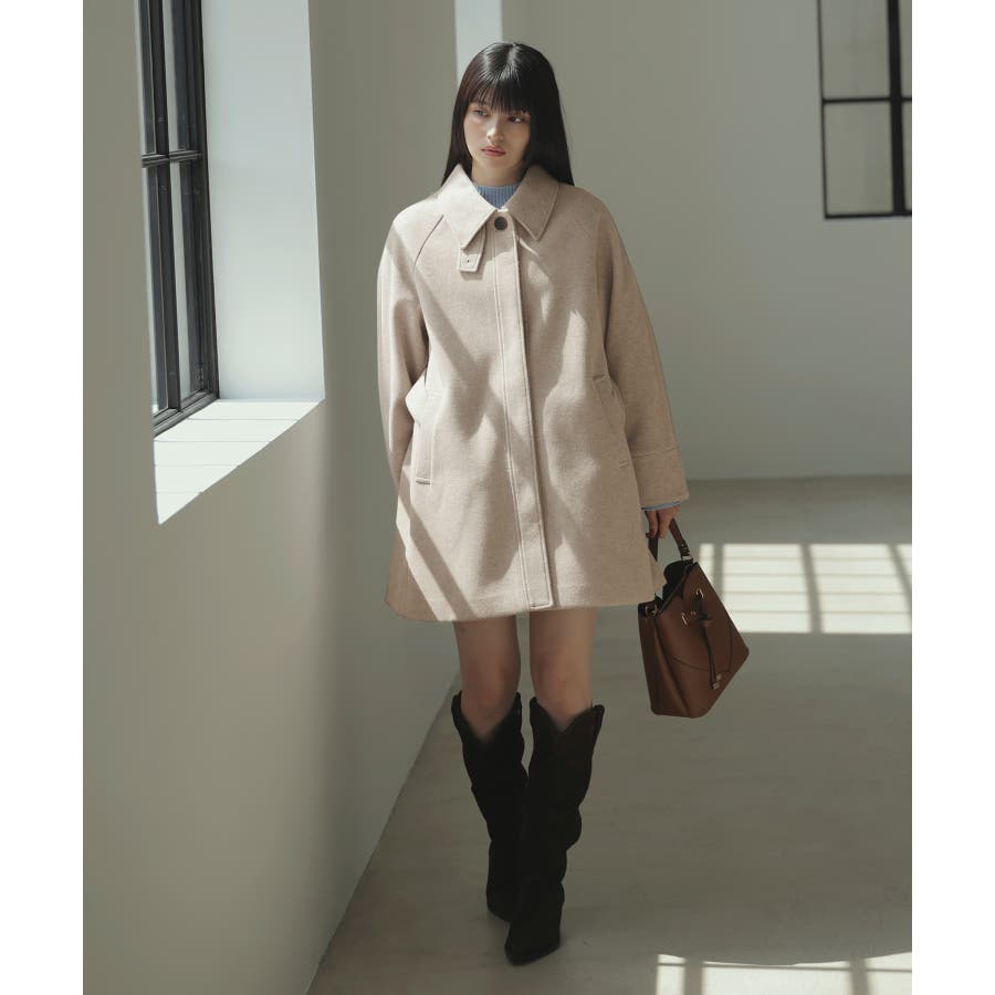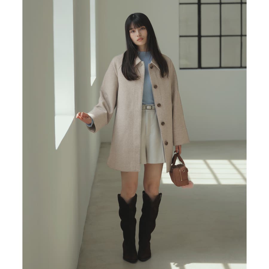 Aラインのシルエットを生かして、ミニボトムと合わせてコートメインのスタイリングがおすすめ。