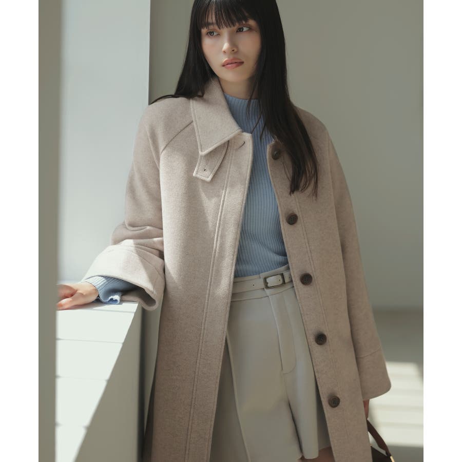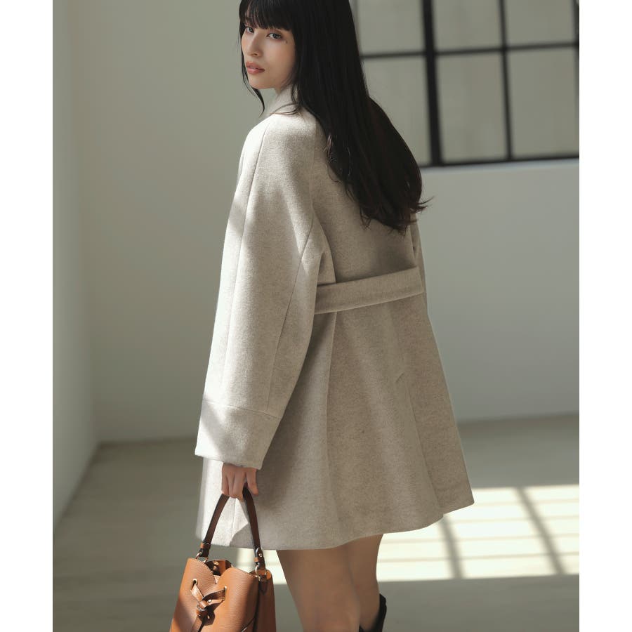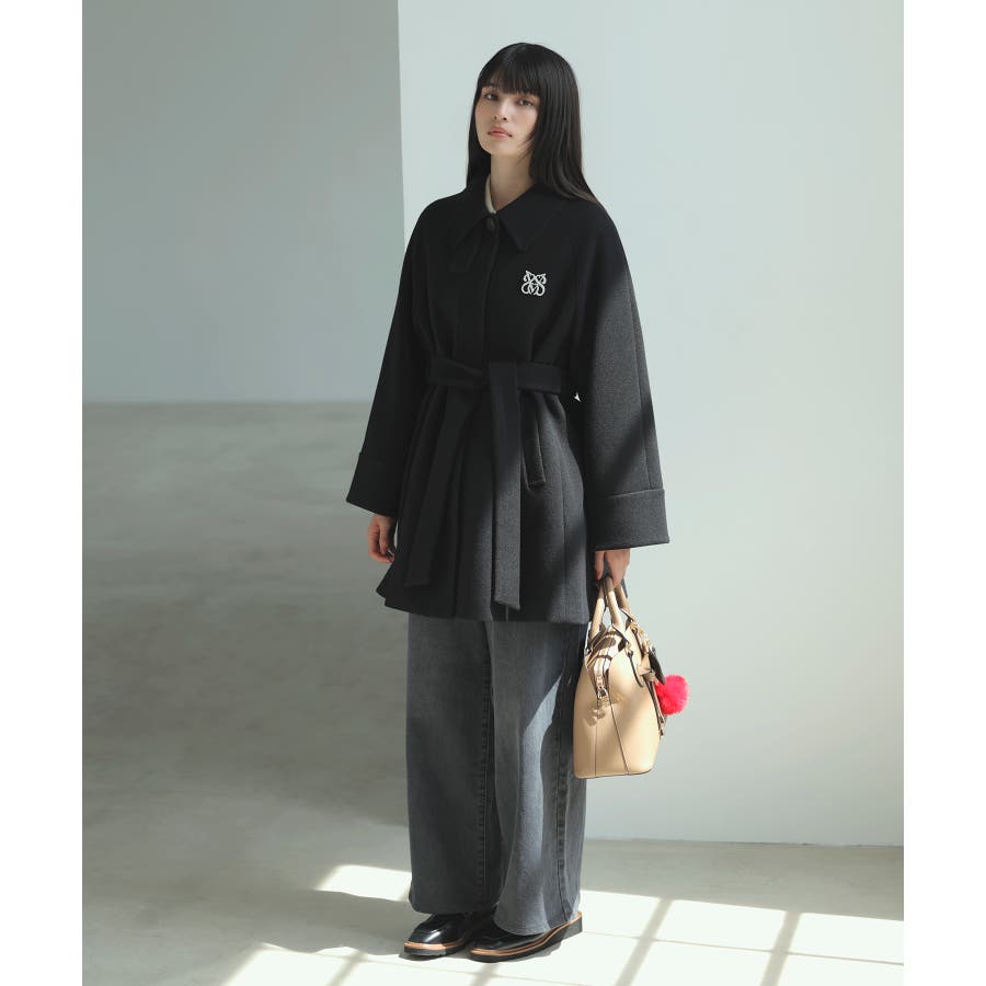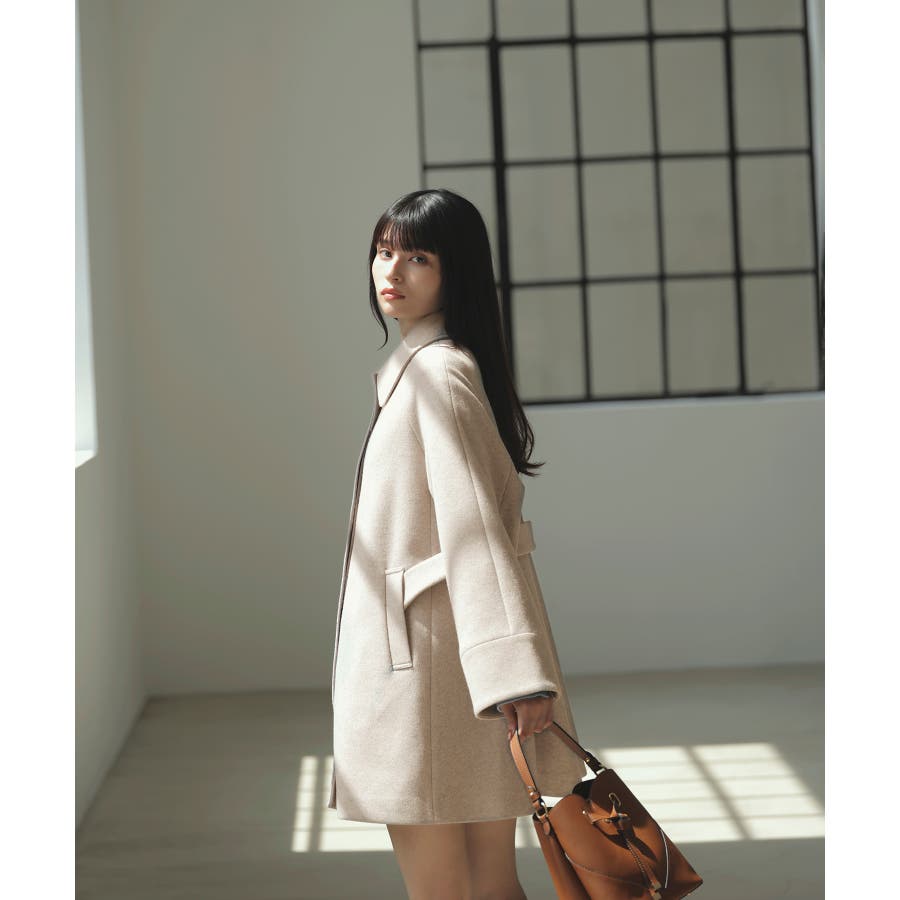 Aラインのシルエットを生かして、ミニボトムと合わせてコートメインのスタイリングがおすすめ。