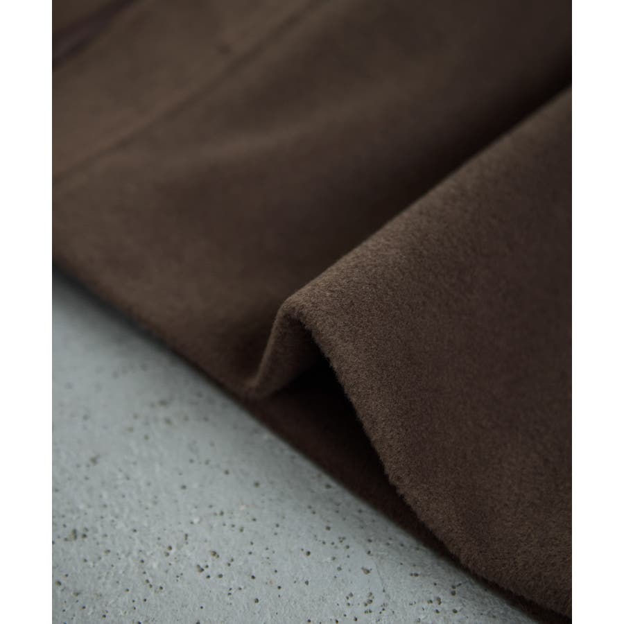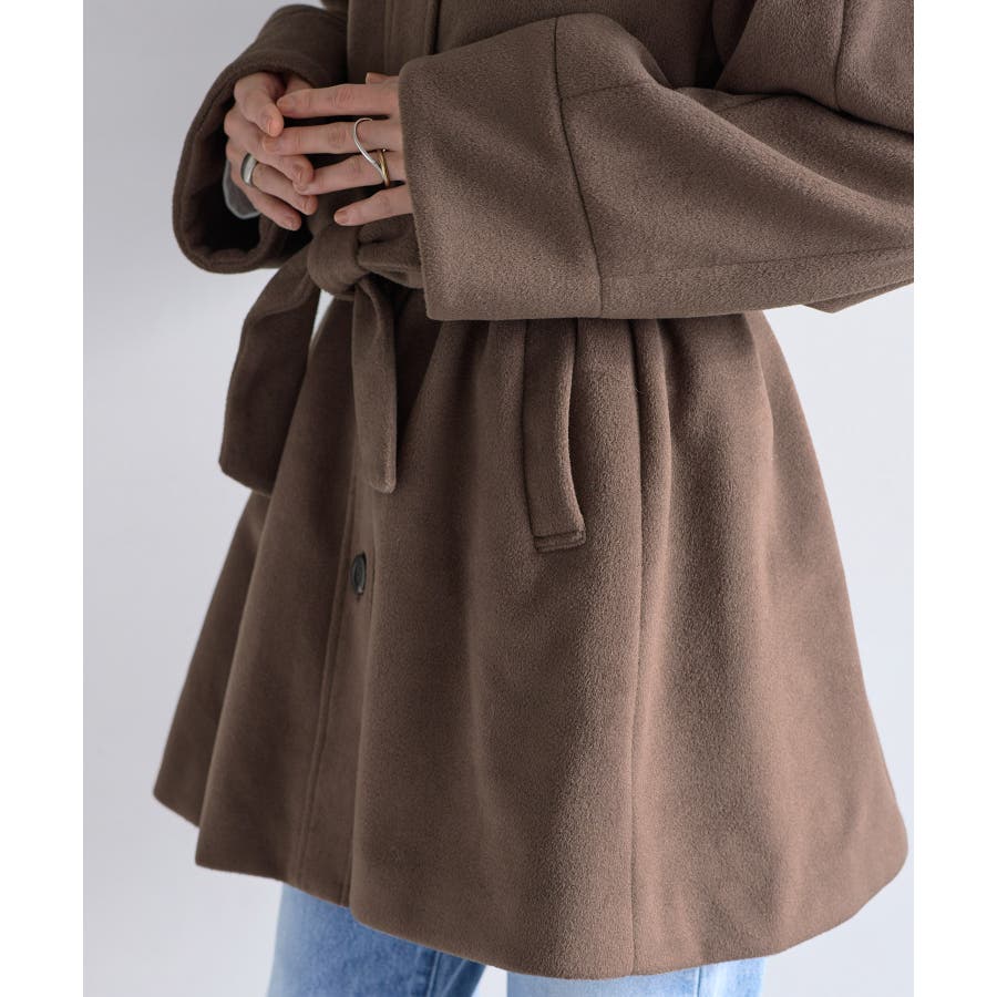 ウエストがシェイプできるように共地のベルトがついています。ハンサムなステンカラーなので、毛足短い素材をセレクトし可愛らしくなり過ぎず上品に仕上げました。
