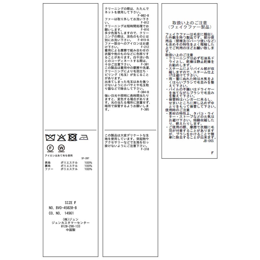| 素材 | (表地) ポリエステル 100% (裏地) ポリエステル 100% (ファー) ポリエステル 100% |