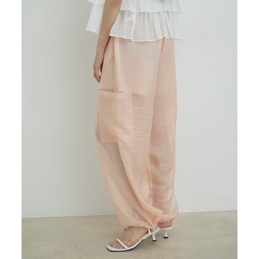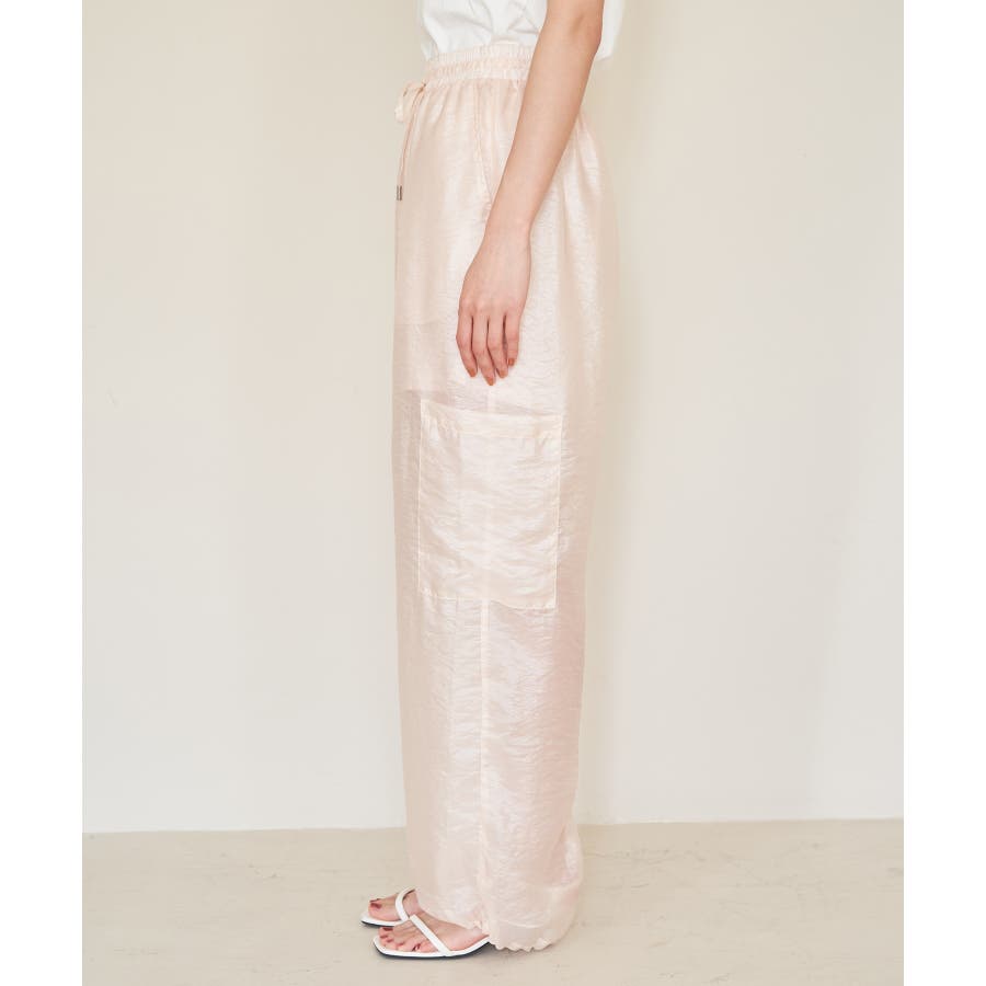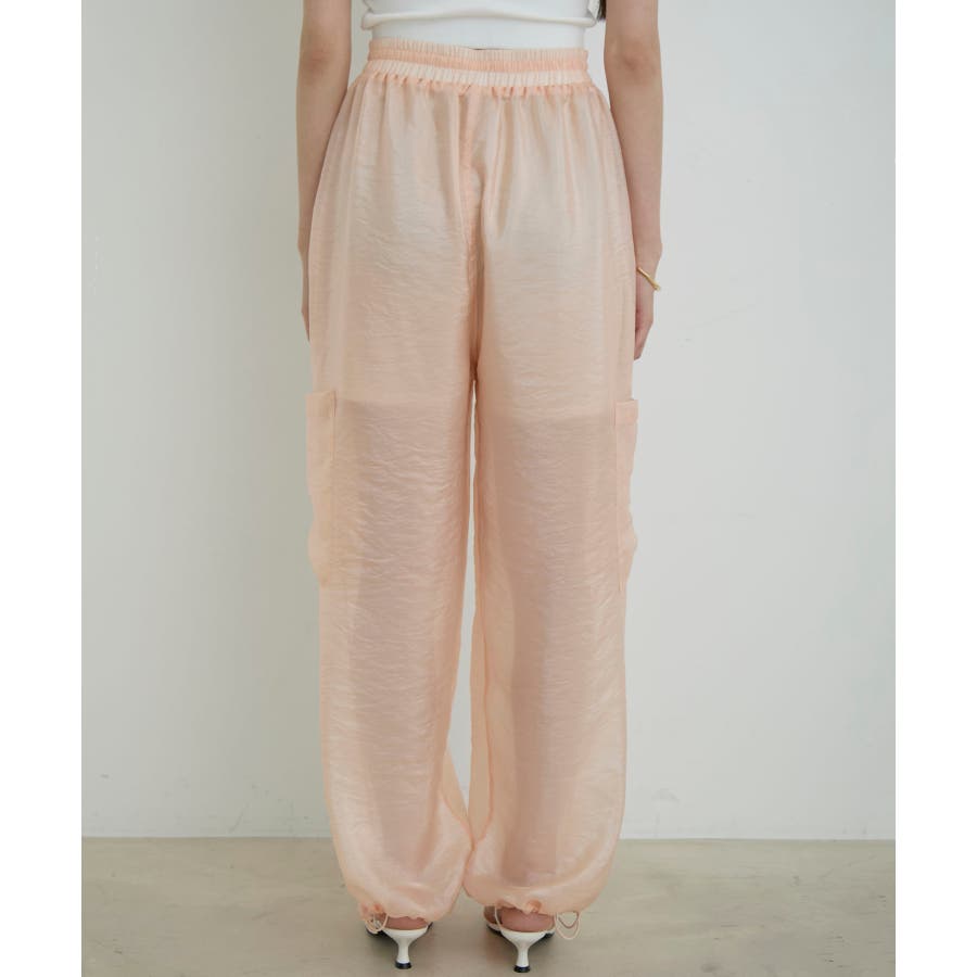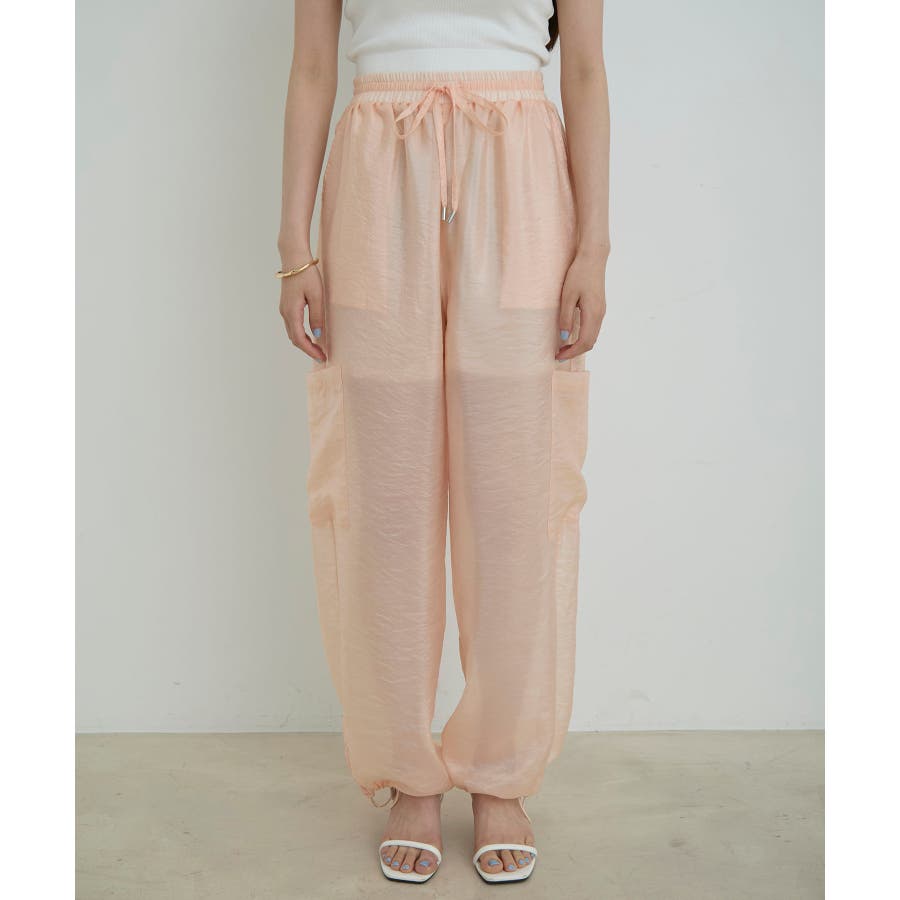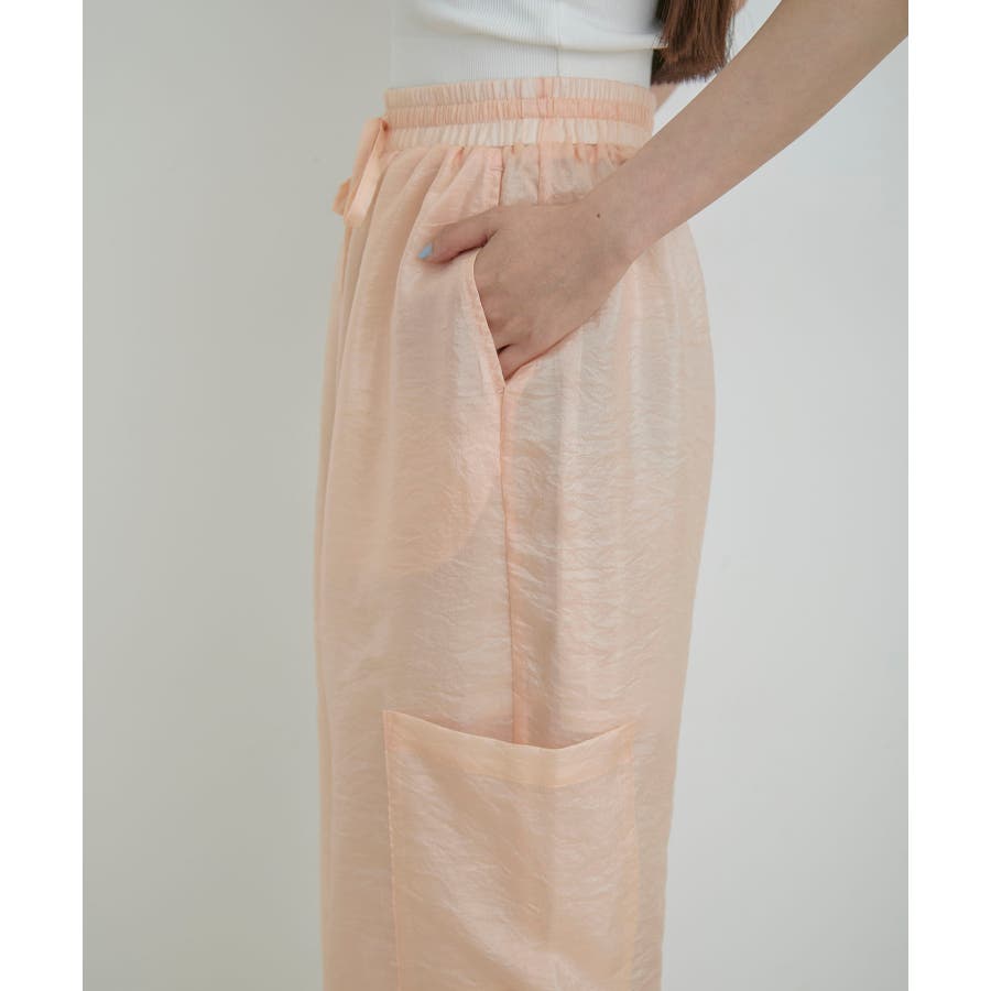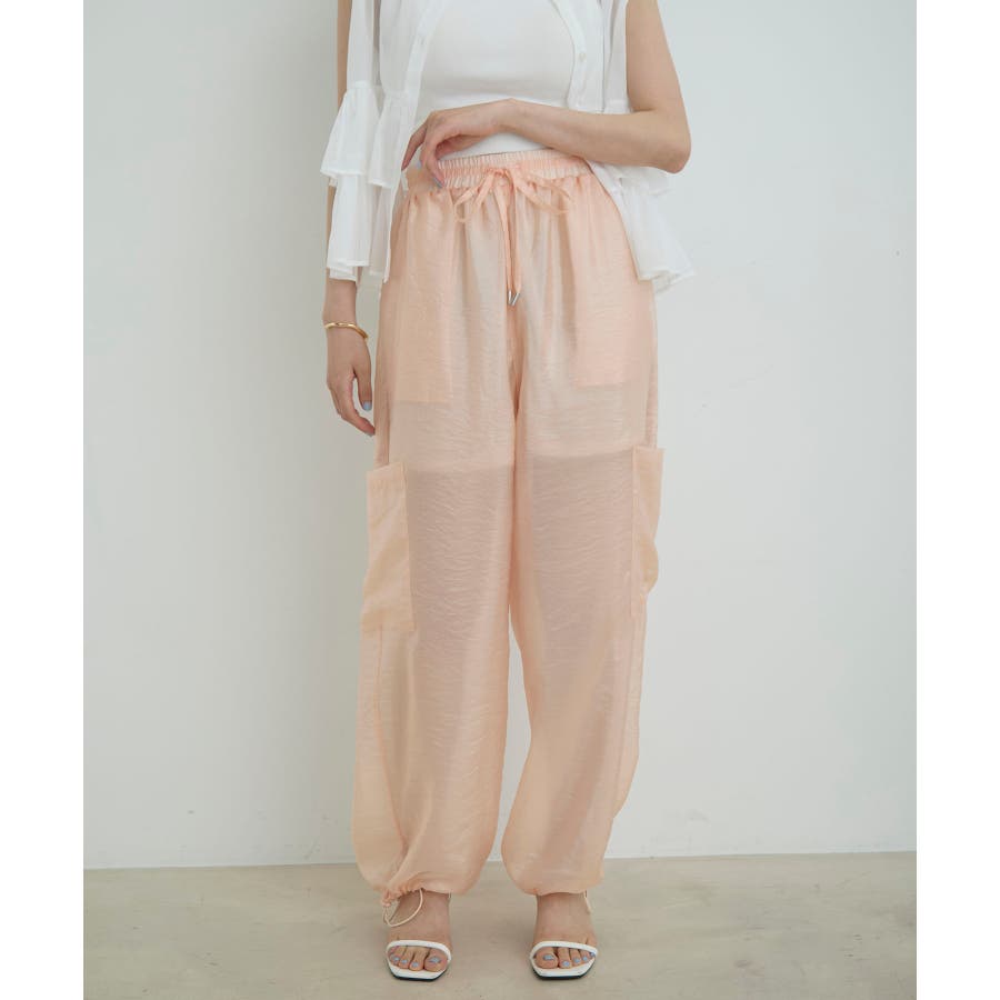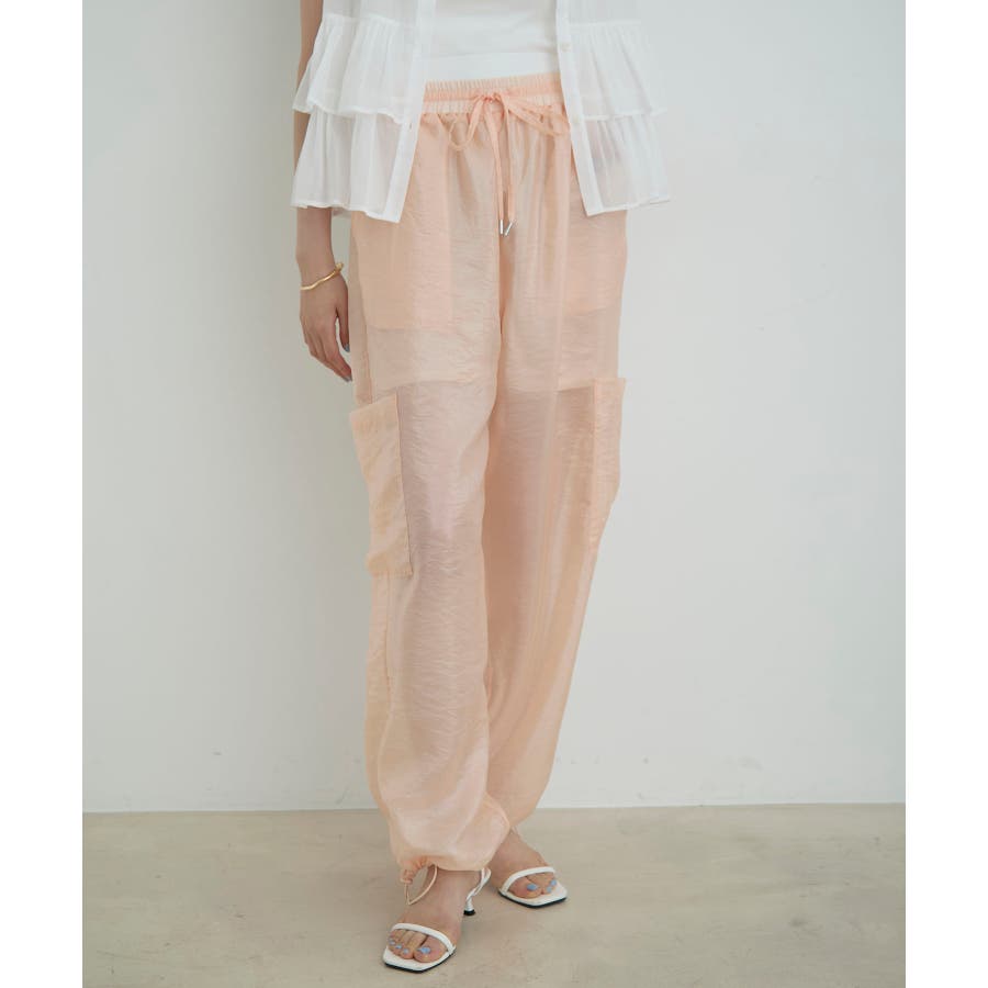◆2024春夏◆ 【デザイン・シルエット】 ウエストのオールゴム仕様がリラックス感もあり、シアー素材で夏のスタリングをオシャレにできるカーゴパンツです。