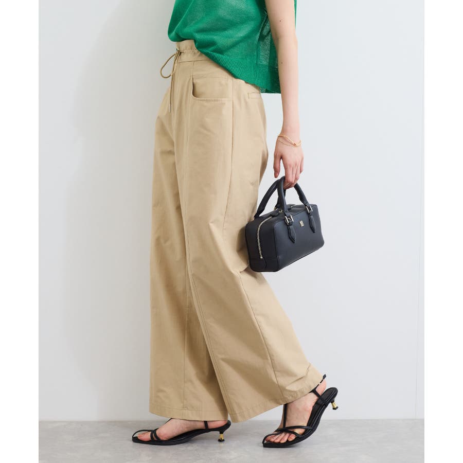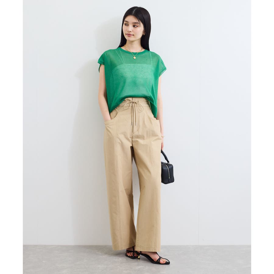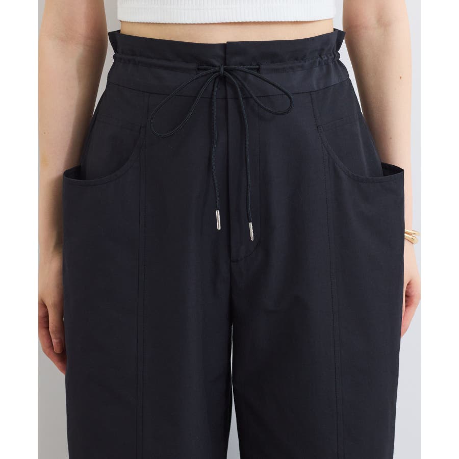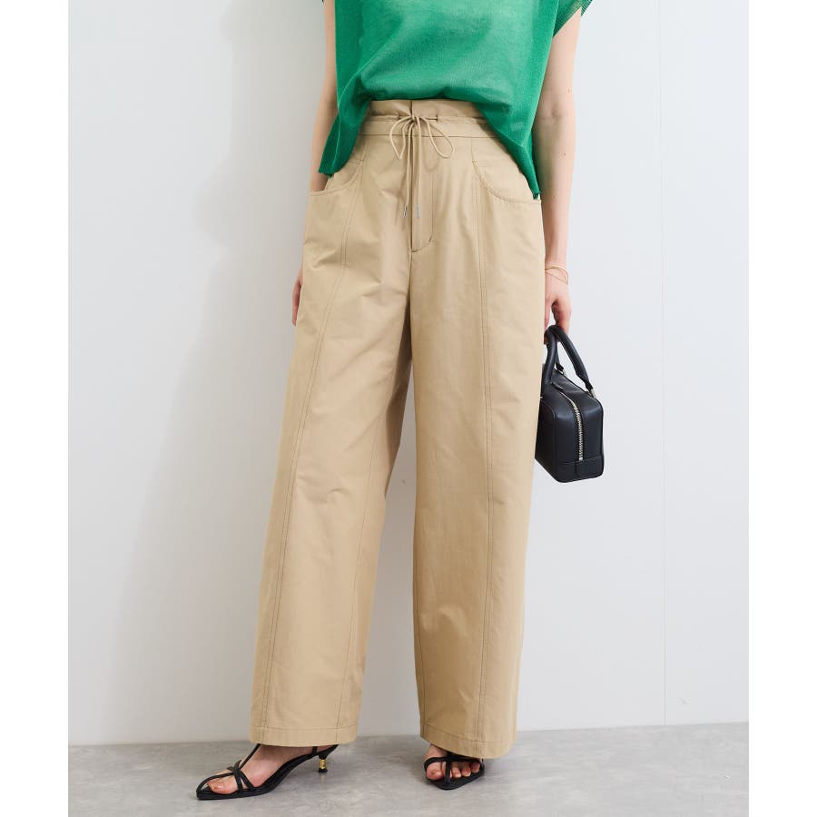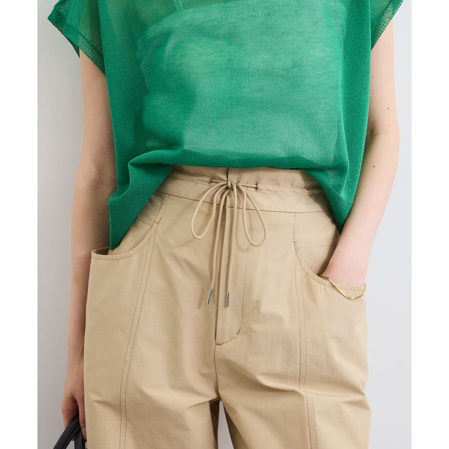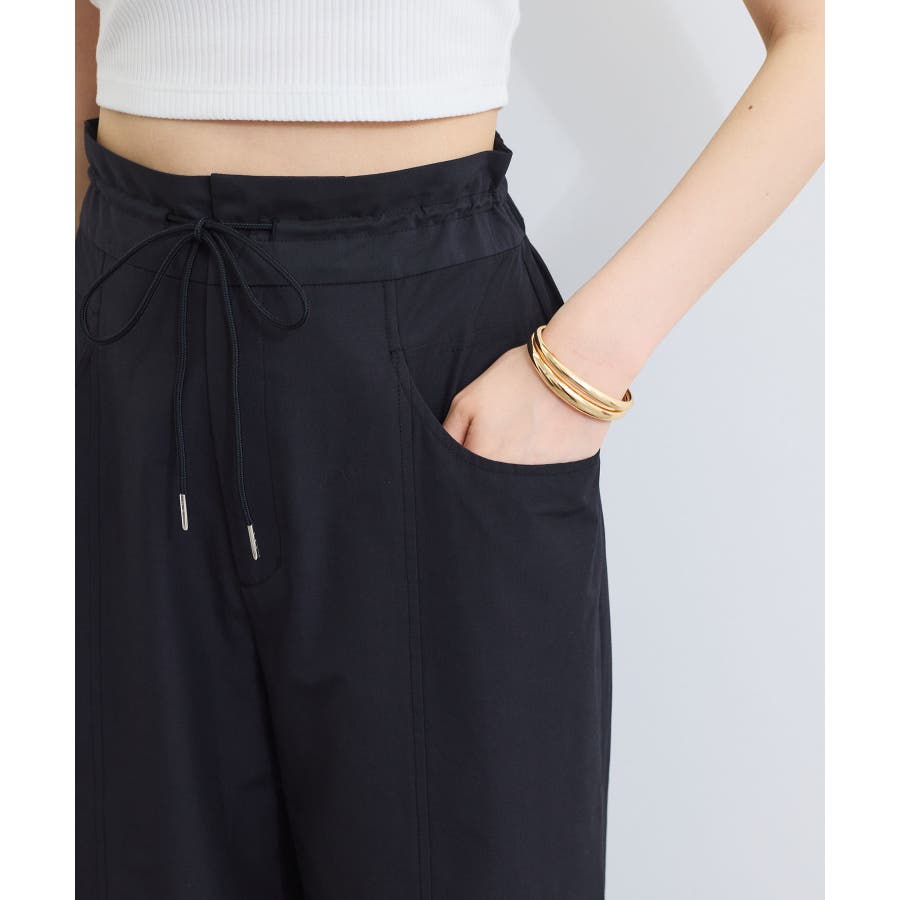 ウエスト周りはドロストコードで、バックにゴムを入れているのでフロントはすっきりとした印象に。