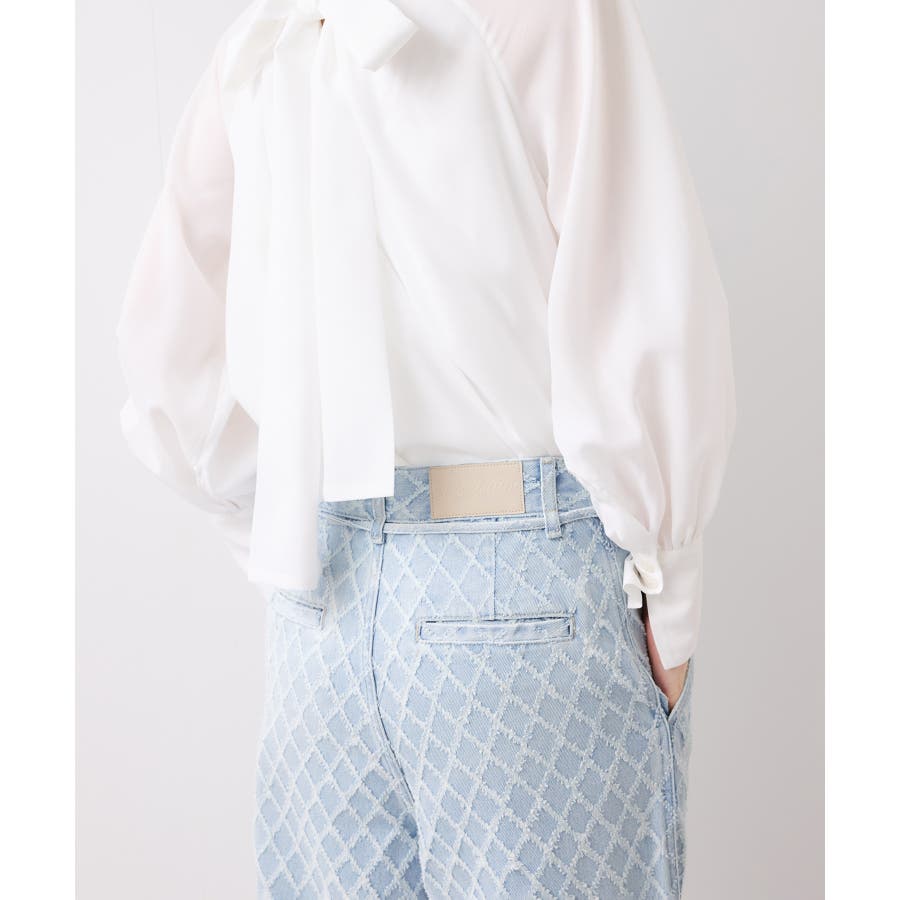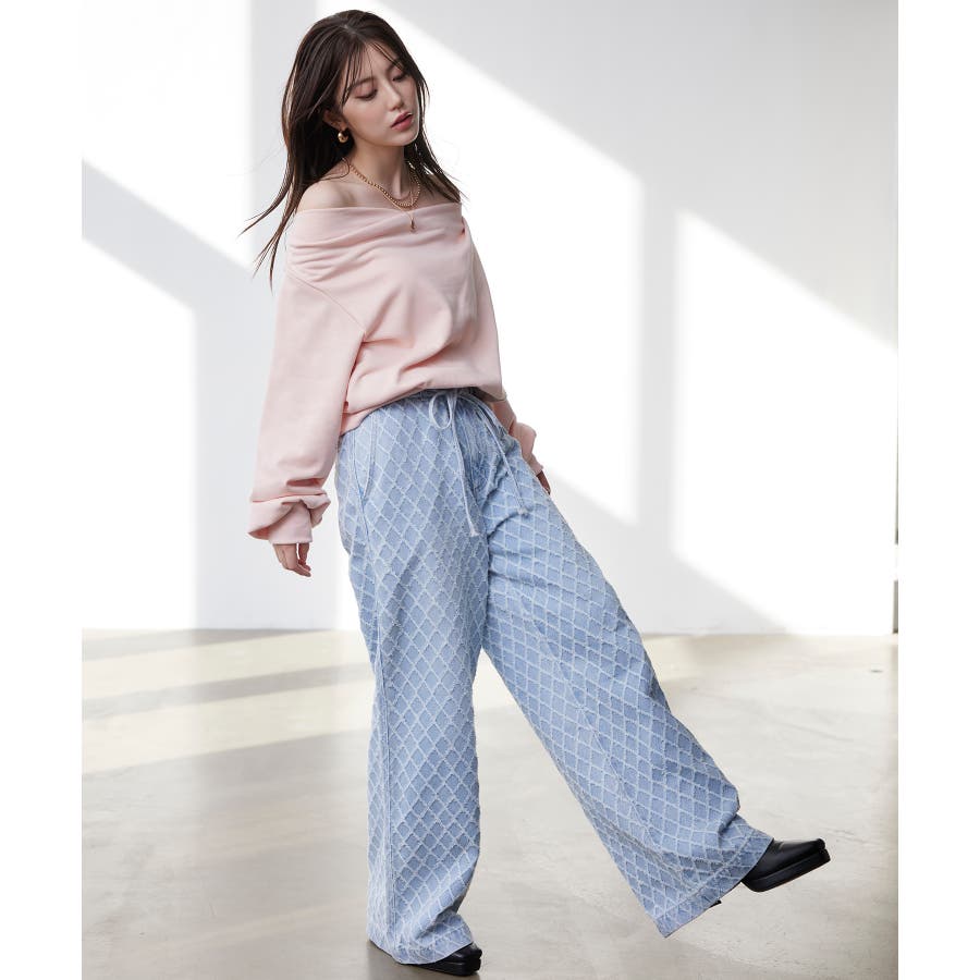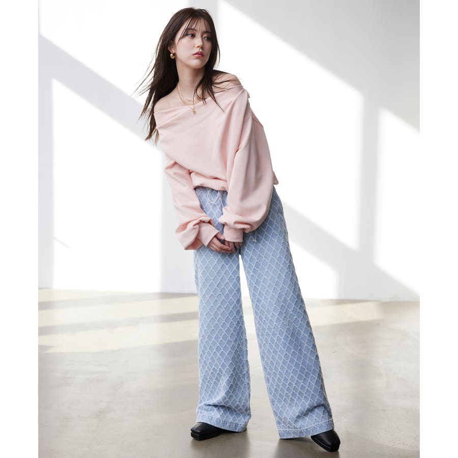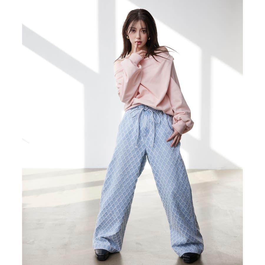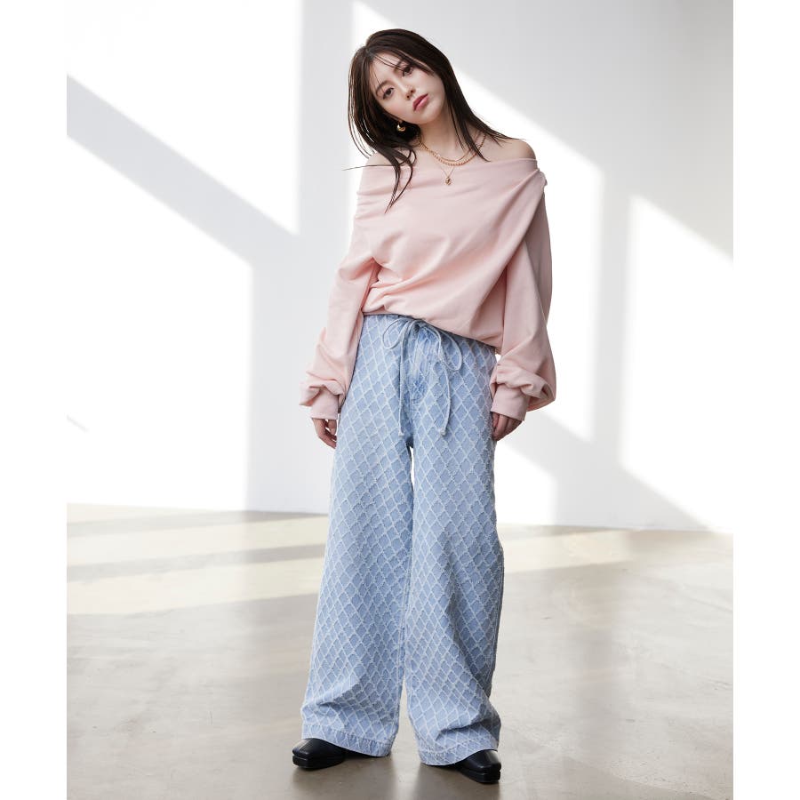 ・使いまわしの効くワイドシルエットのデニムにジャガード生地を使用し華やかでポイントになるデザインです。