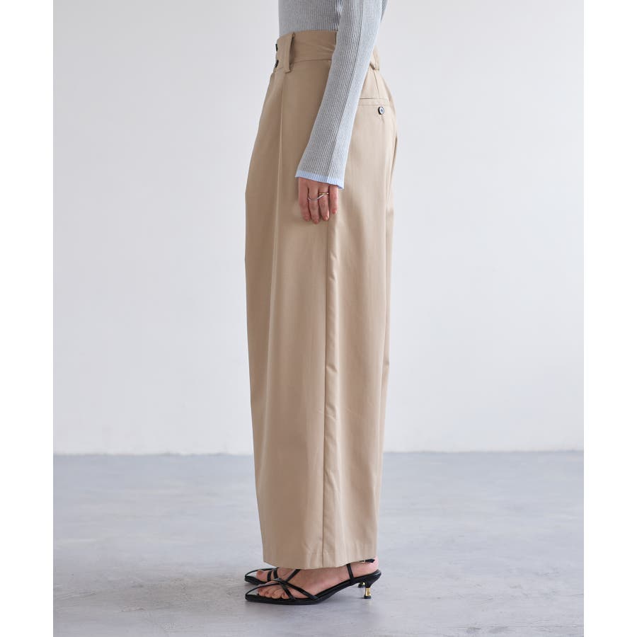 タックデザインのワイドシルエットなので、トップスはすっきりしたものと合わせるのがおすすめ!