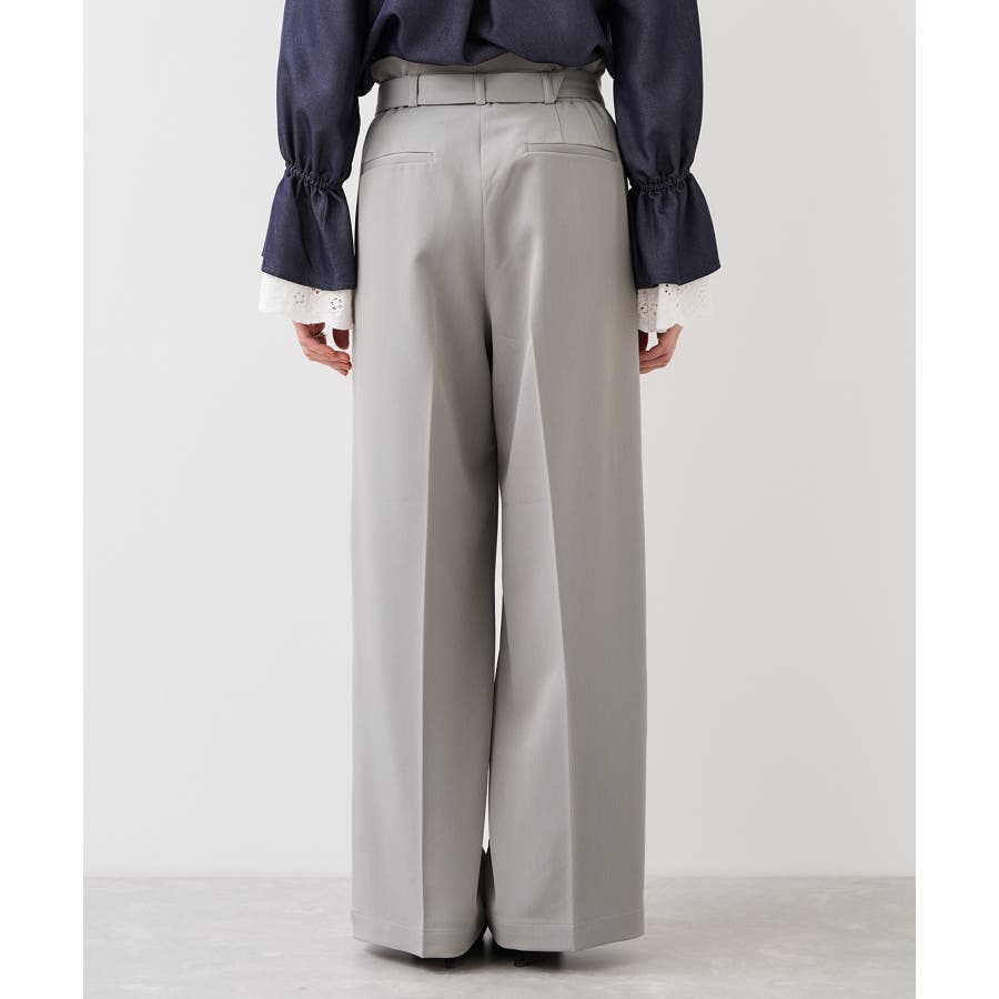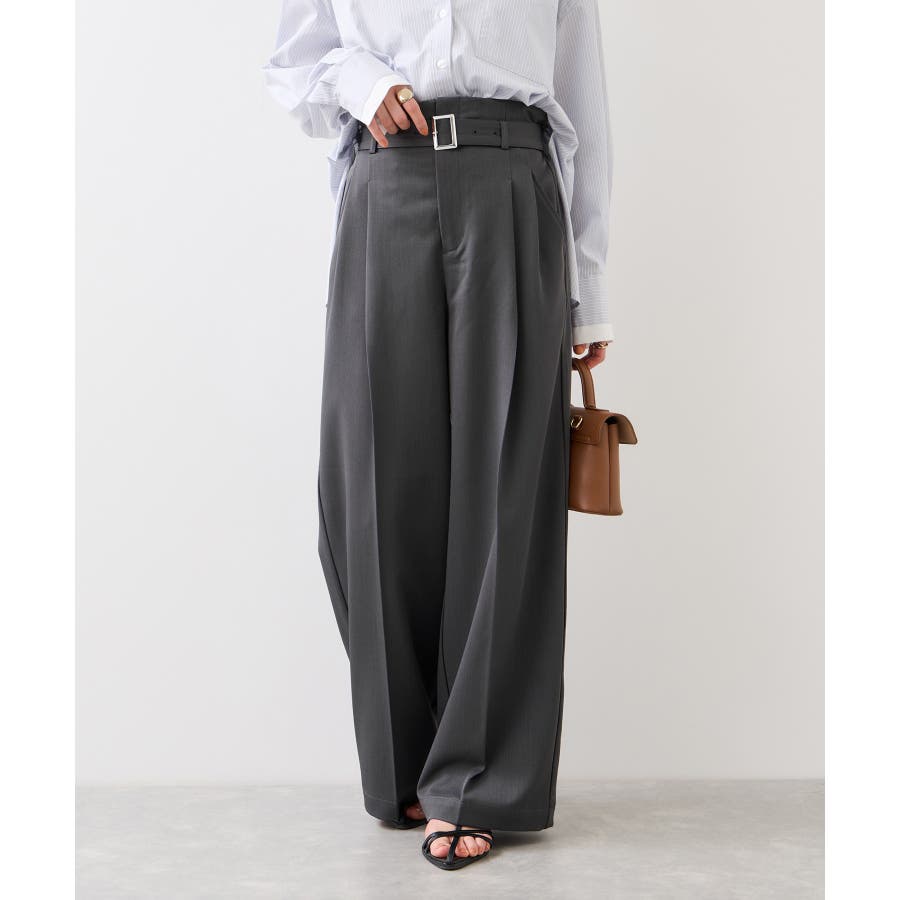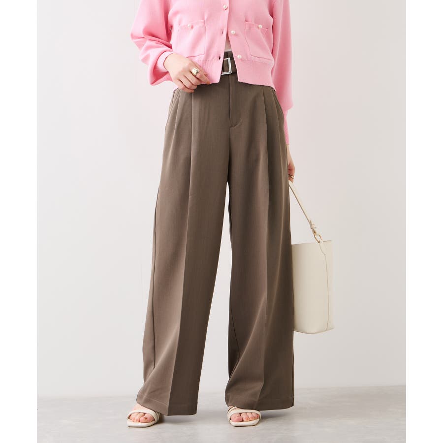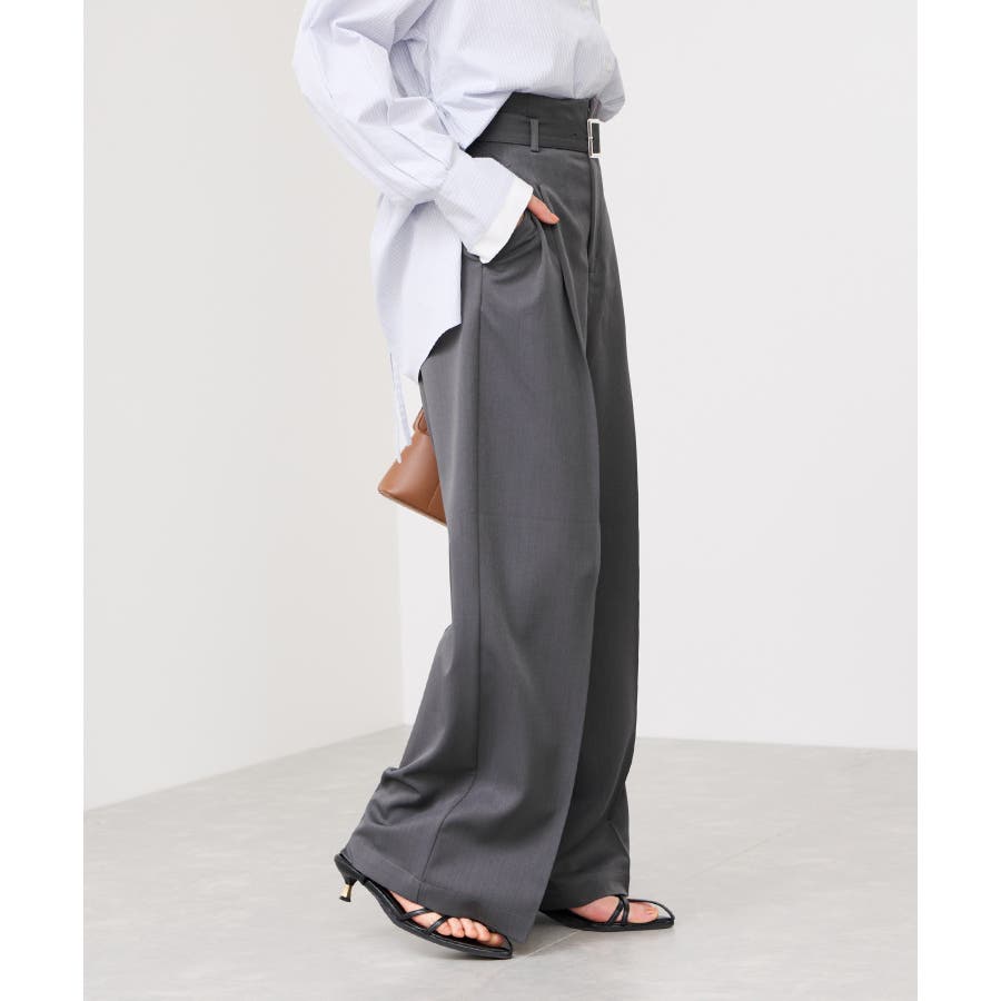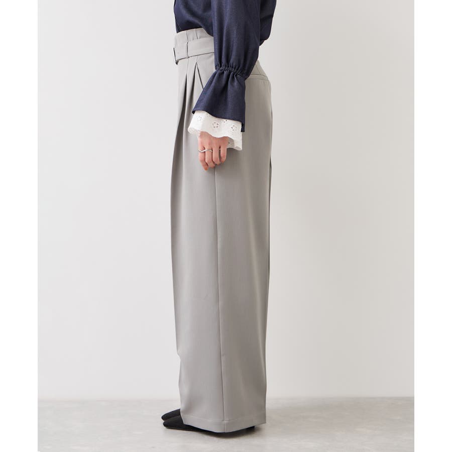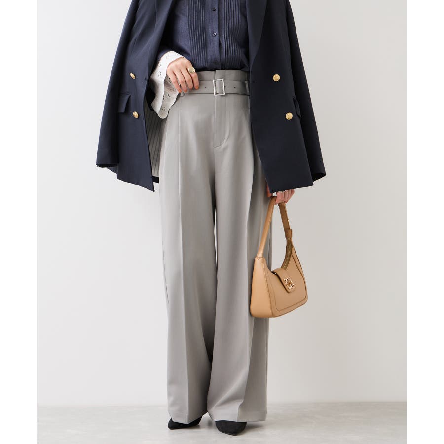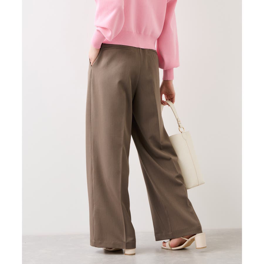 トップスをウエストインした時も決まりやすく、ジャケットシーンのあわせとしても大活躍。裾はそこまで広くないワイドシルエットなので、着用シーンも幅広いです。共地のベルト付きできちんと感もあり、ウエスト部分は後ろのサイドにゴムが入りスッキリ感と着心地を両立。