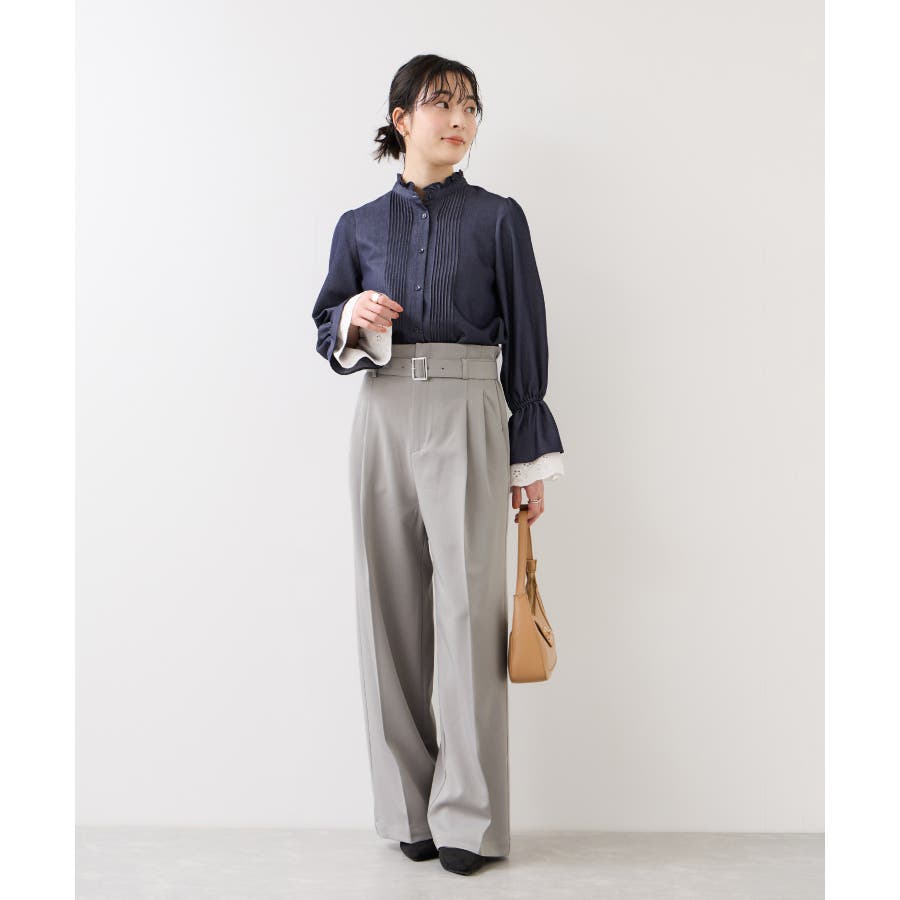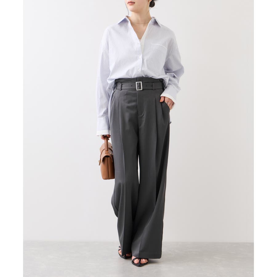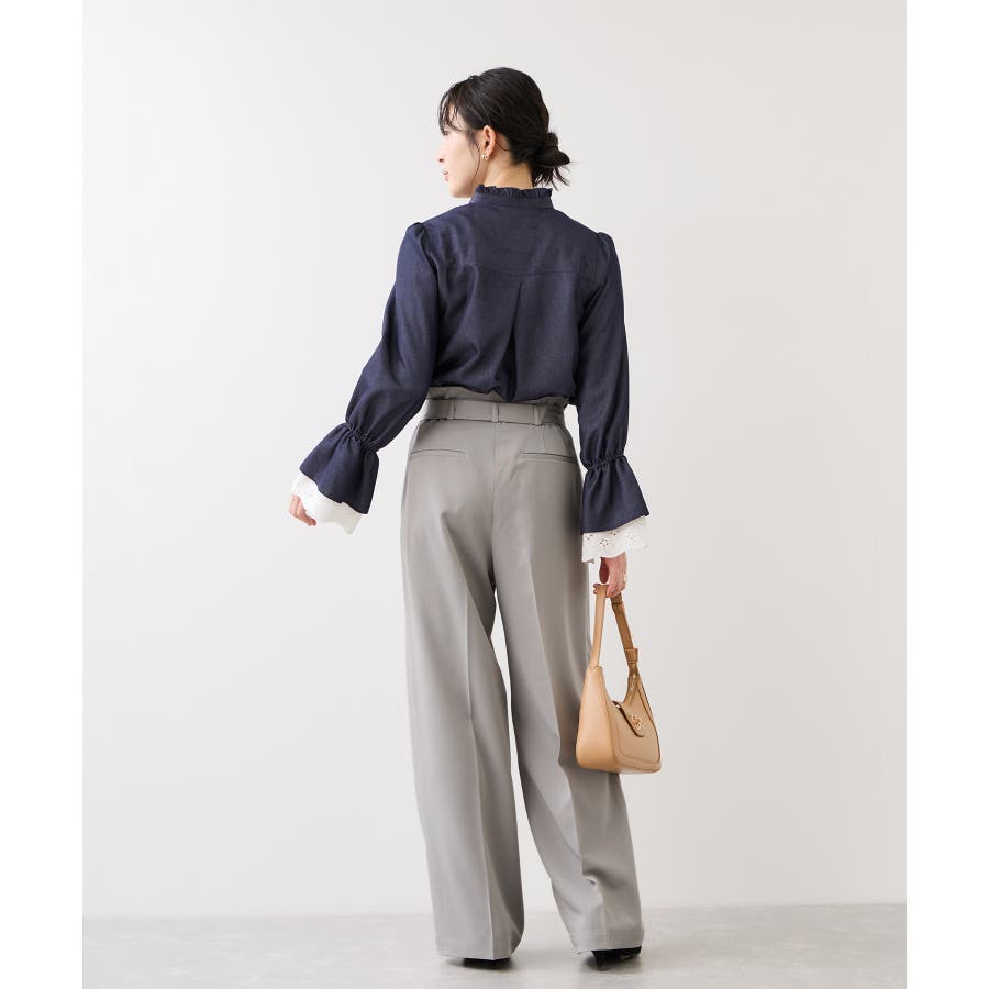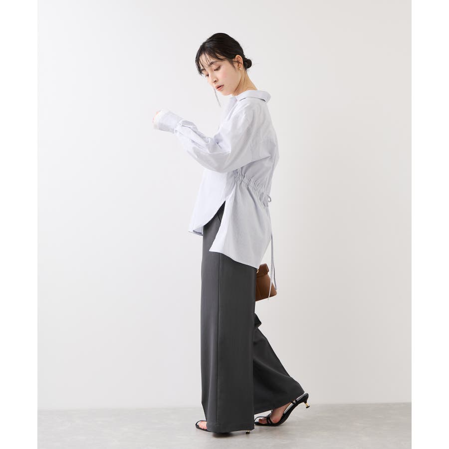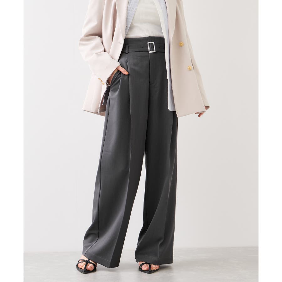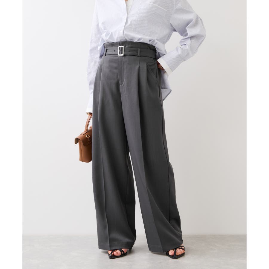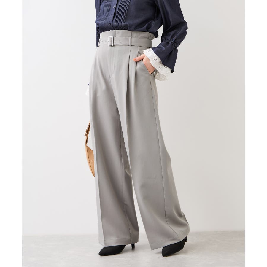 トップスをウエストインした時も決まりやすく、ジャケットシーンのあわせとしても大活躍。裾はそこまで広くないワイドシルエットなので、着用シーンも幅広いです。共地のベルト付きできちんと感もあり、ウエスト部分は後ろのサイドにゴムが入りスッキリ感と着心地を両立。