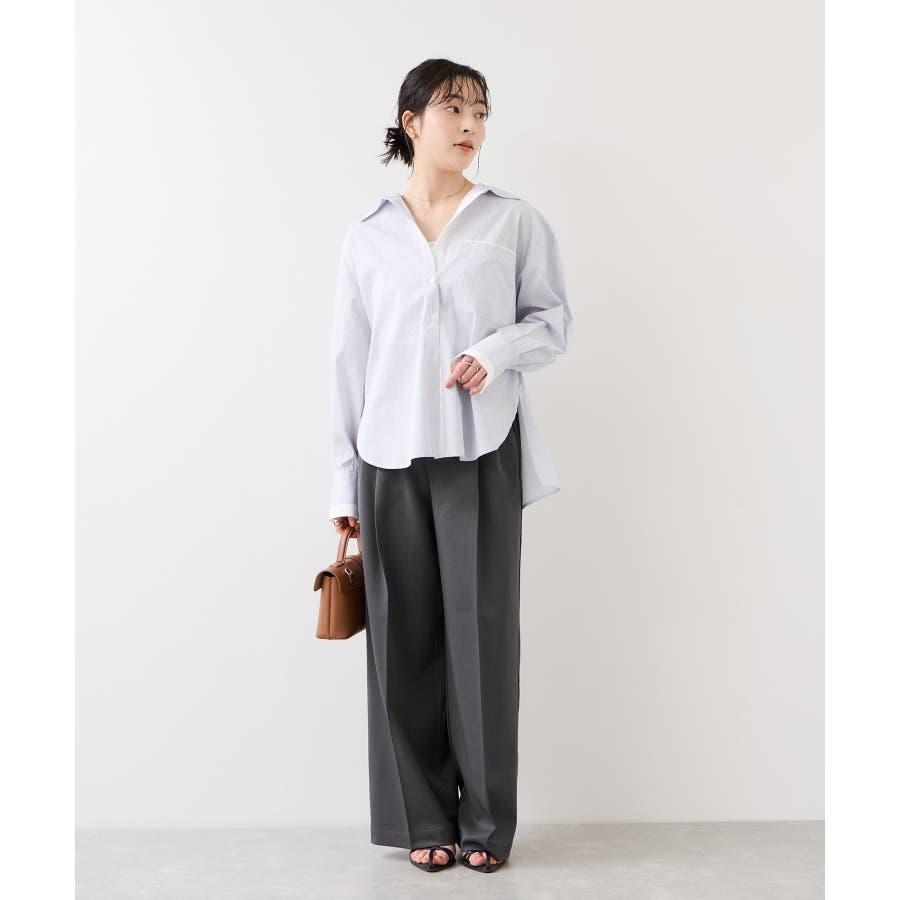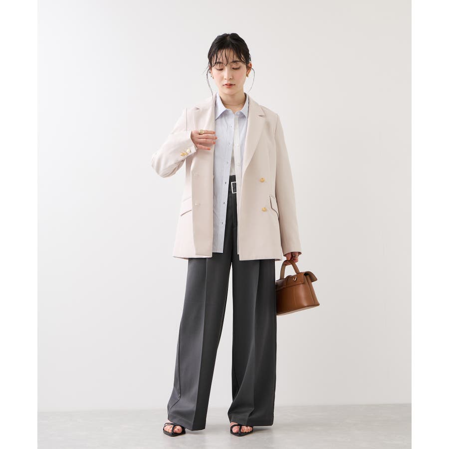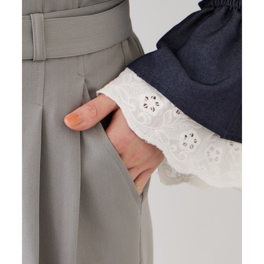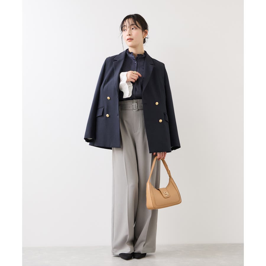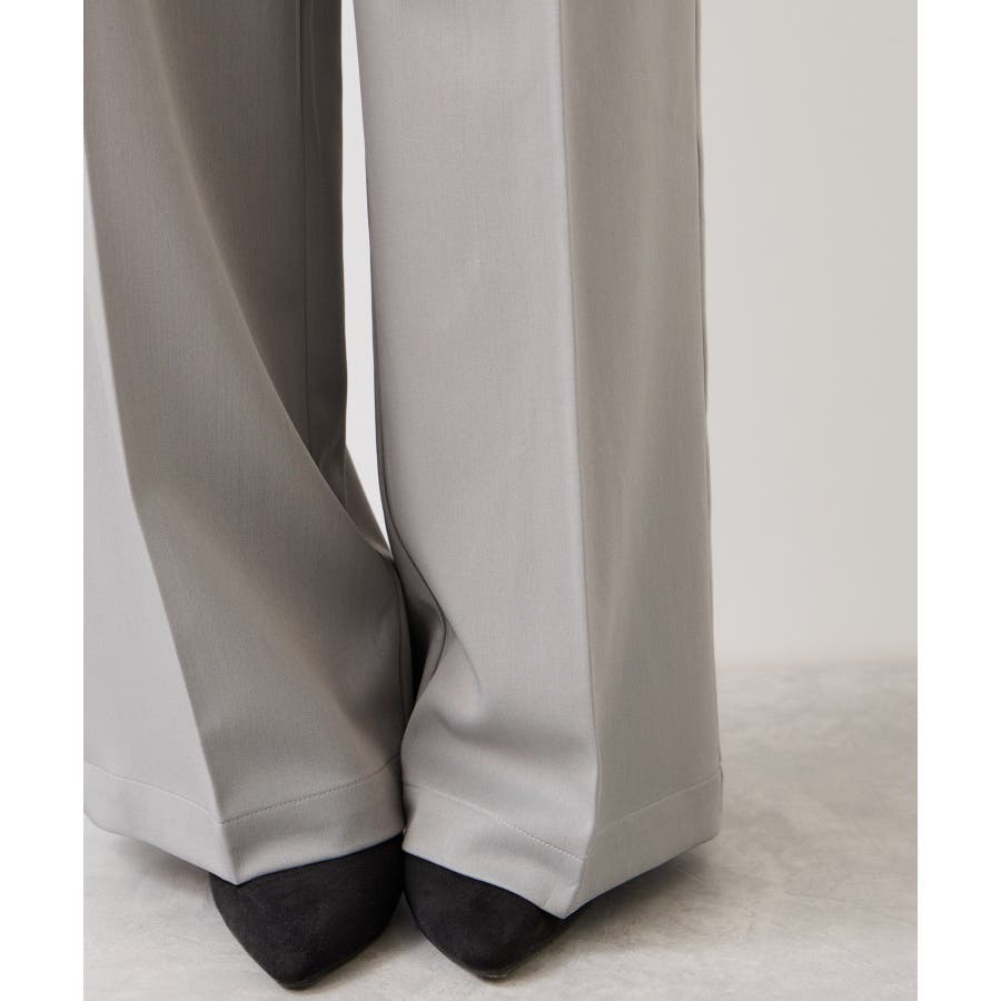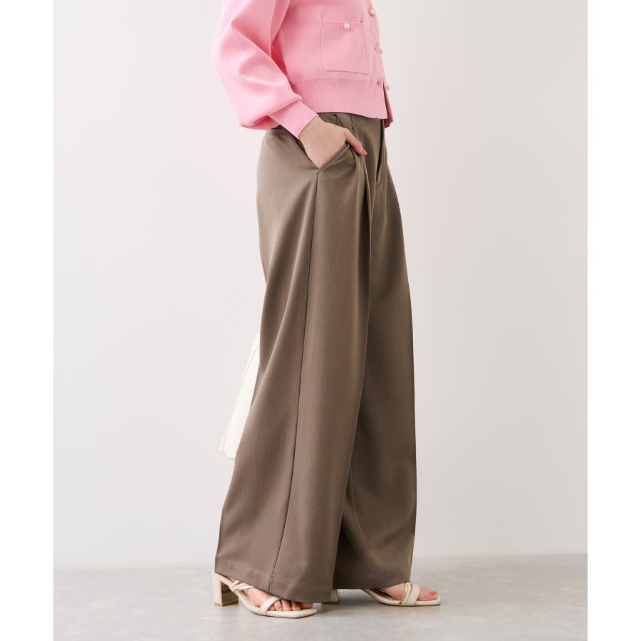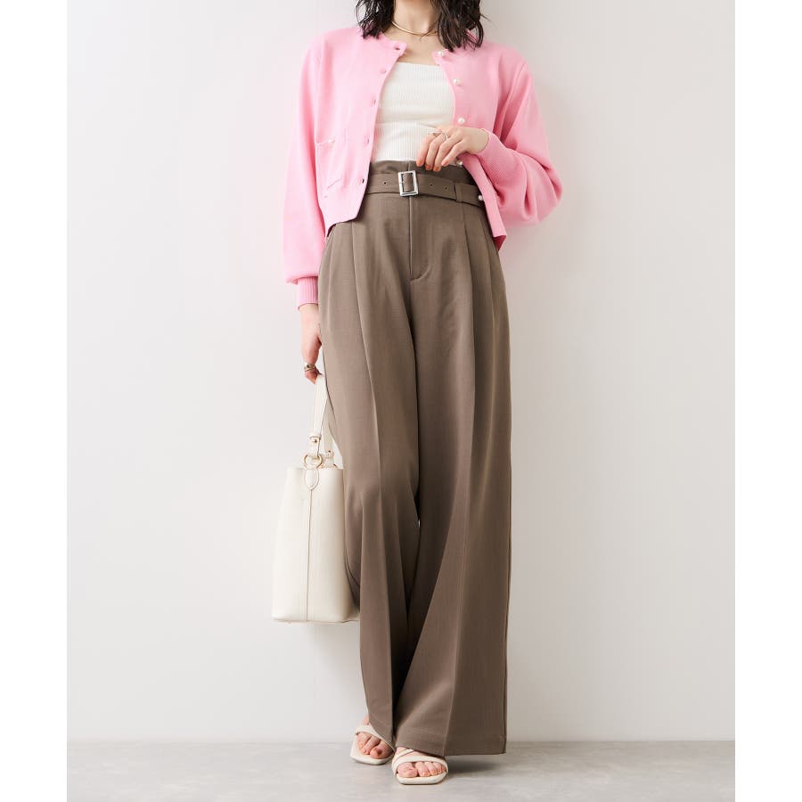 トップスをウエストインした時も決まりやすく、ジャケットシーンのあわせとしても大活躍。裾はそこまで広くないワイドシルエットなので、着用シーンも幅広いです。共地のベルト付きできちんと感もあり、ウエスト部分は後ろのサイドにゴムが入りスッキリ感と着心地を両立。