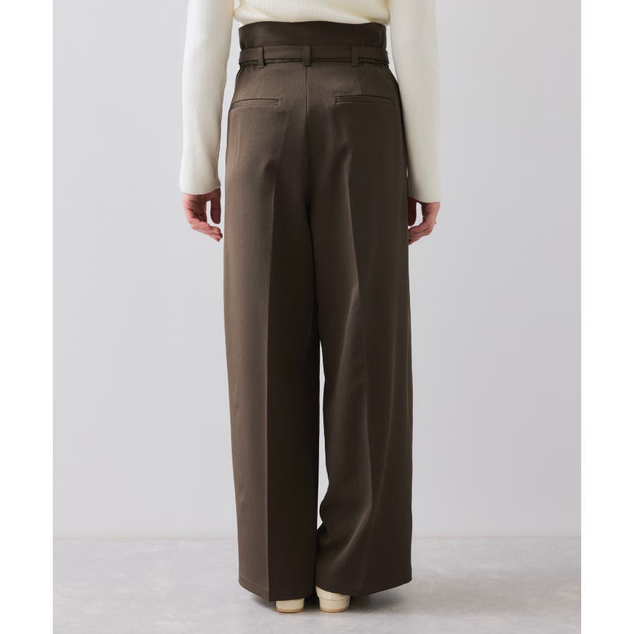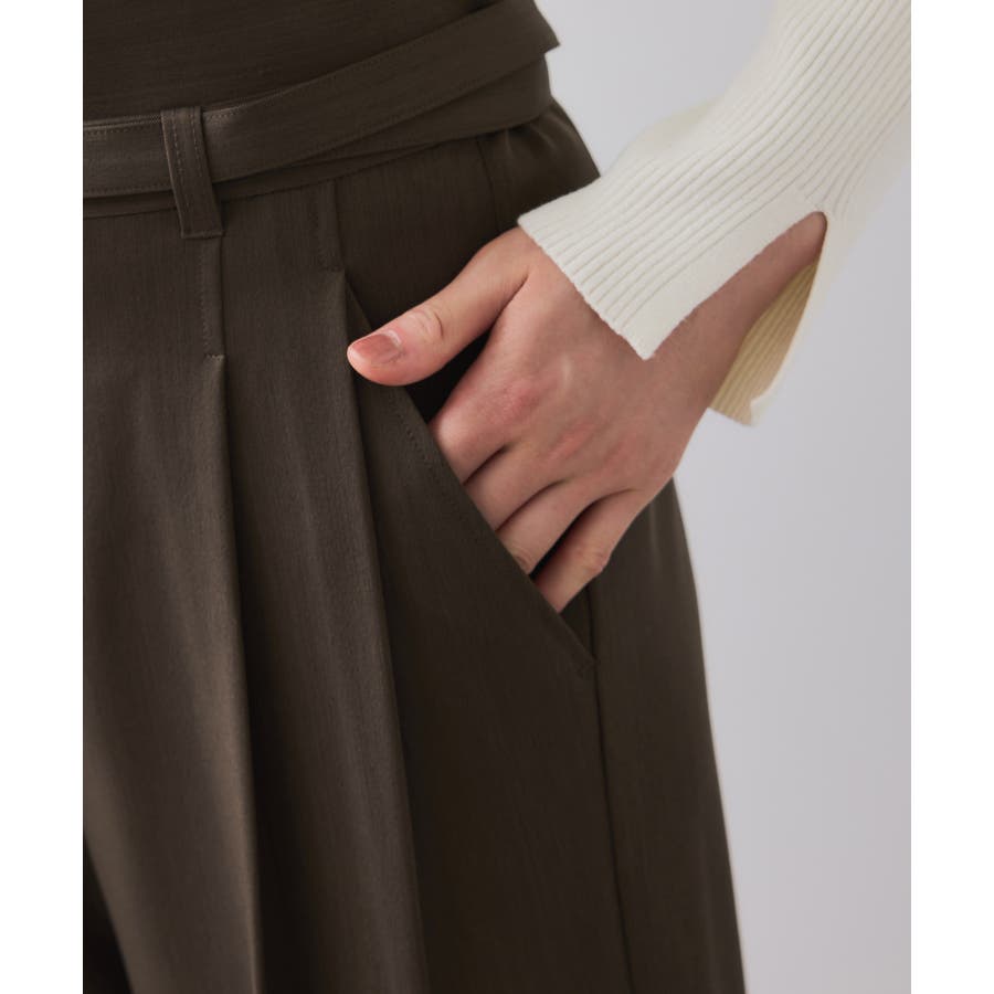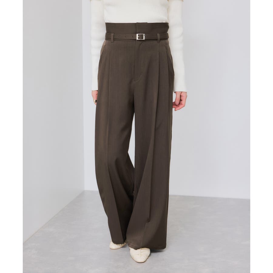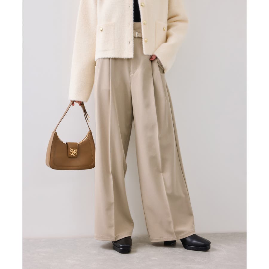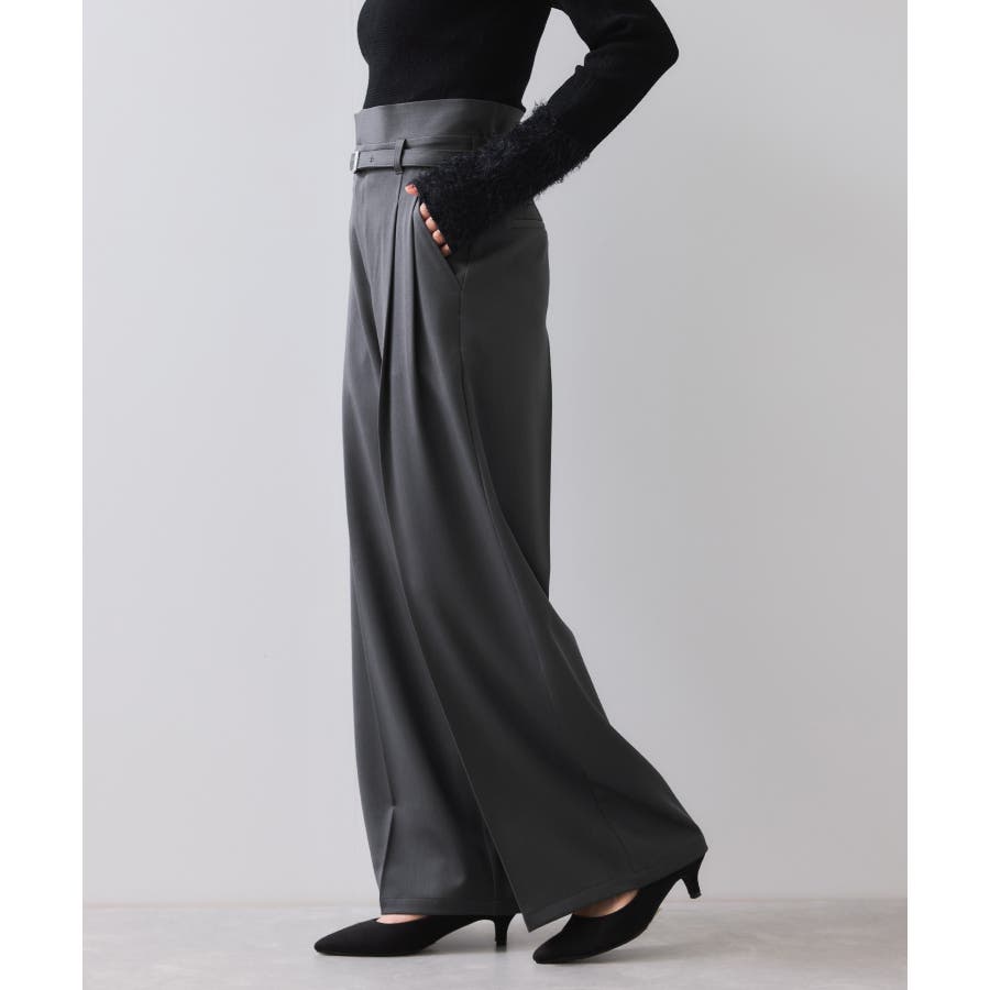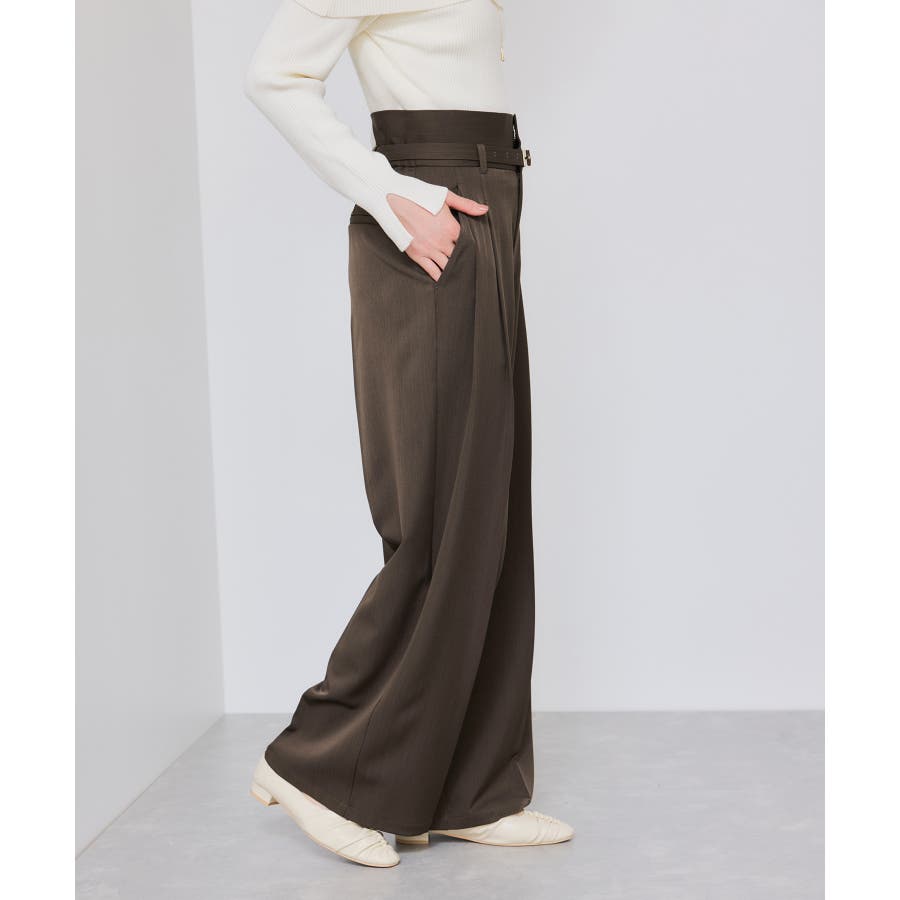 トップスをウエストインした時も決まりやすく、ジャケットシーンのあわせとしても大活躍。裾はそこまで広くないワイドシルエットなので、着用シーンも幅広いです。共地のベルト付きできちんと感もあり、ウエスト部分は後ろのサイドにゴムが入りスッキリ感と着心地を両立。