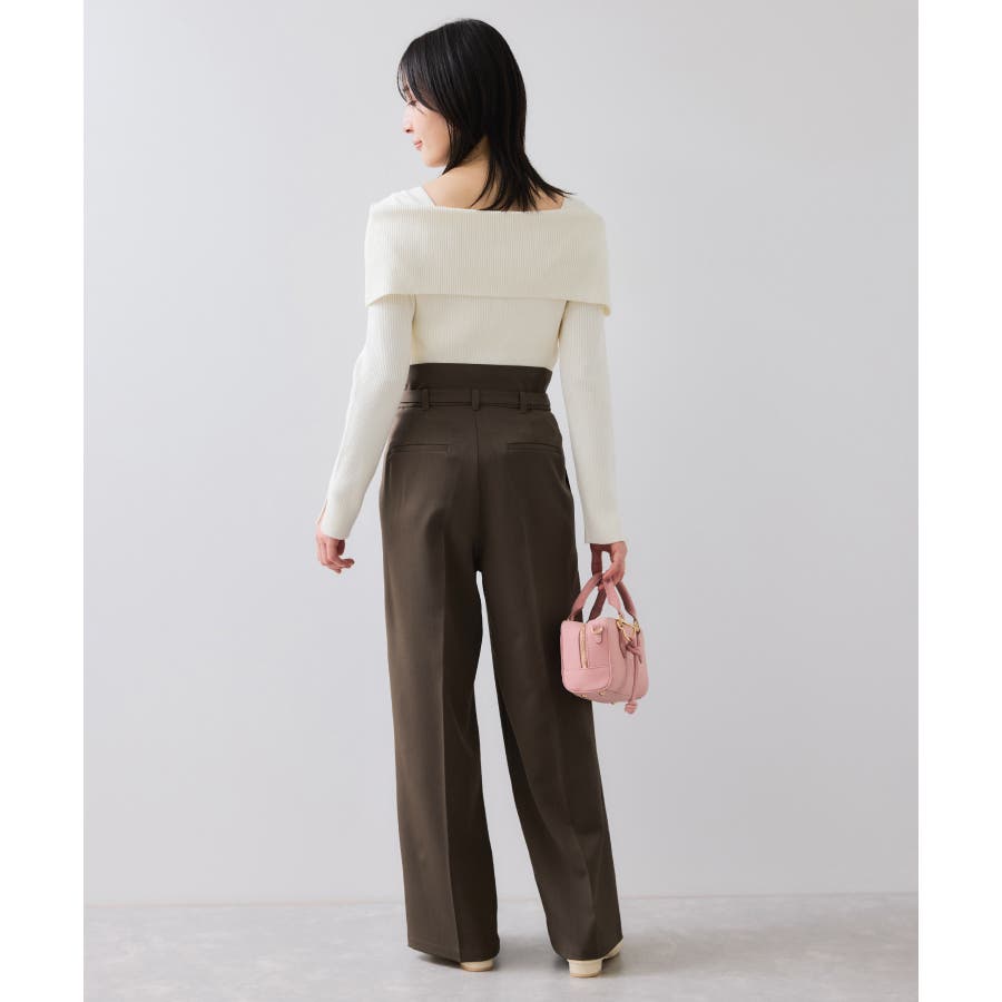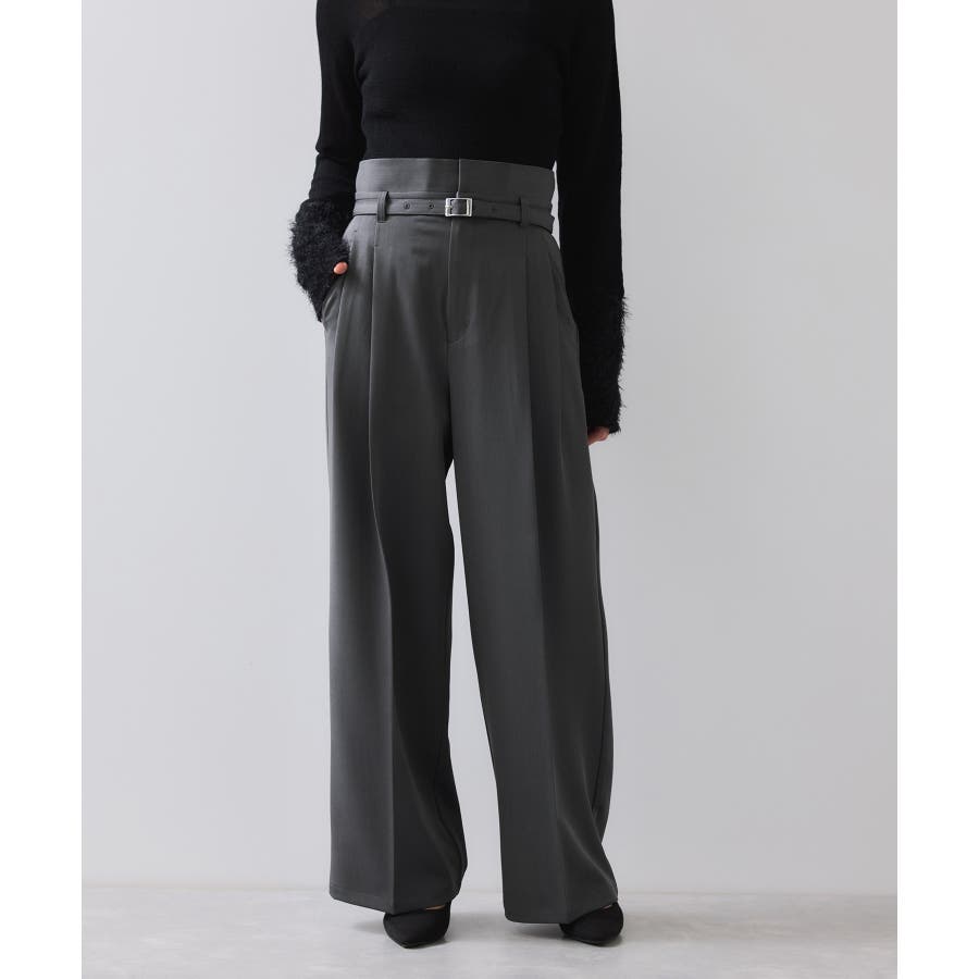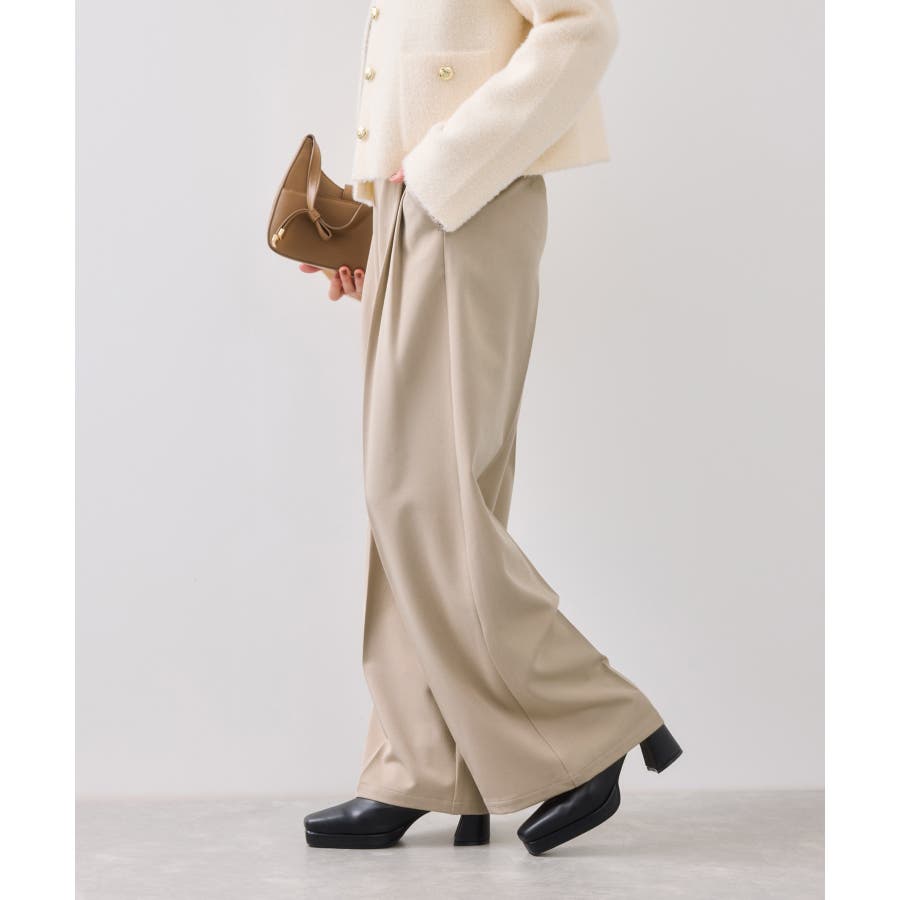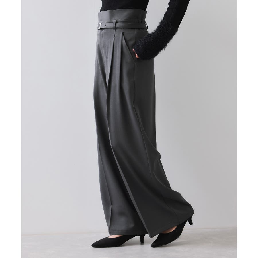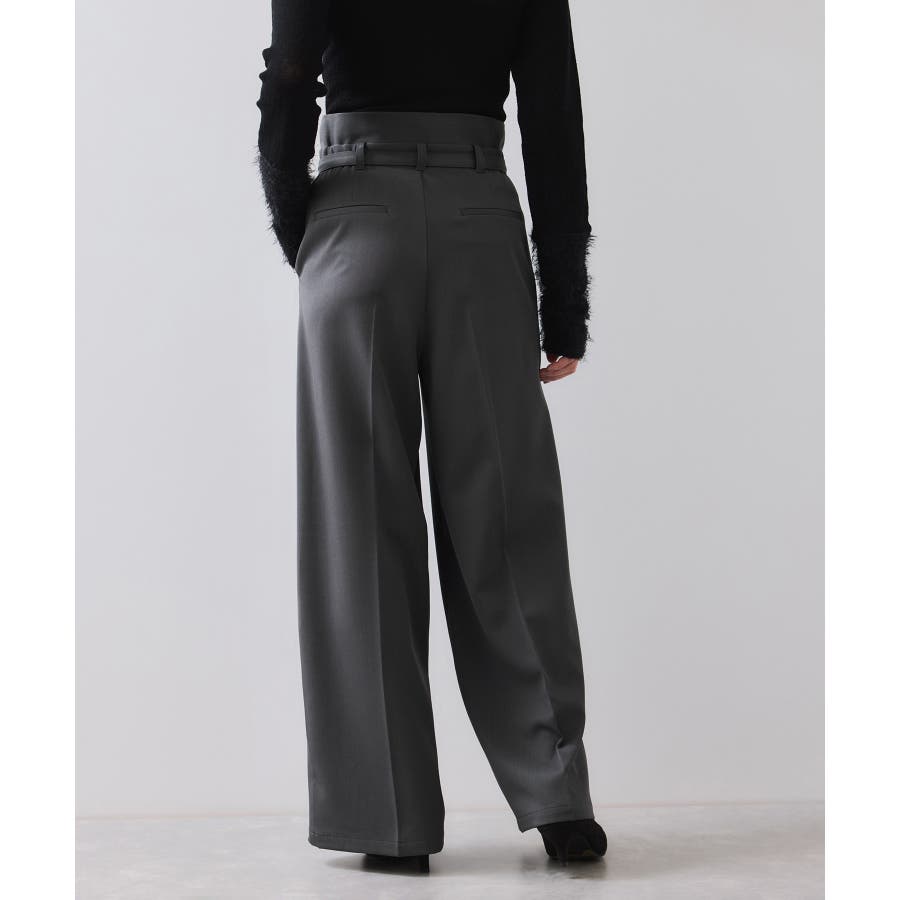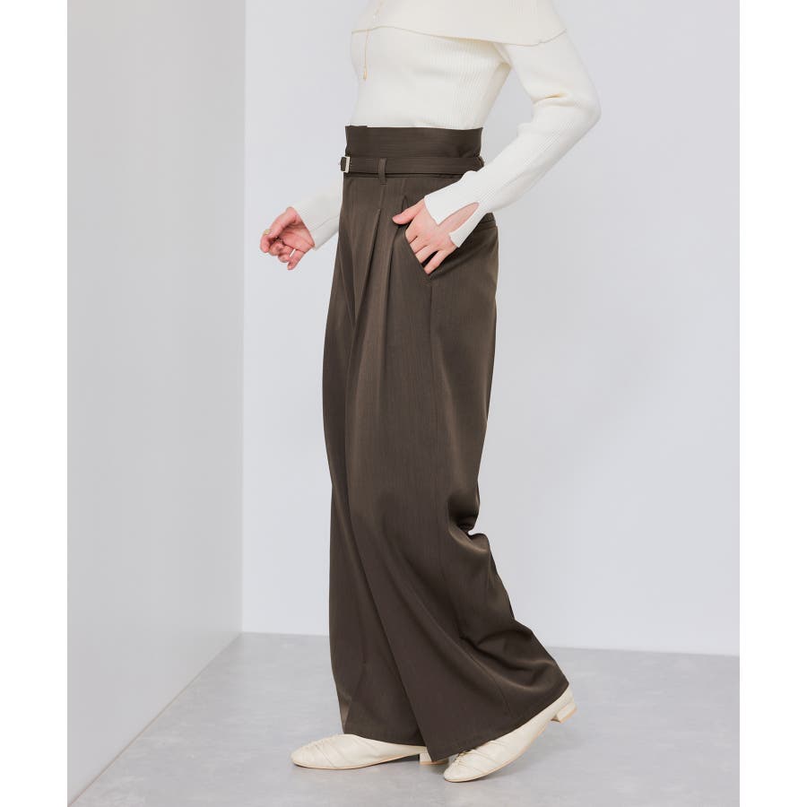 トップスをウエストインした時も決まりやすく、ジャケットシーンのあわせとしても大活躍。裾はそこまで広くないワイドシルエットなので、着用シーンも幅広いです。共地のベルト付きできちんと感もあり、ウエスト部分は後ろのサイドにゴムが入りスッキリ感と着心地を両立。